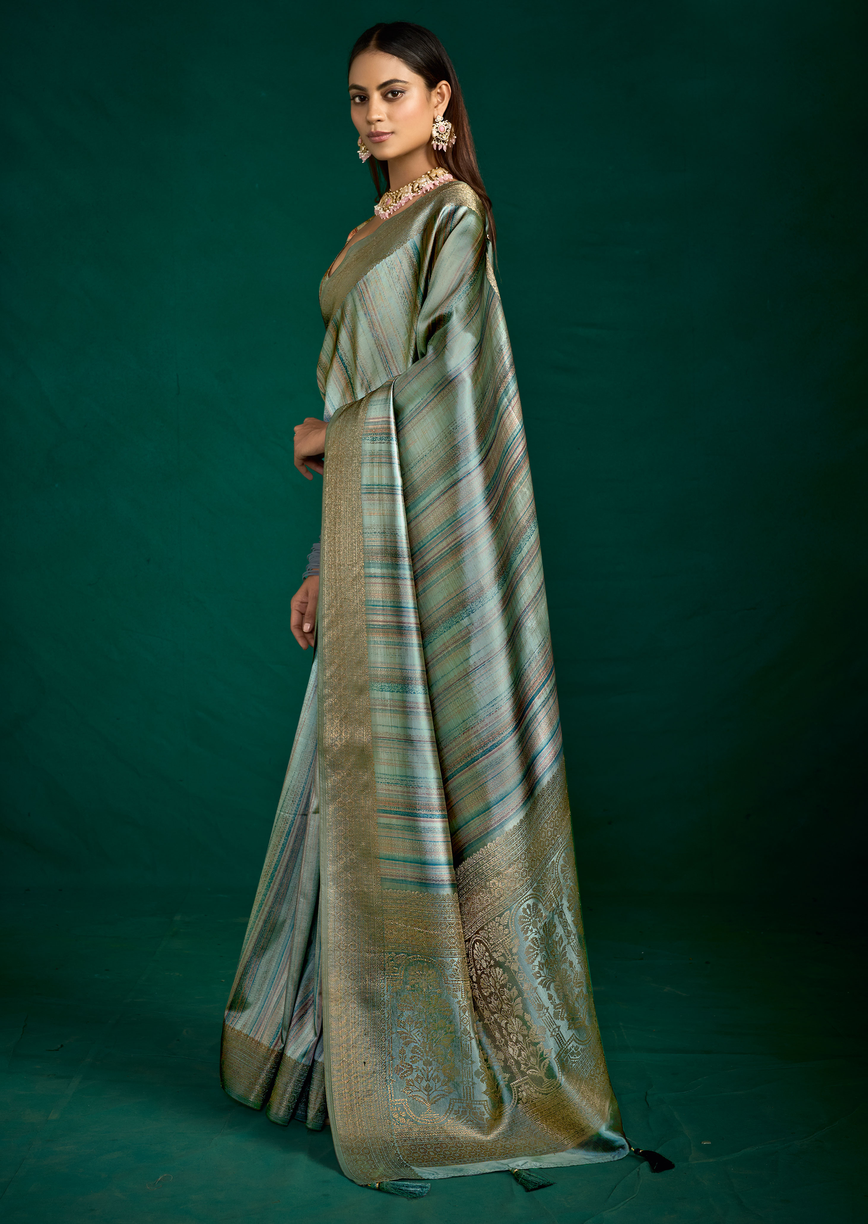Green Grey Color Beautiful Tussar Silk Fabric Sophisticated Woven Designer Saree