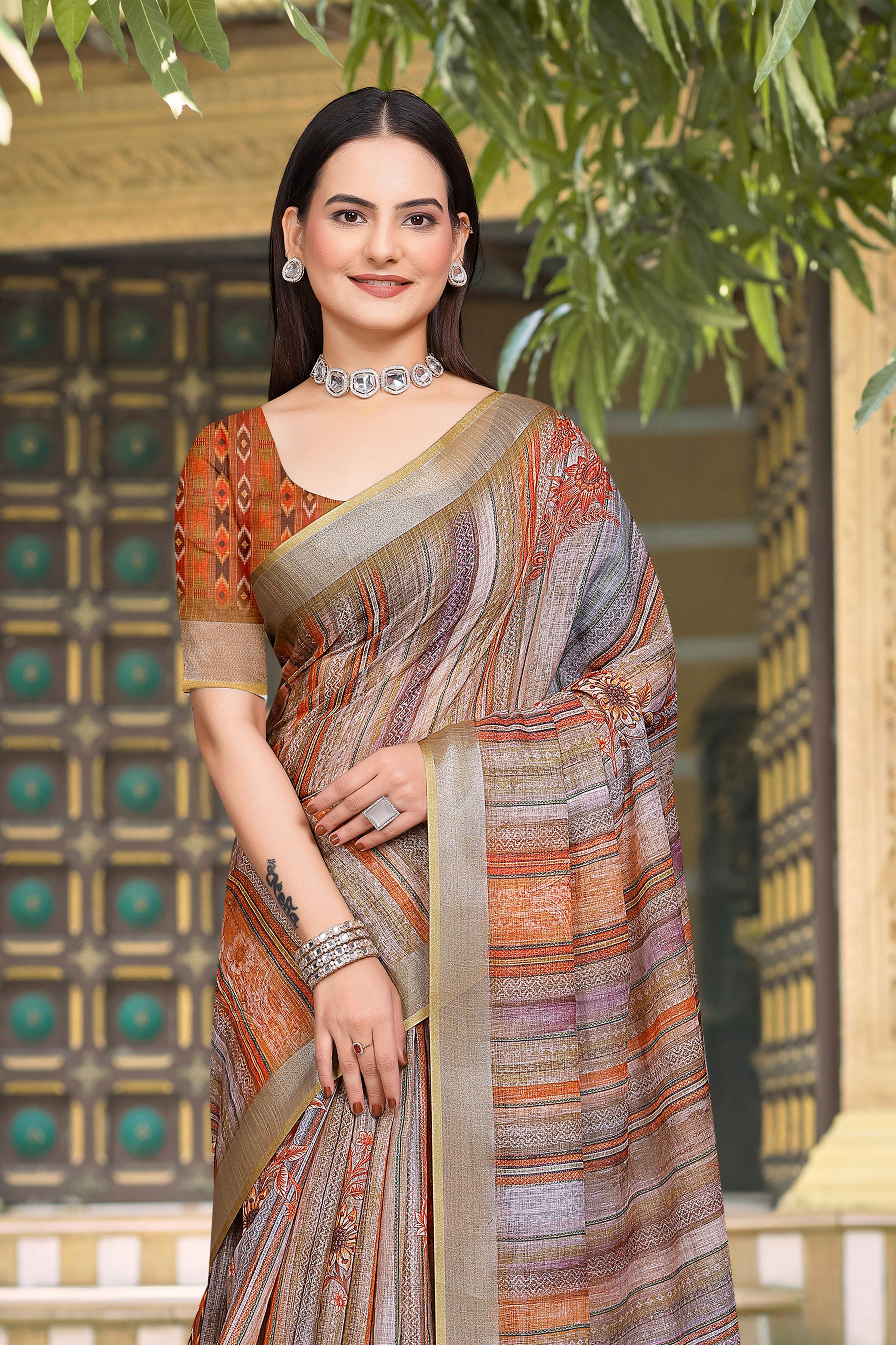 Look These Festive Saree in Fine Colored.These Saree Are Linen Cotton And Blouse is Fabricated On Linen Cotton Pair.Its Beautified With Woven Jari Border With Designer Digital Printed.