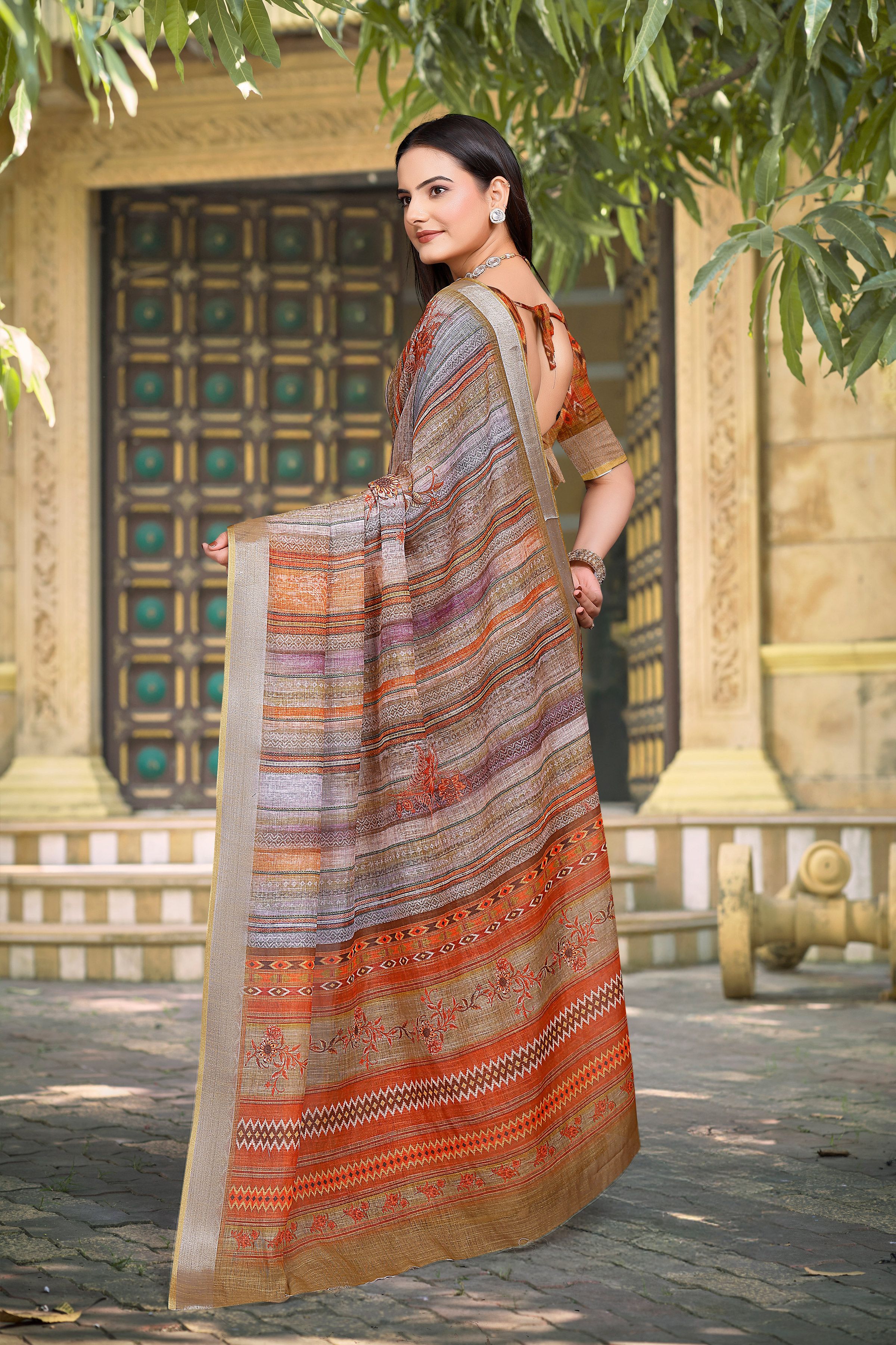 Grey Color Linen Cotton Fabric Woven Border Designer Printed Saree
