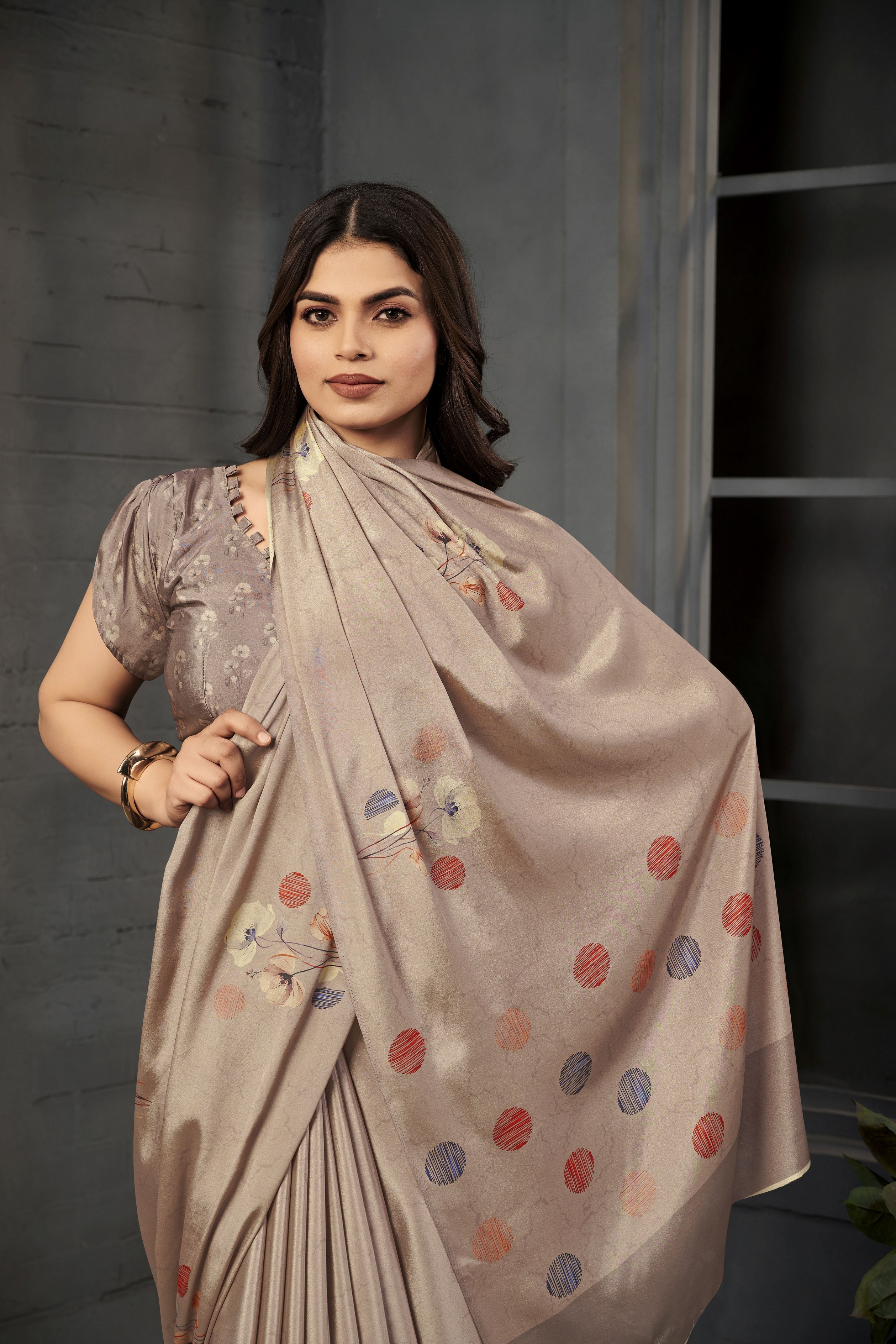 Grey Color Malai Crepe Silk Fabric Designer Digital Printed Beautiful Fancy Partywear Saree