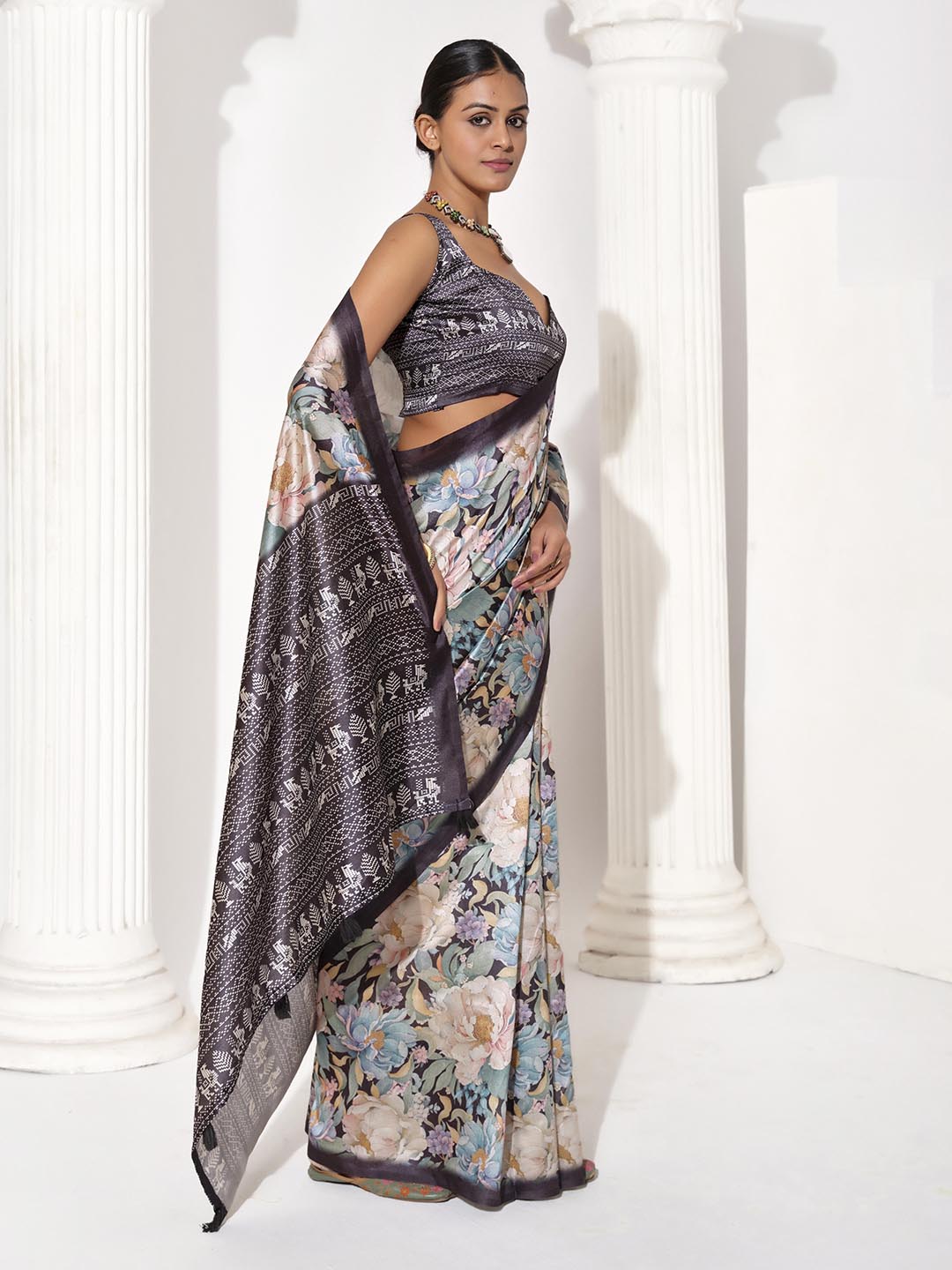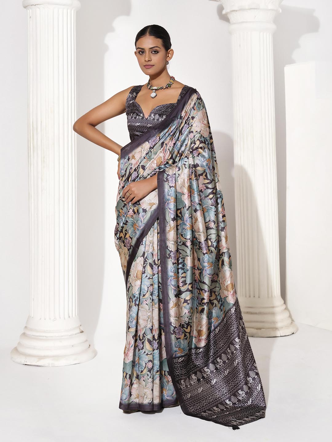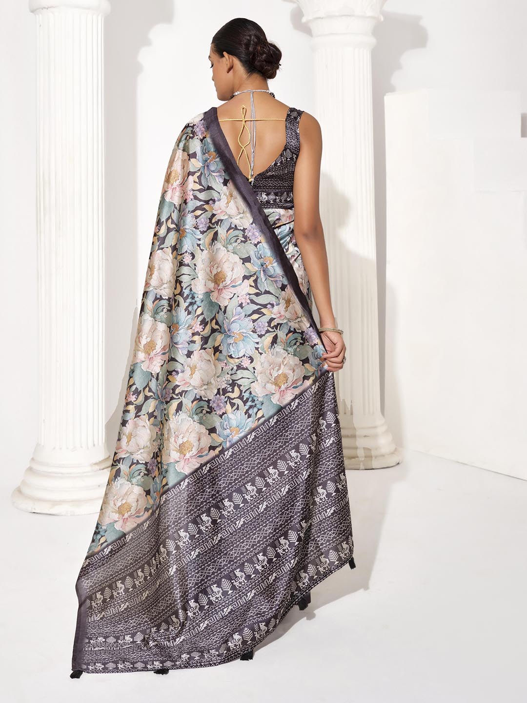 Grey Color Silk Blend Fabric Beautiful Designer Printed Saree