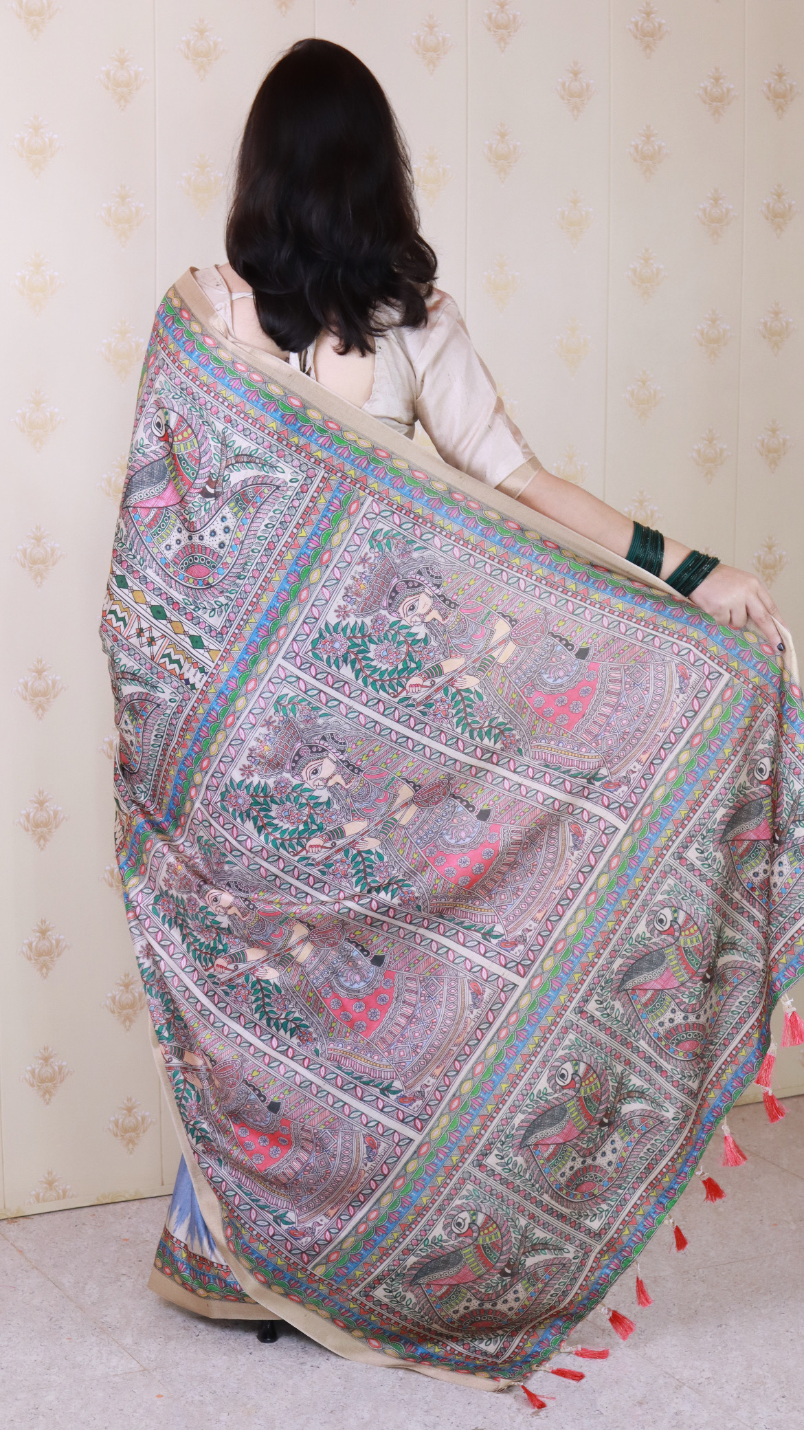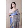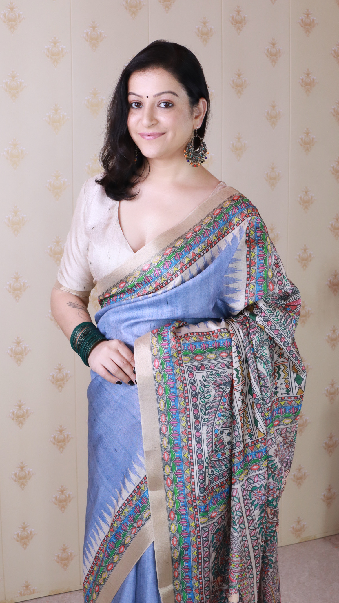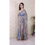 Grey Color Woven Jari Border Designer Madhubani Digital Printed Ethnic Tussar Silk Saree