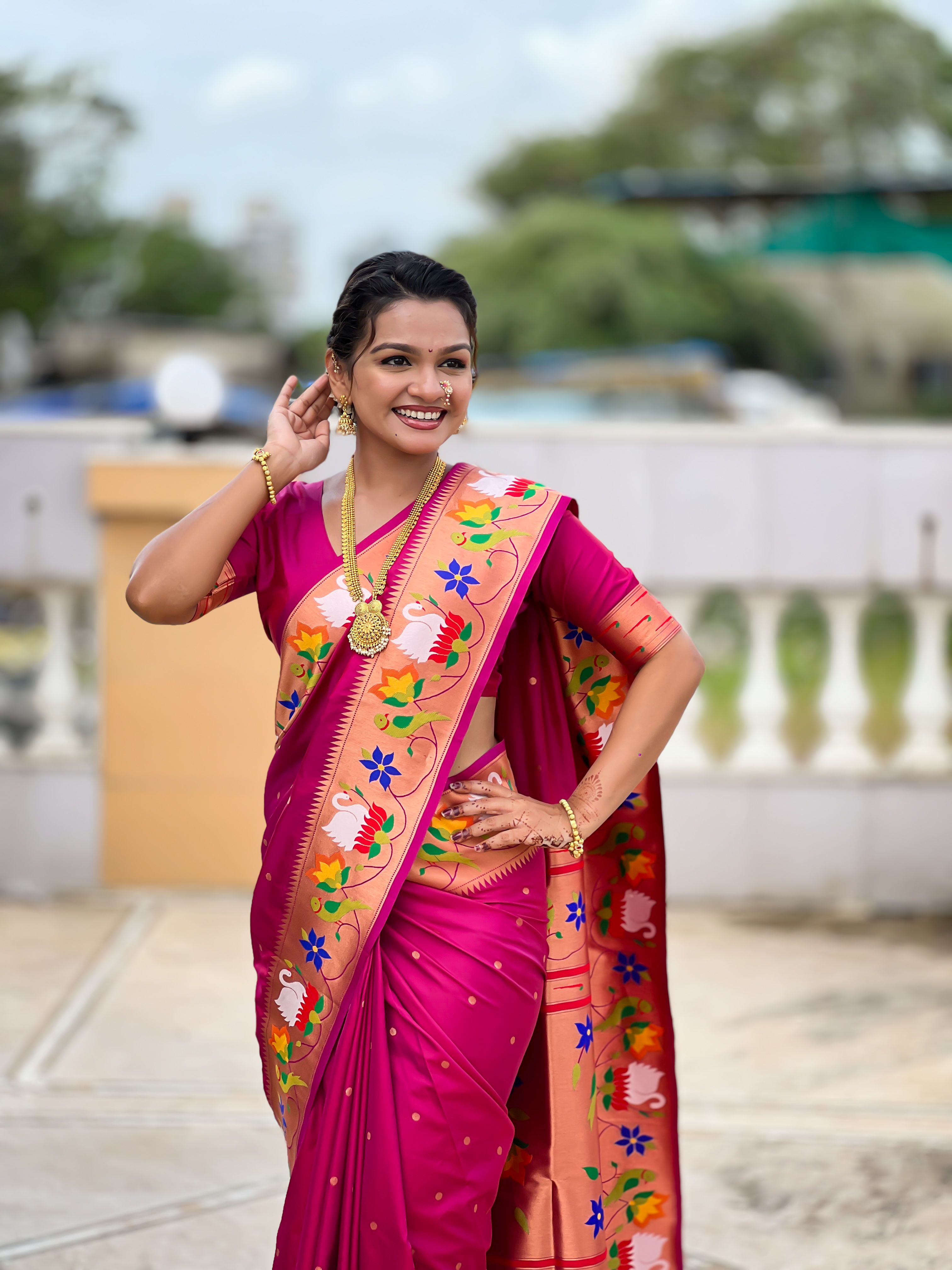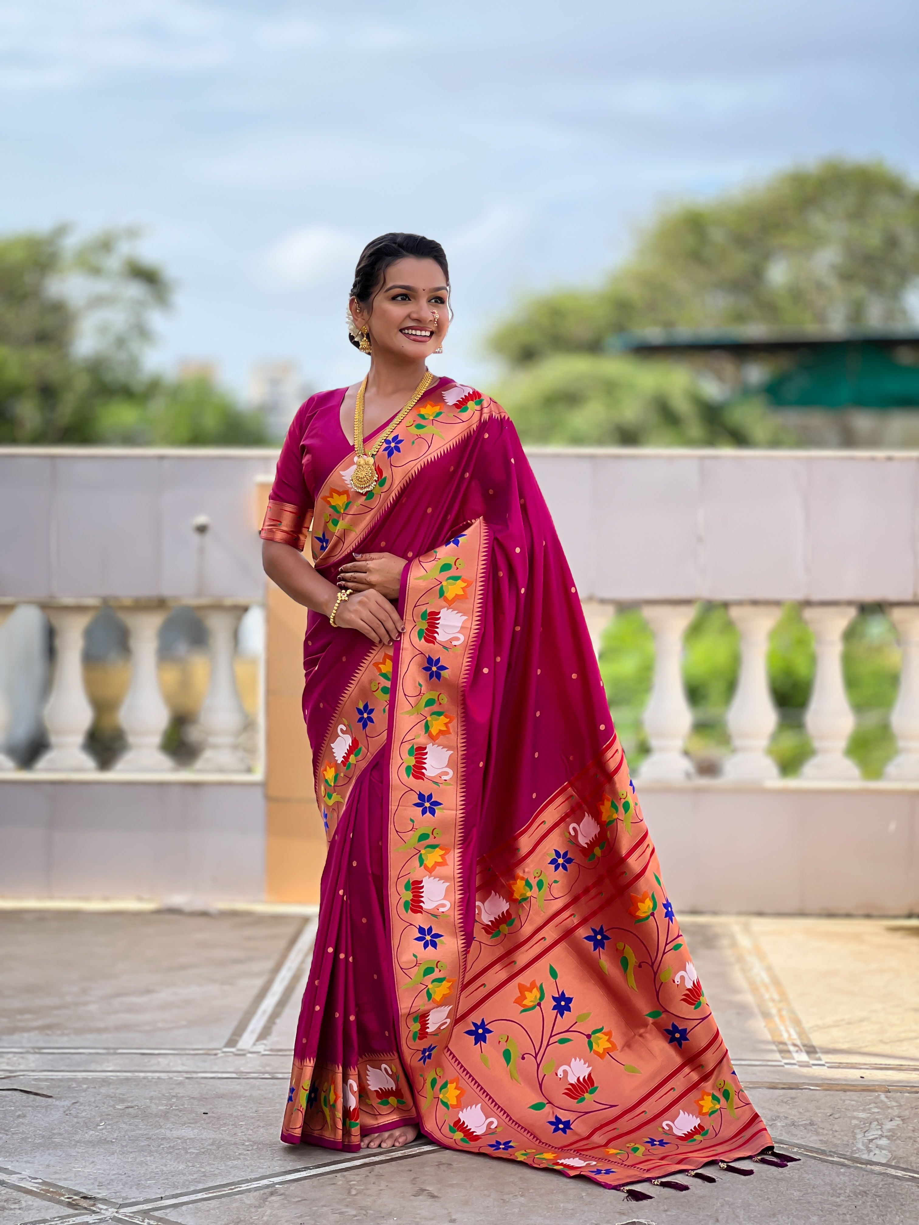 Magenta Color Paithani Silk Woven Meenakari Jacquard Designer Heavy Wedding Special Saree