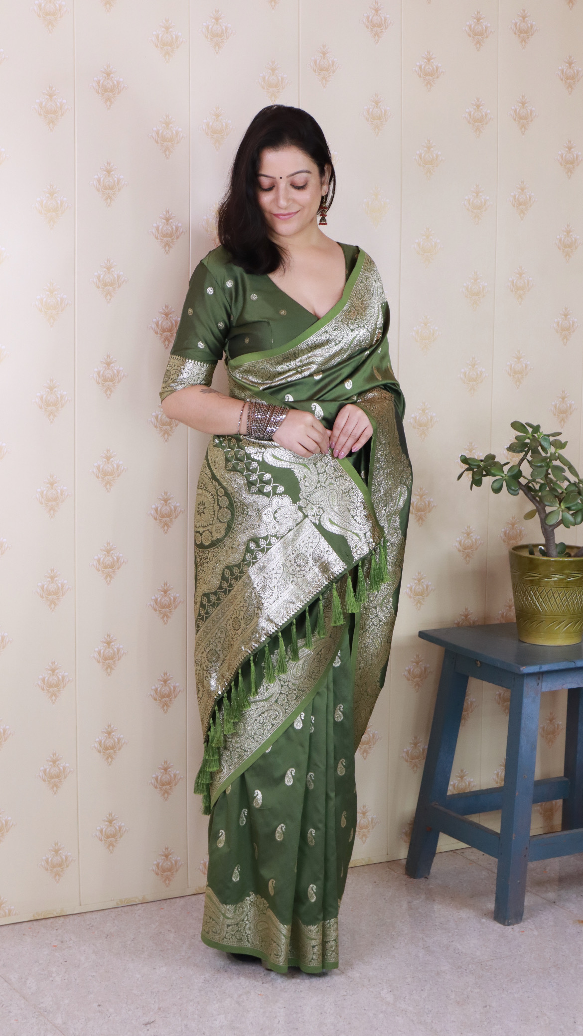 Mahendi Color Banarasi Silk Saree Woven Silver Jari Designer Ceremonial Partywear Saree