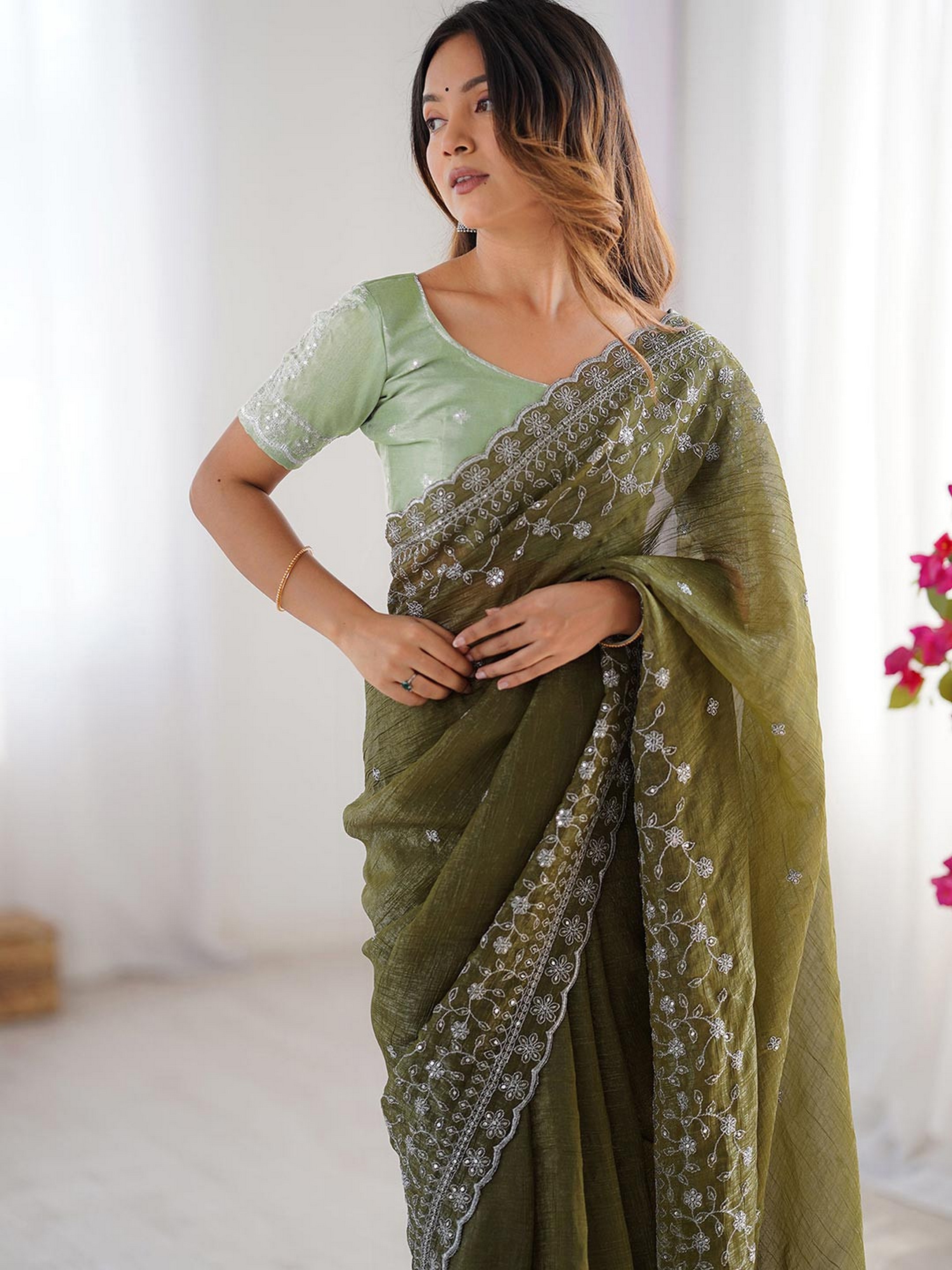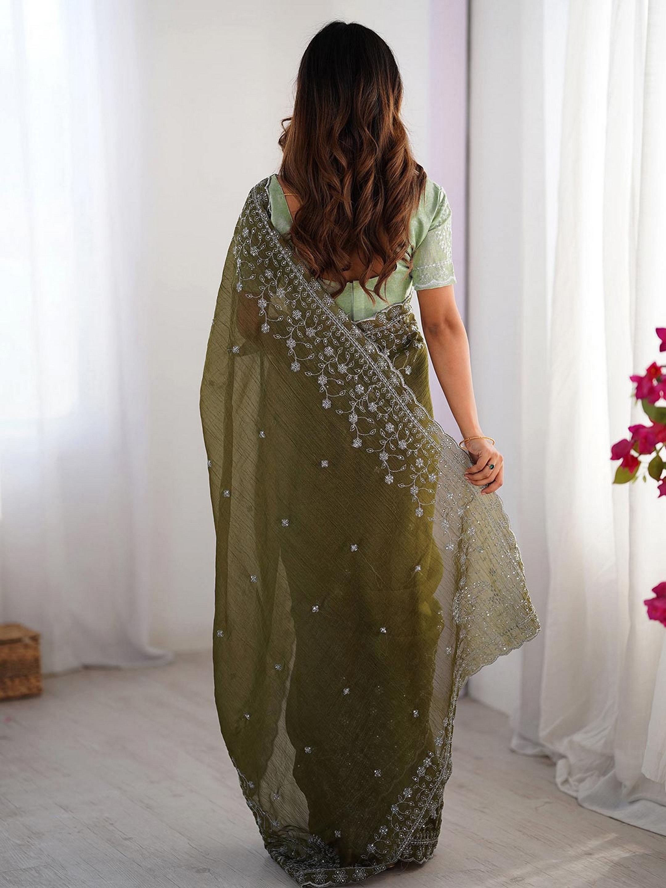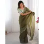 Mahendi Color Crunchy Silk Fabric Embroidered Partywear Saree