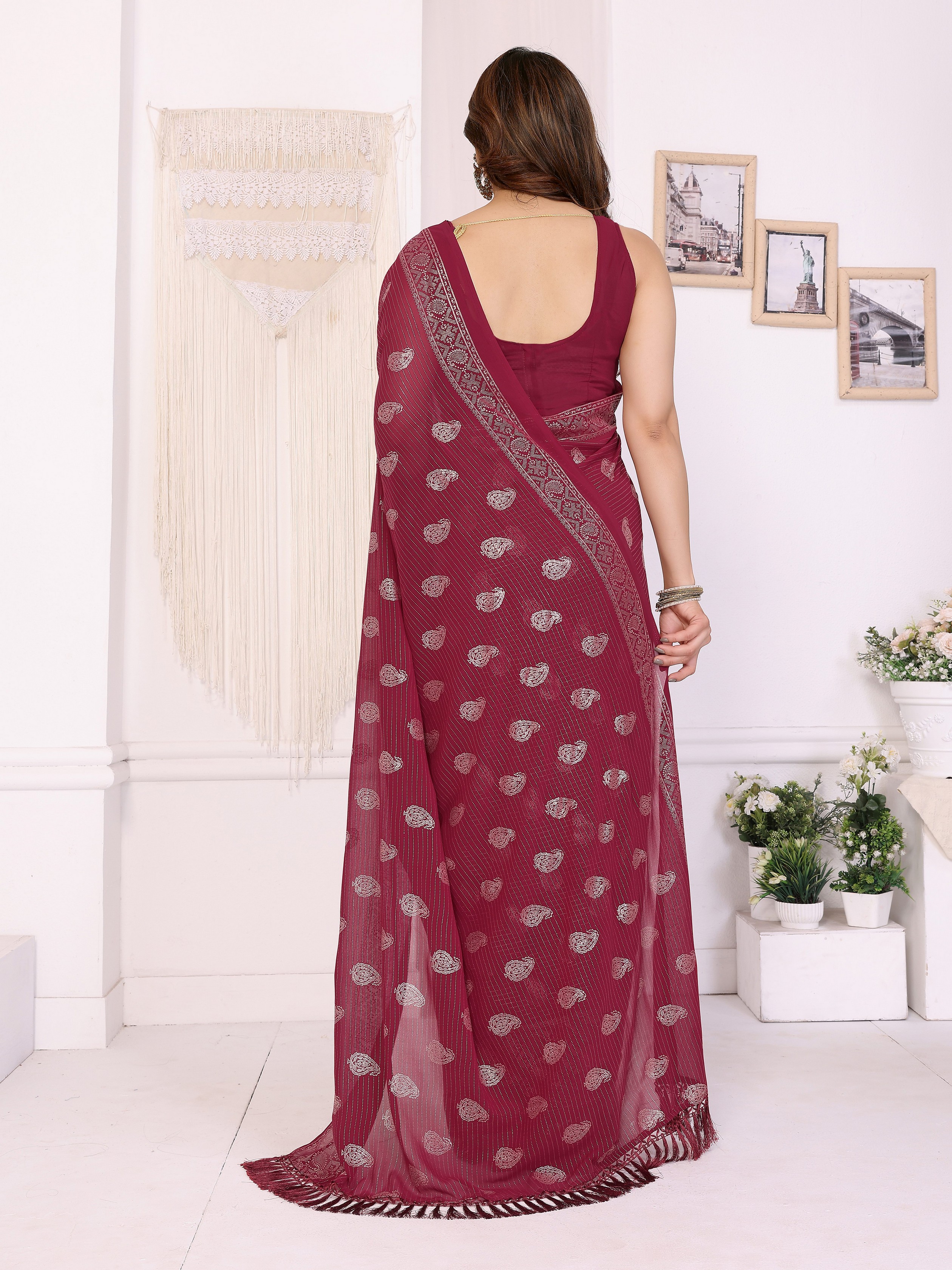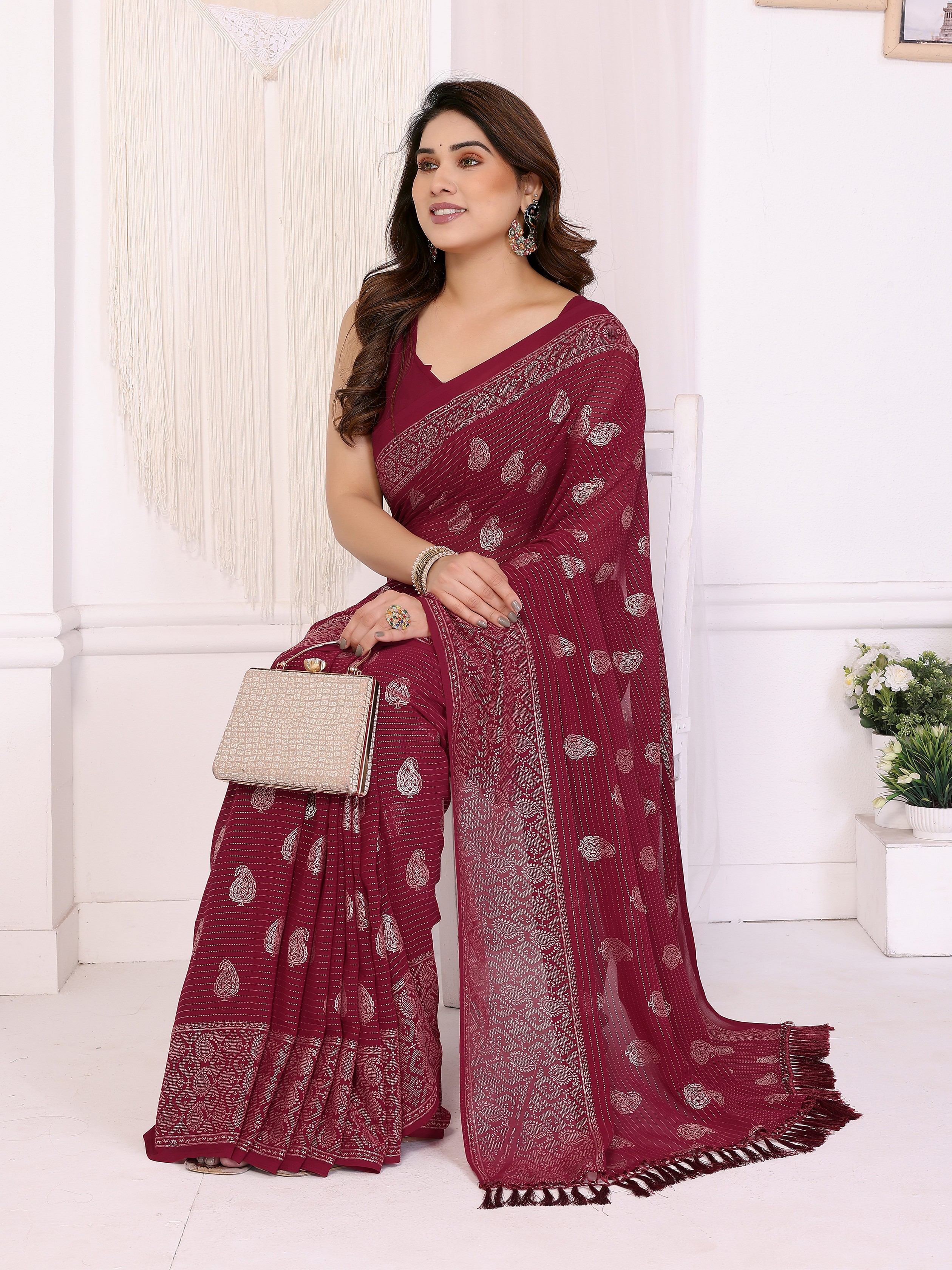 Maroon Color Georgette Fabric Designer Foil Printed Ceremonial Saree