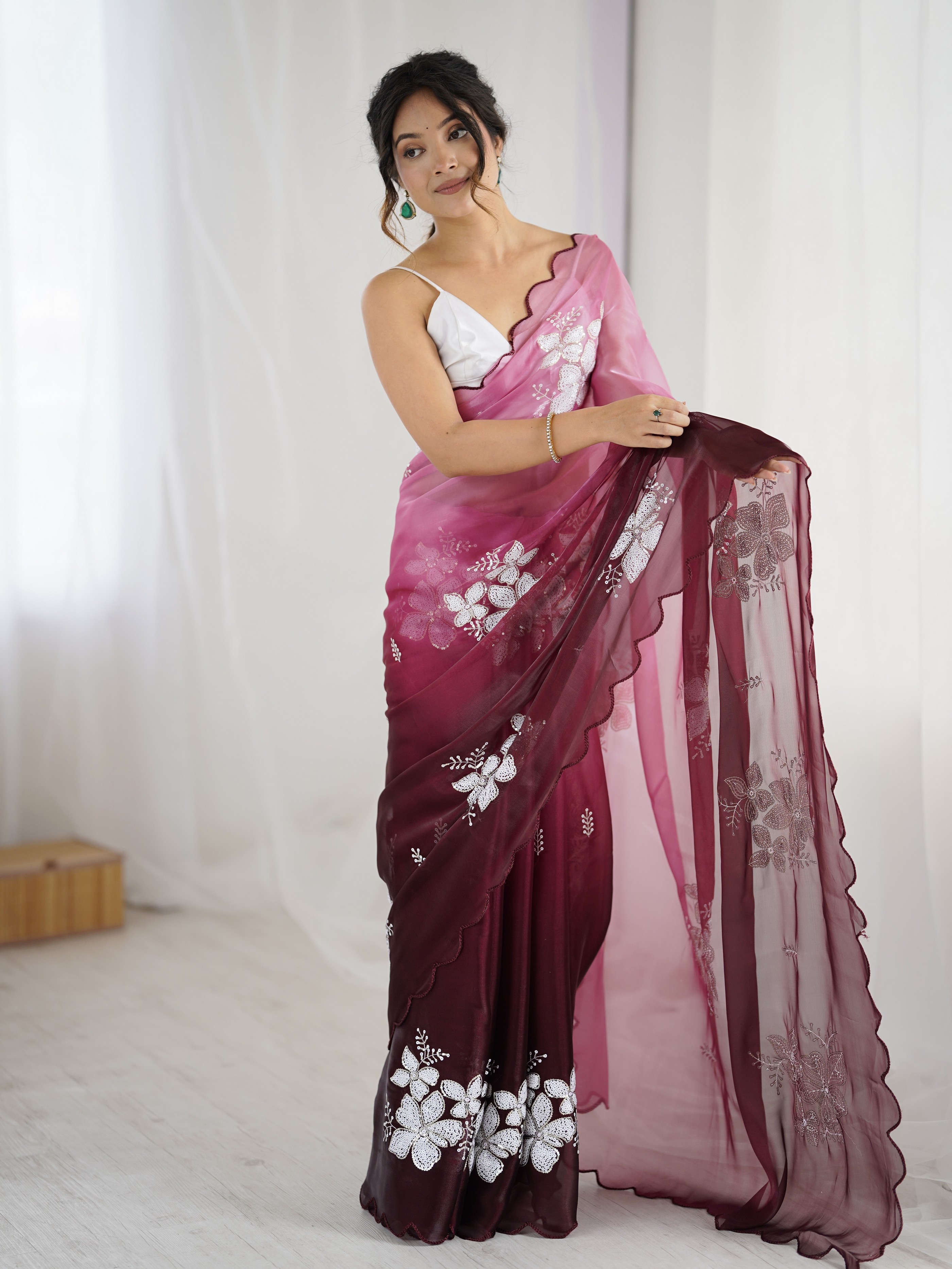 Garb These Party Wear Saree in Fine Dual Shaded Colored.These Saree Are Jimmy Choo And Blouse is Satin Silk Fabricated.Its Beautified With Pedding Color Printed With Designer Sequance Embroidery Work.