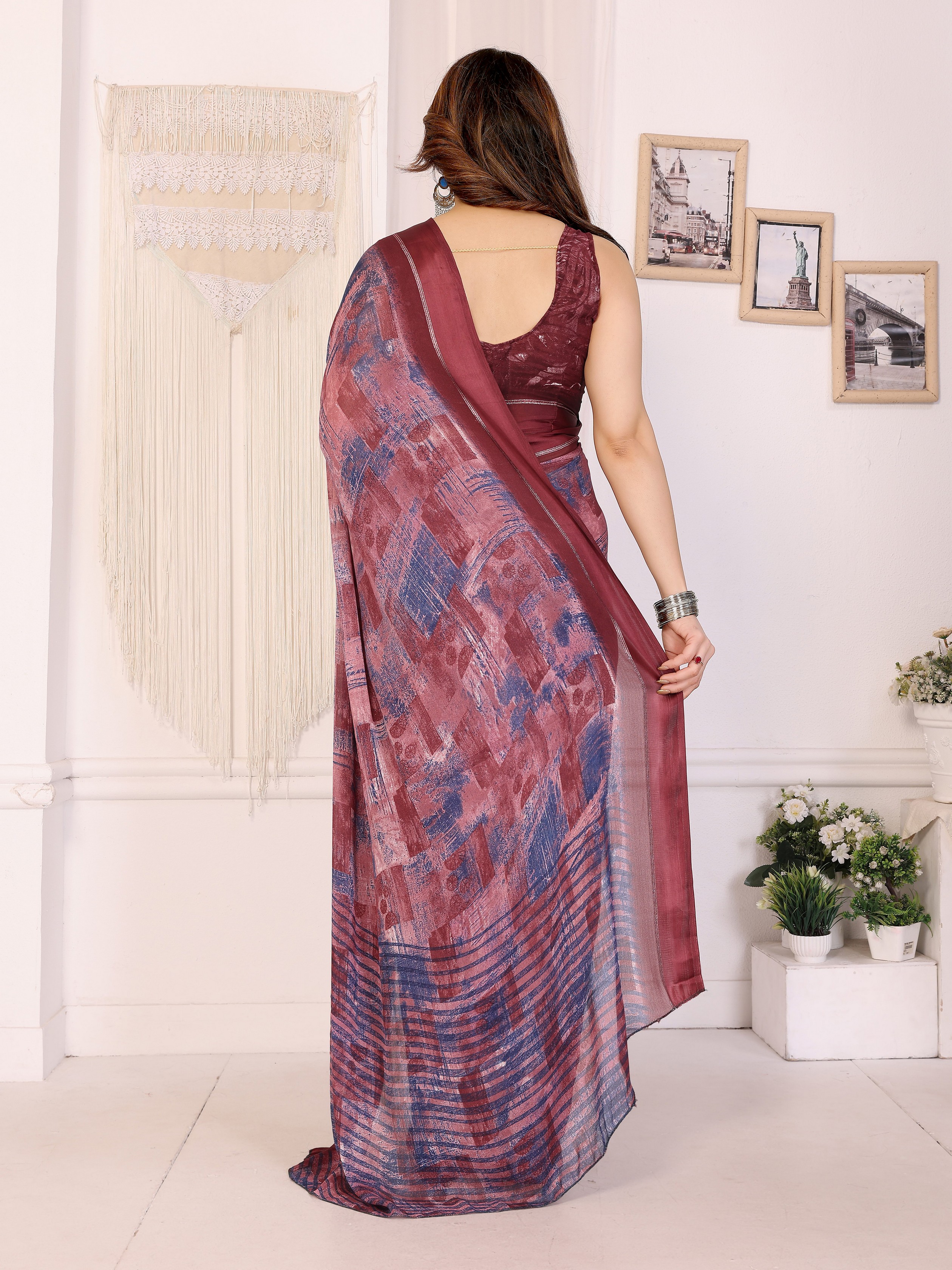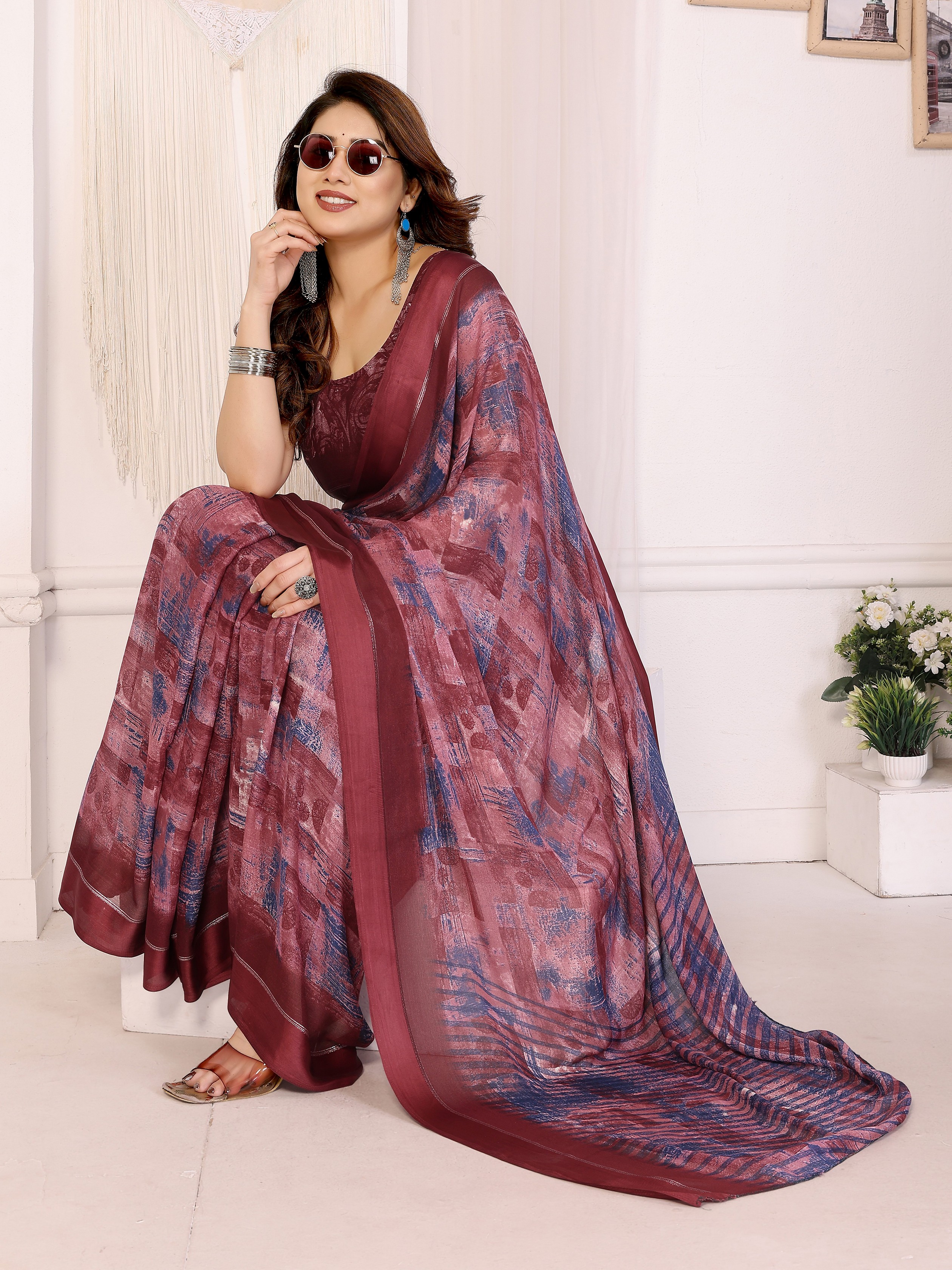 Maroon Color Moss Satin Patta Fabric Designer Printed Saree