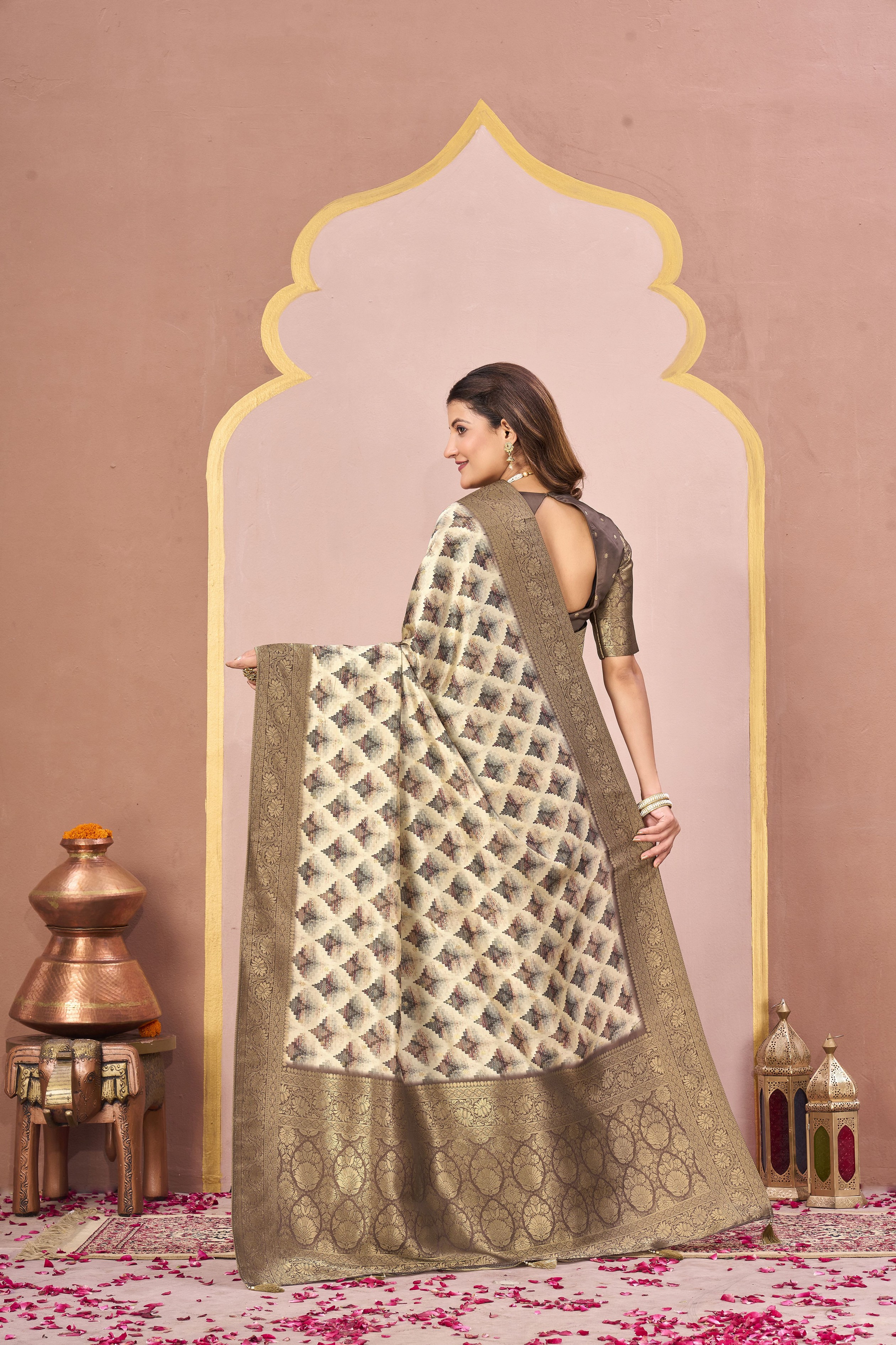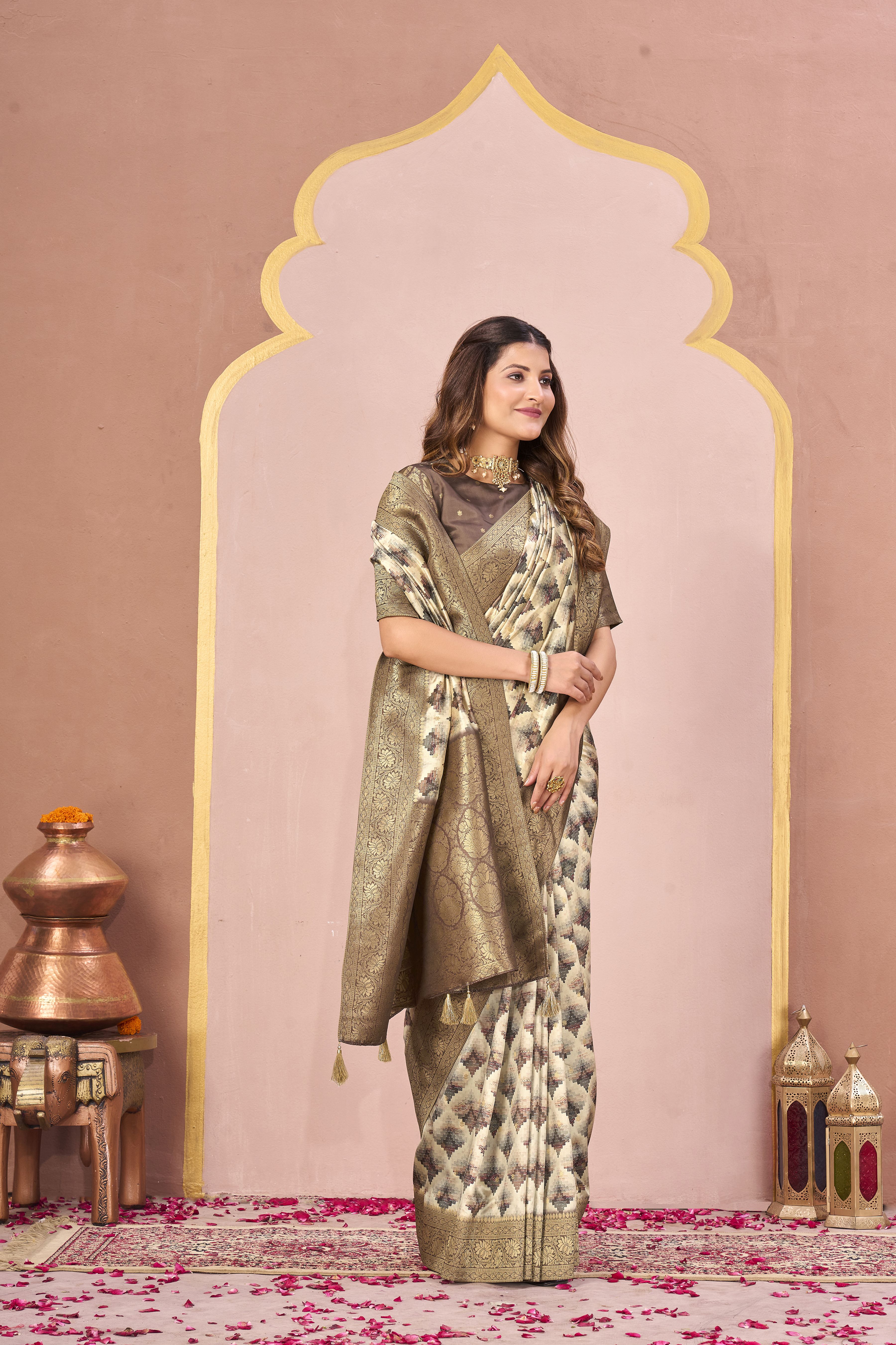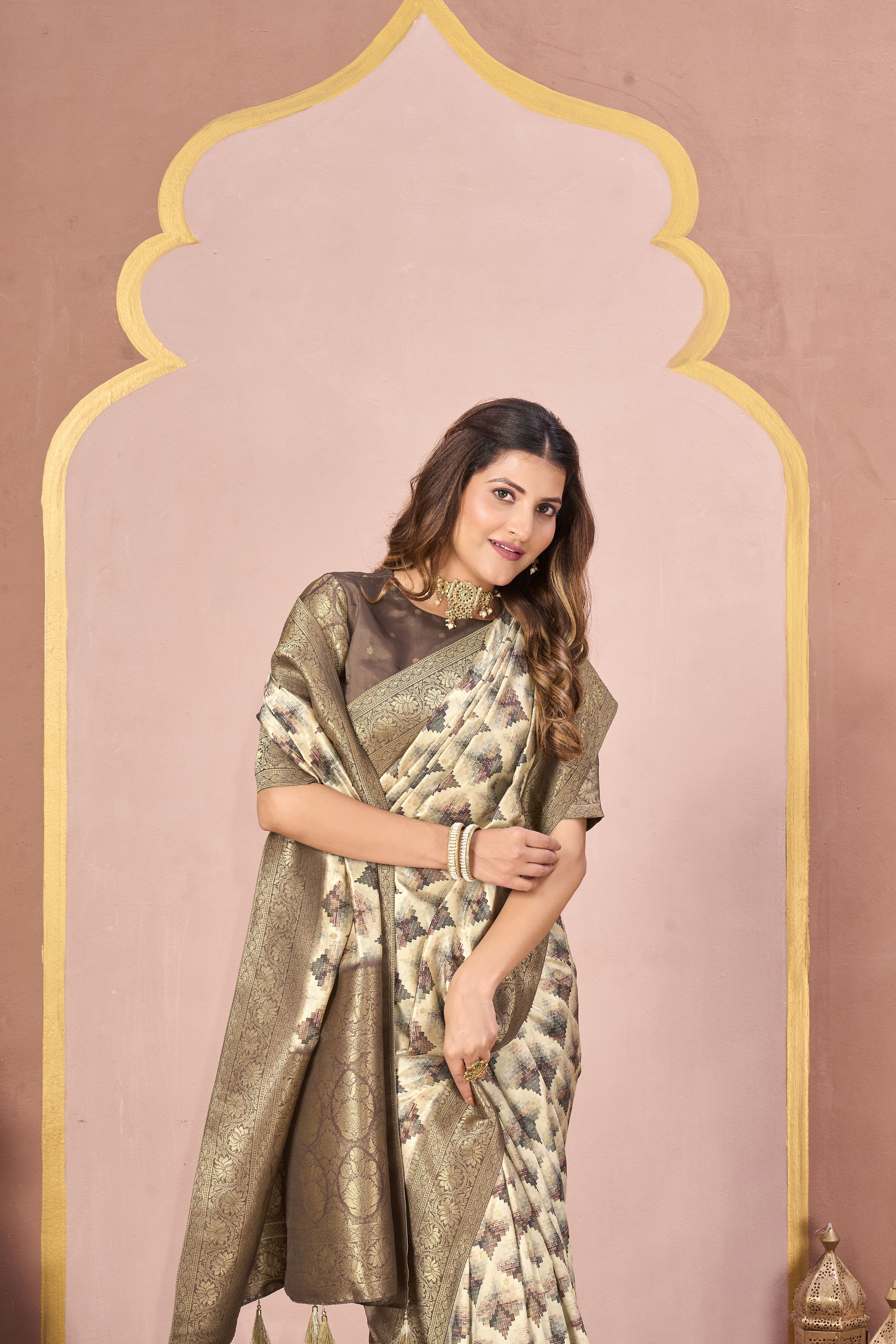 Mehandi Color Tussar Silk Designer Printed Saree With Woven Designer