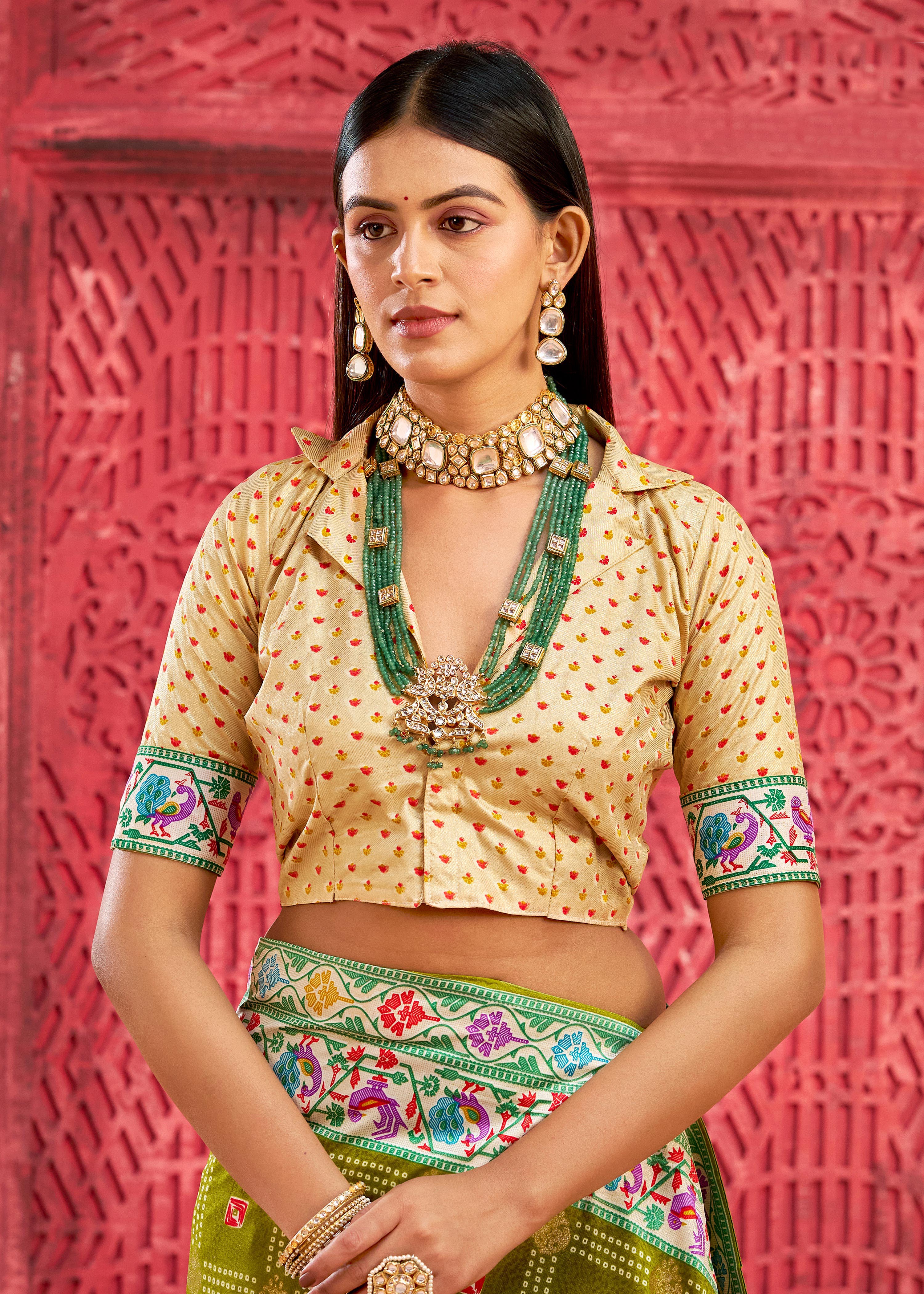 Mehandi Color Velvet Tussar Silk Fabric Partywear Saree With Paithani Pallu And Traditional Ghatchola Print
