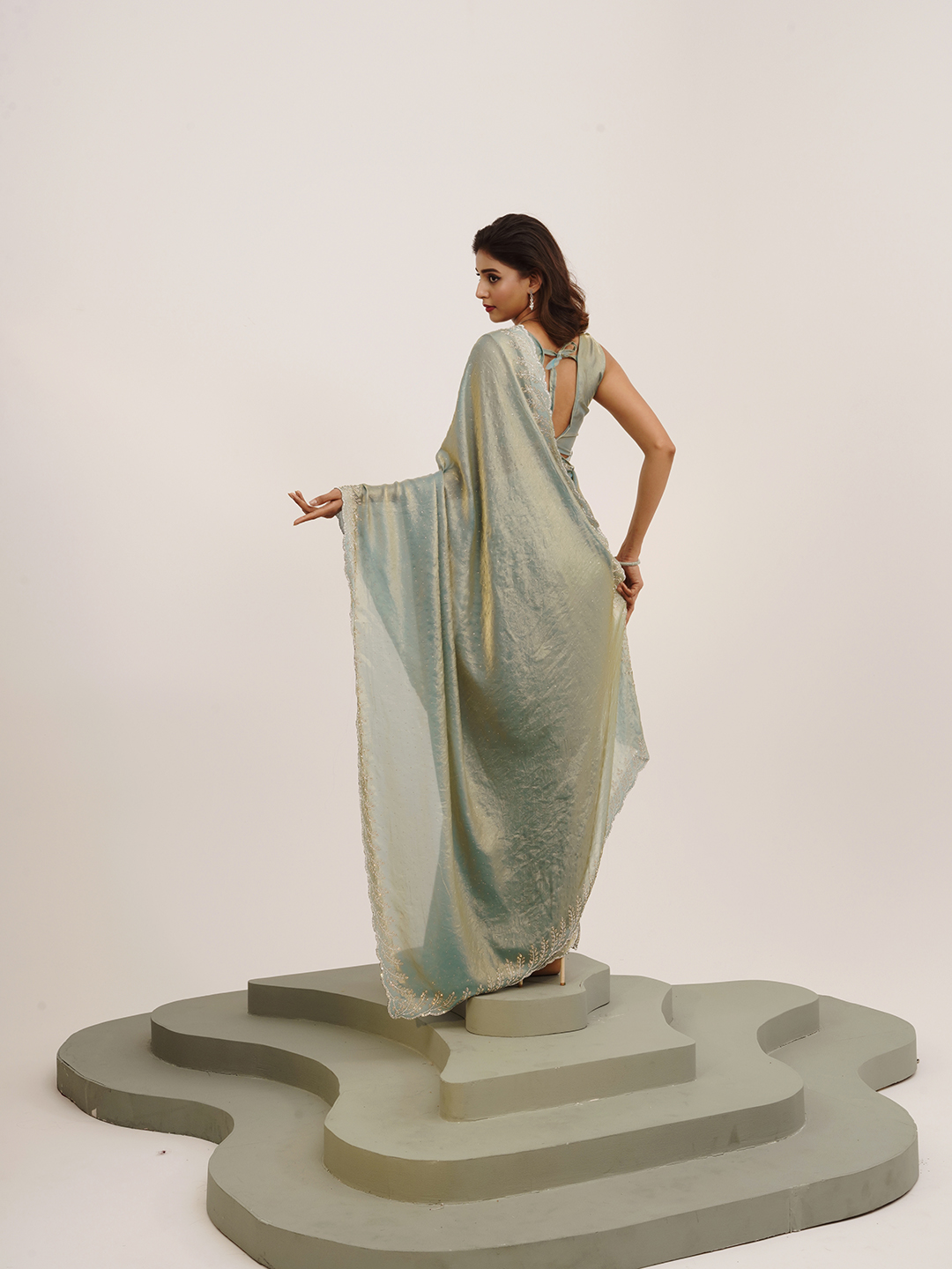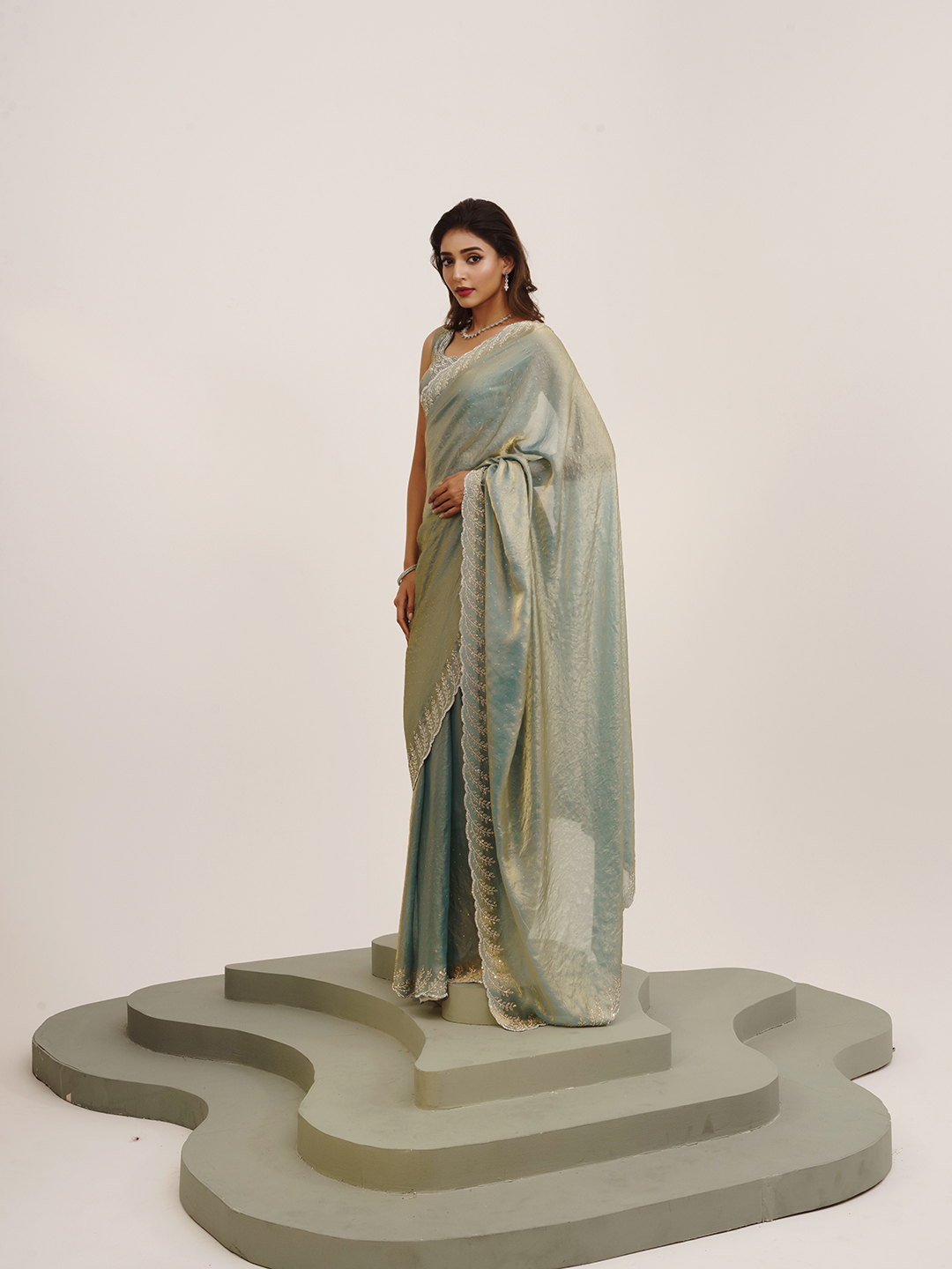 Metallic Grey Color Embellished Beads and Stones Satin Saree For Beautiful Partywear Saree