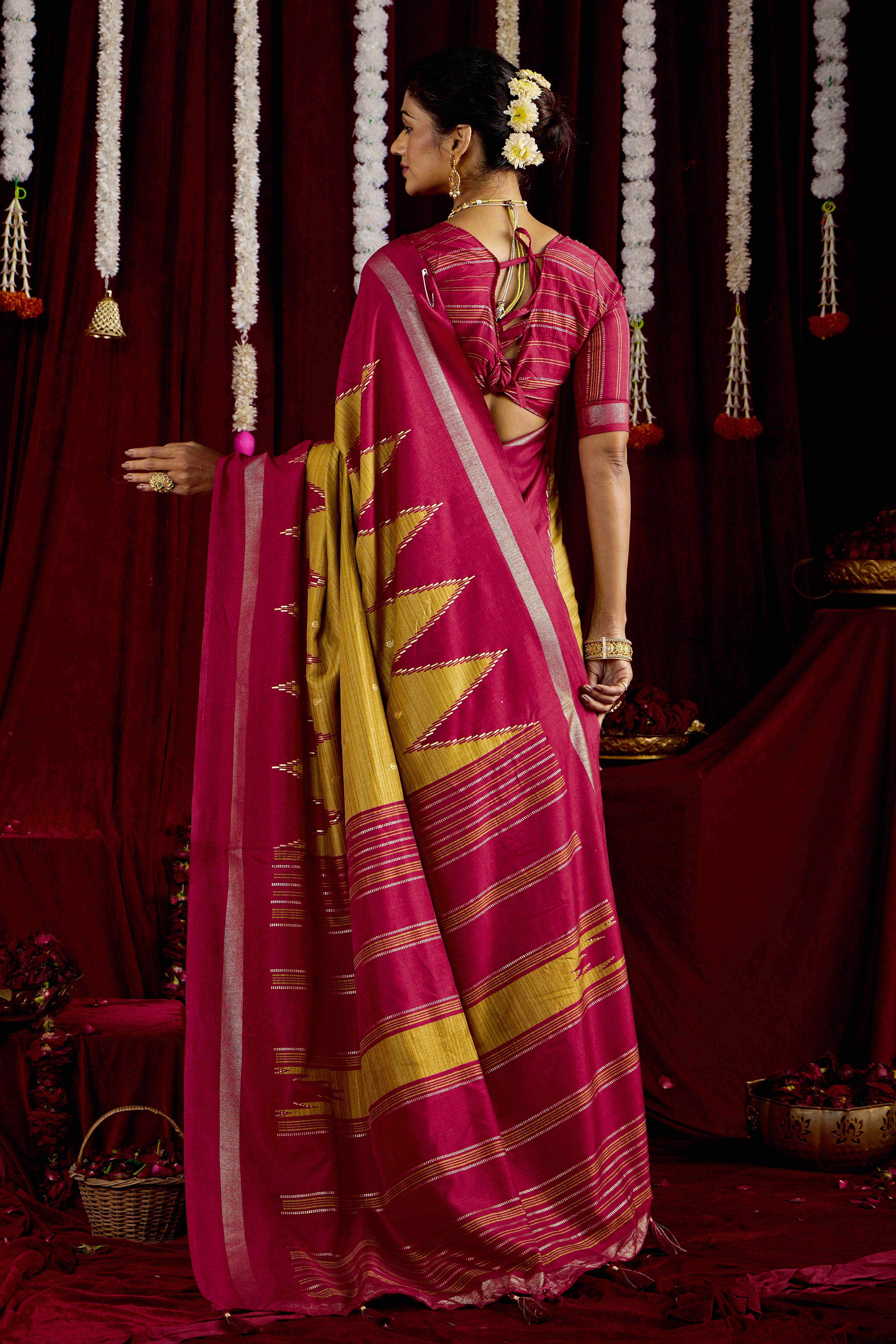 Mustard & Pink Color Ikkat Silk Fabric Designer Zig Zag Printed Traditional Party Looks Saree