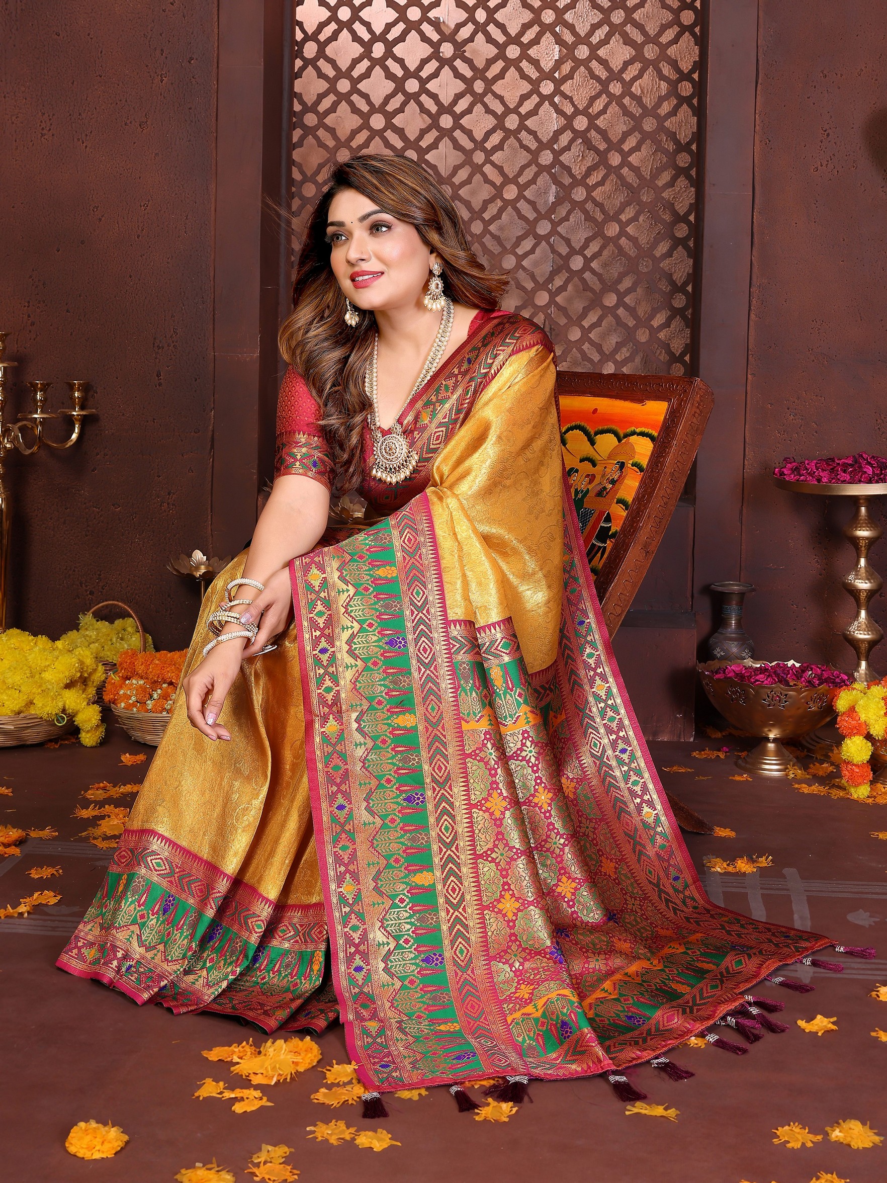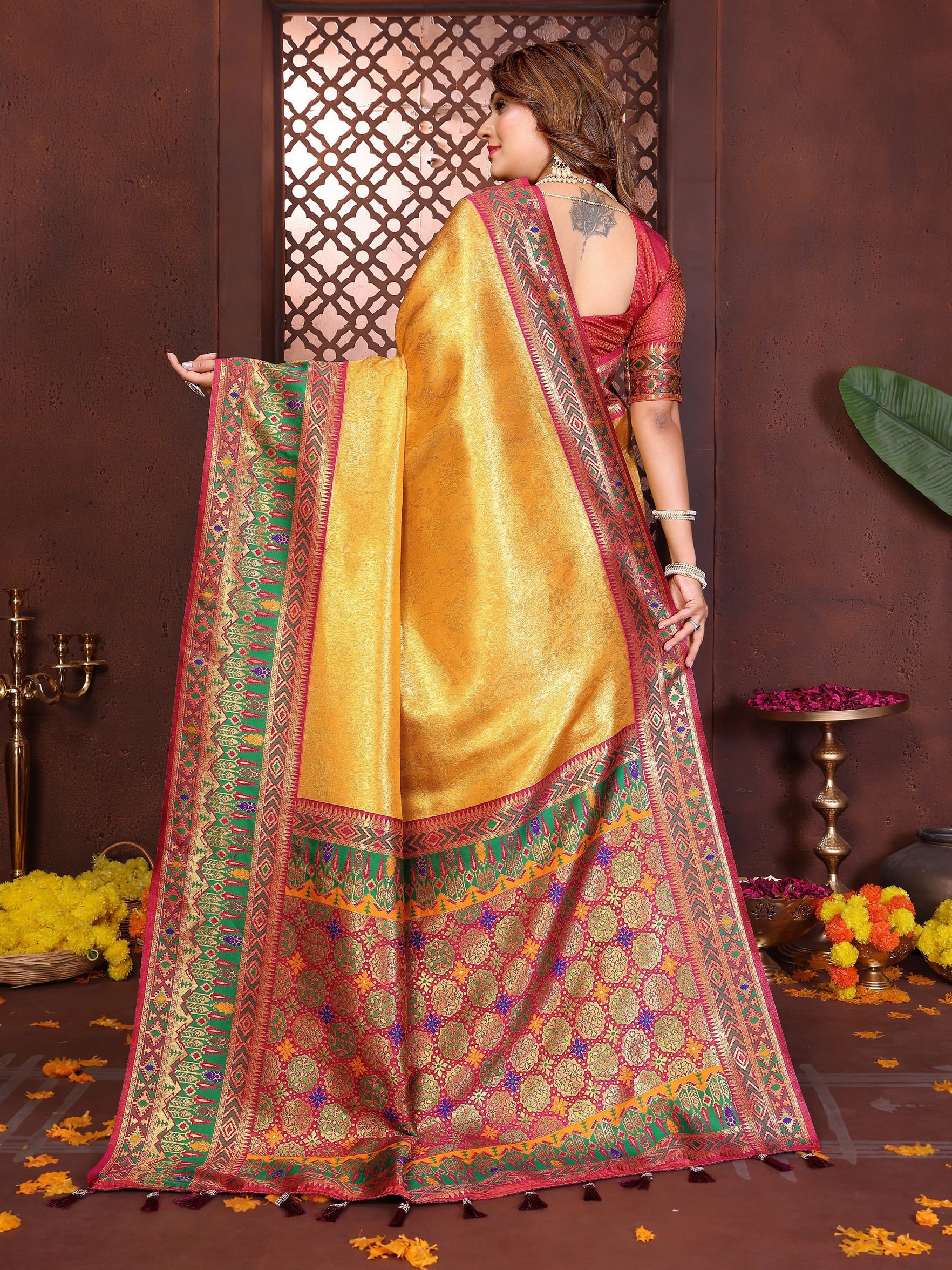 Mustard Color Banarasi Tissue Silk Fabric Woven Rich Paithani Designer Ethnic Partywear Saree