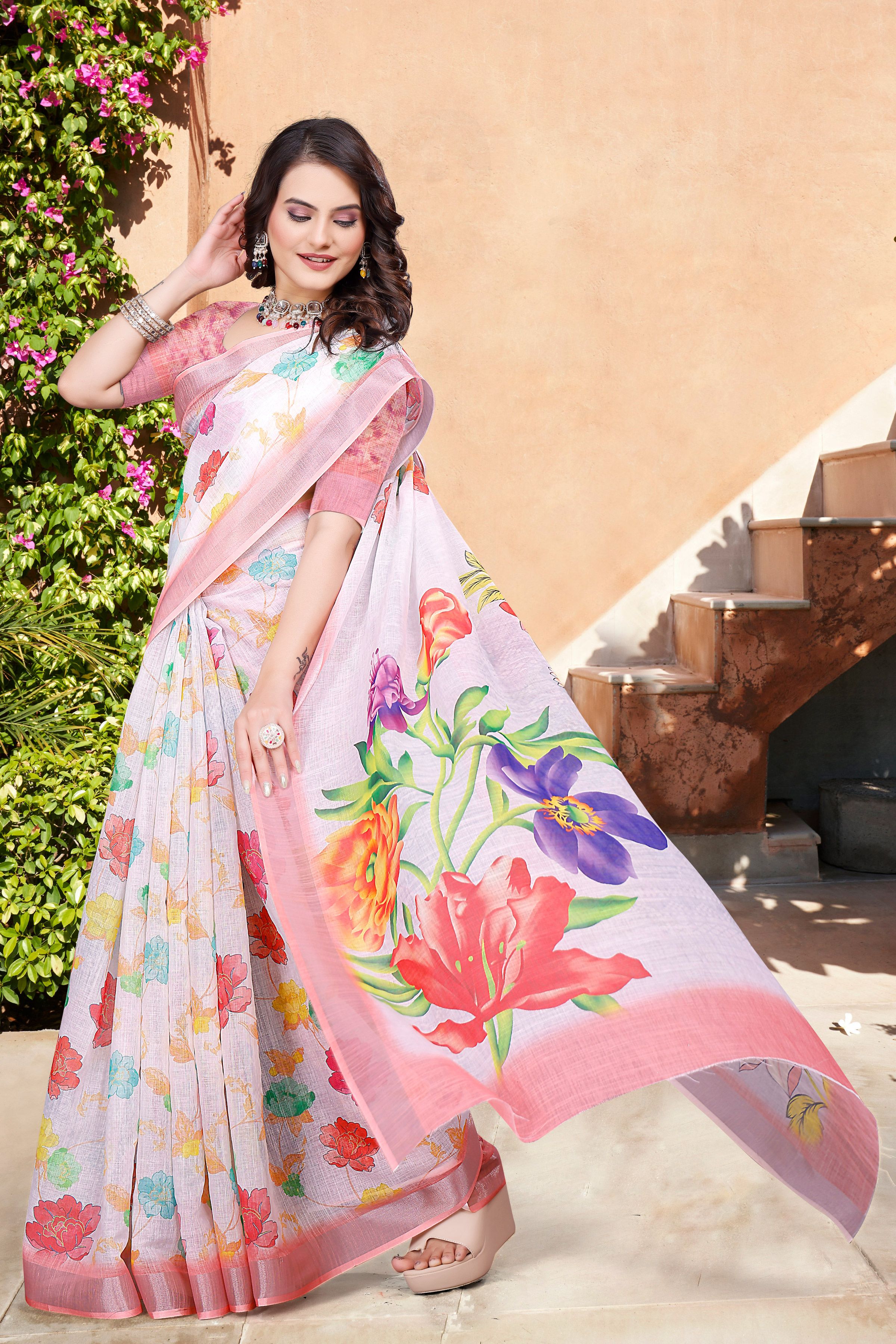 Attractive These Festive Saree in Fine Colored.These Saree Are Linen Cotton And Blouse is Fabricated On Linen Cotton Pair.Its Beautified With Woven Jari Border With Designer Digital Printed.