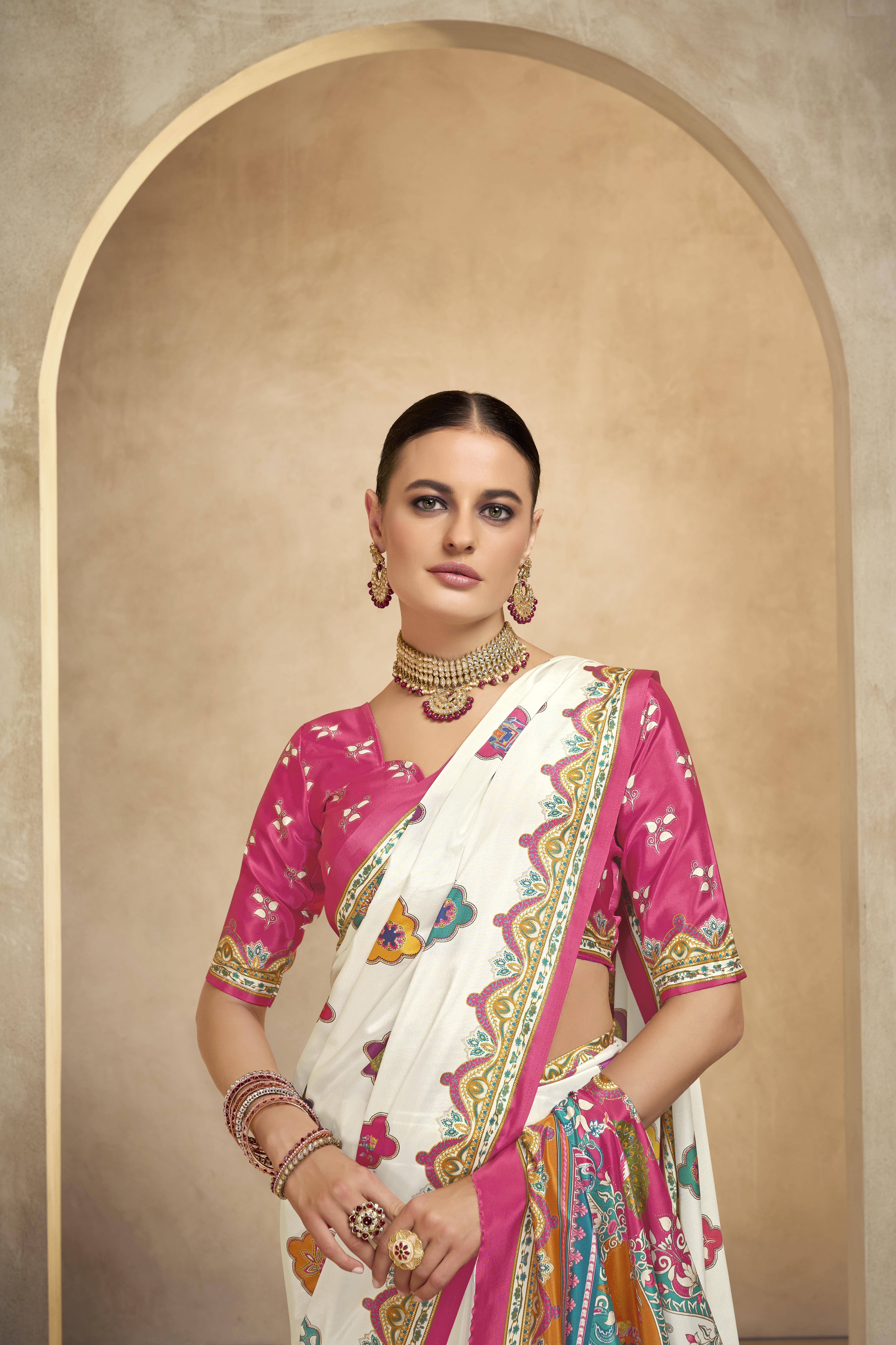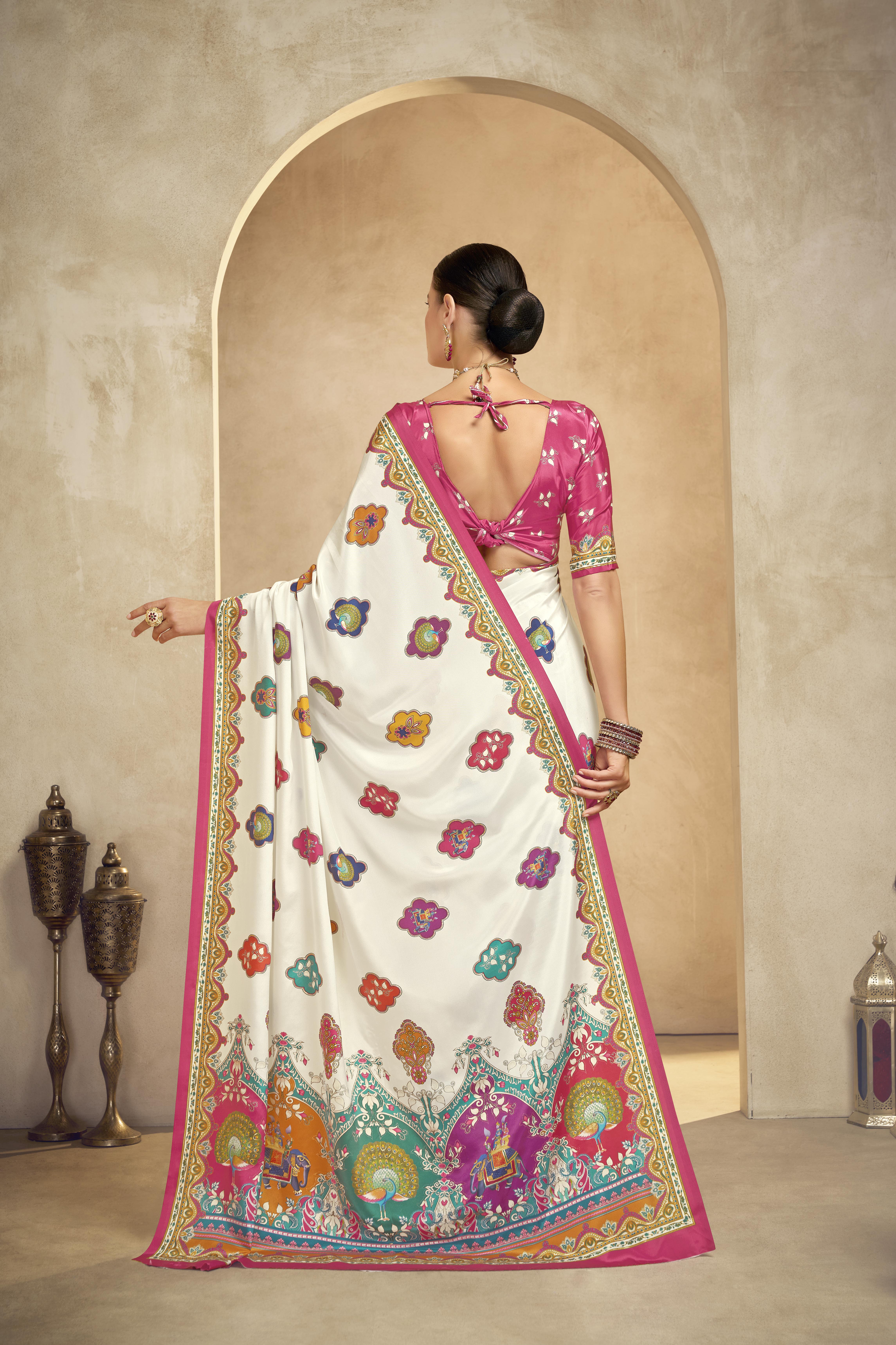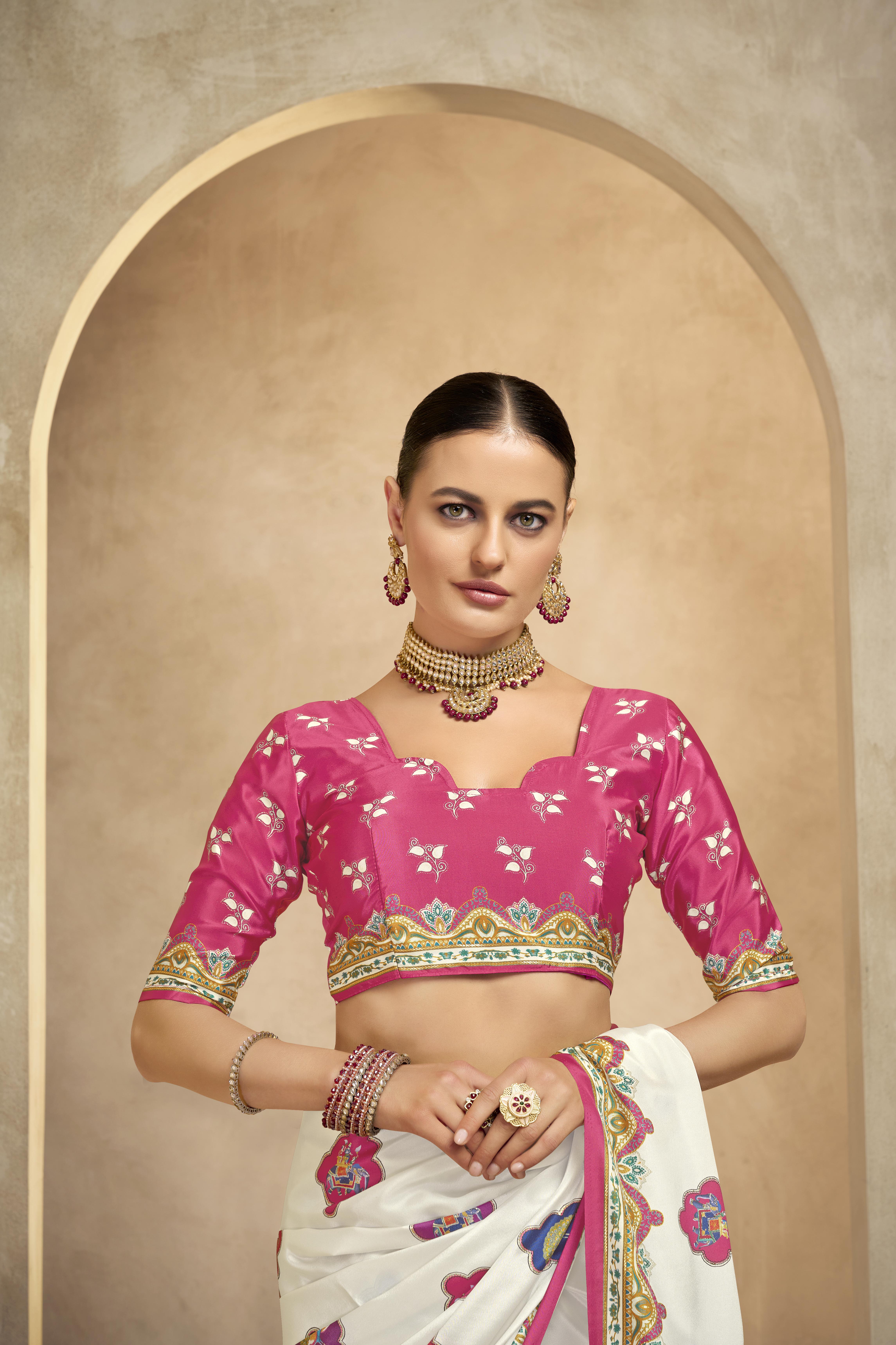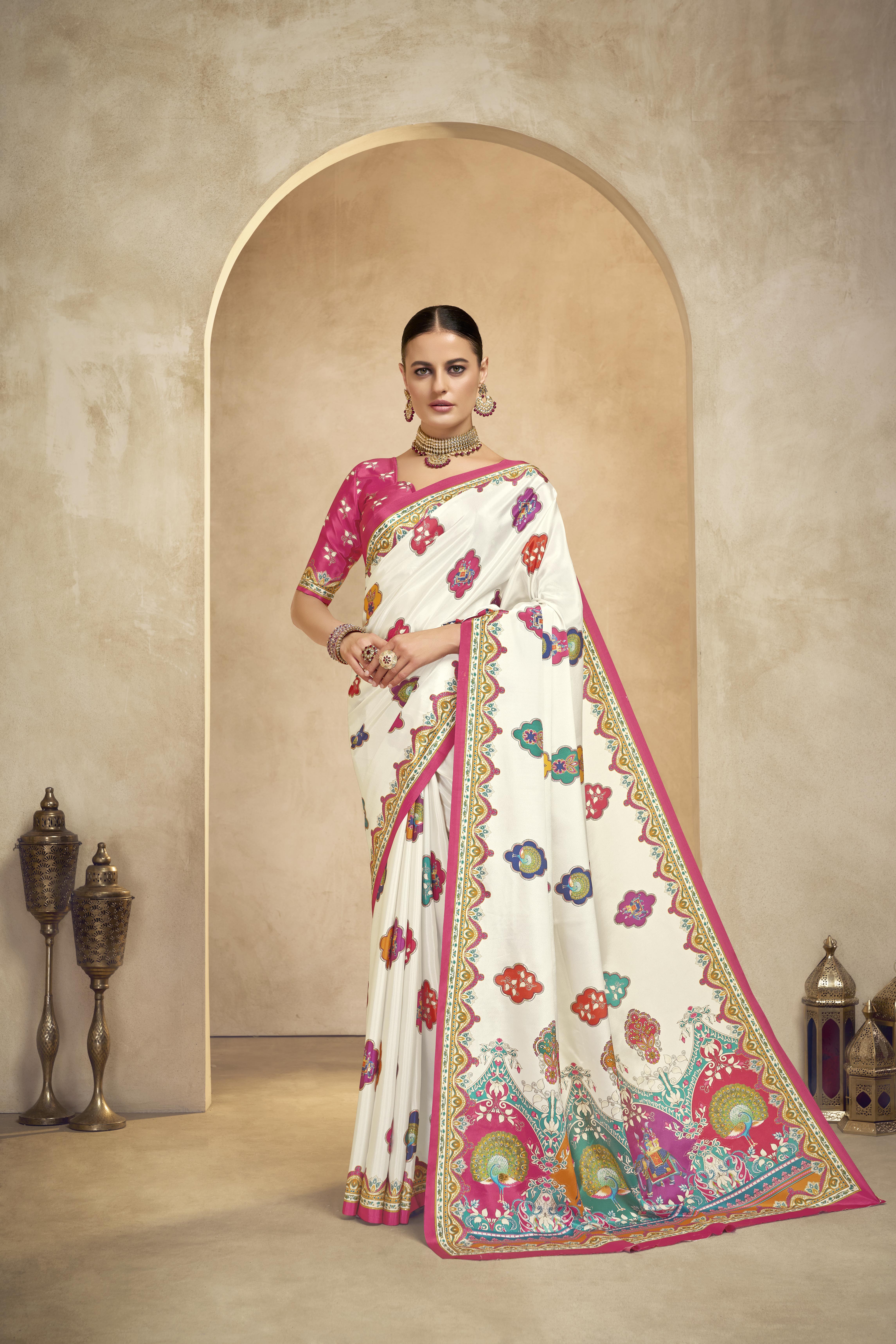 Off White Color Crepe Silk Fabric Position Digital Foil Printed Saree