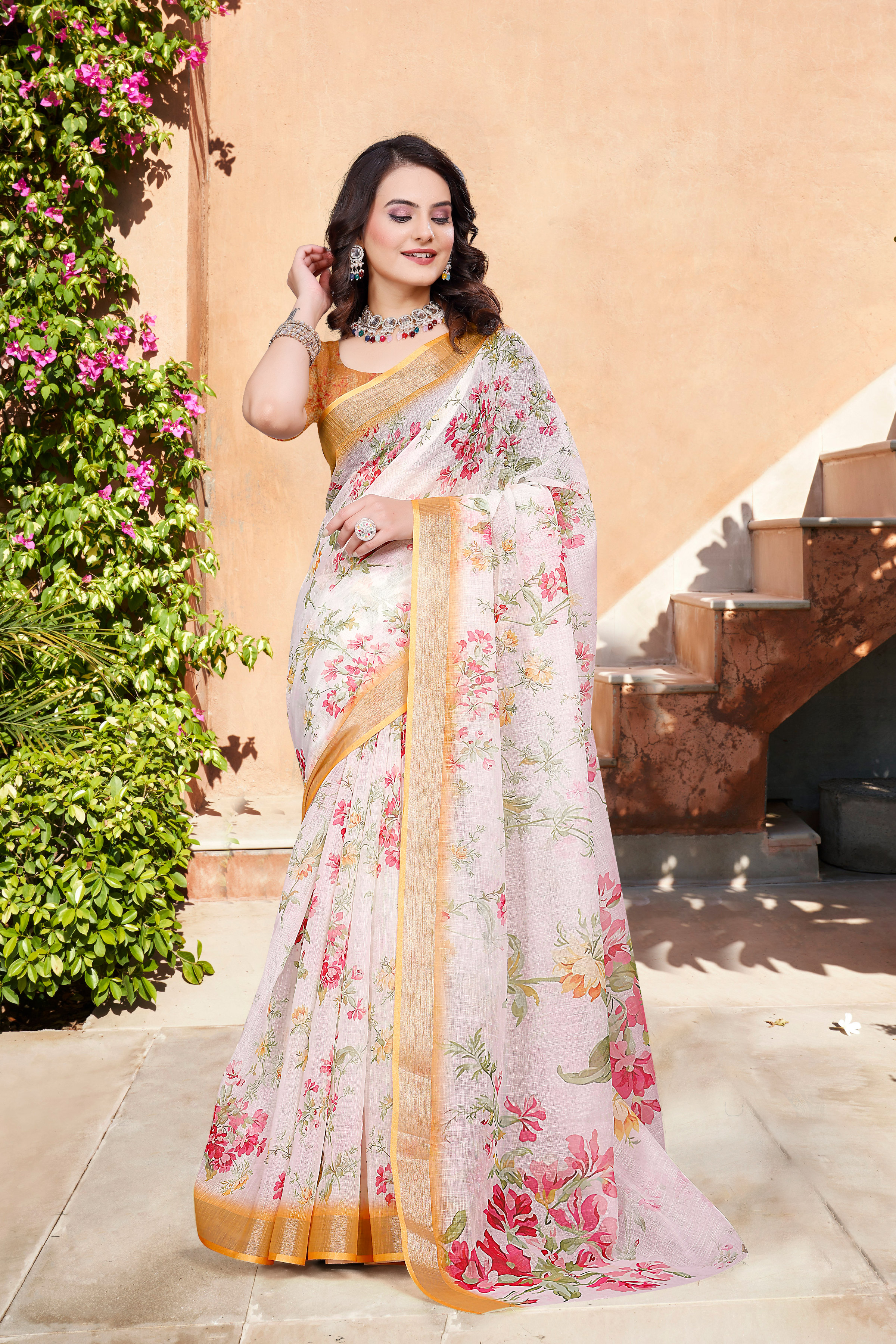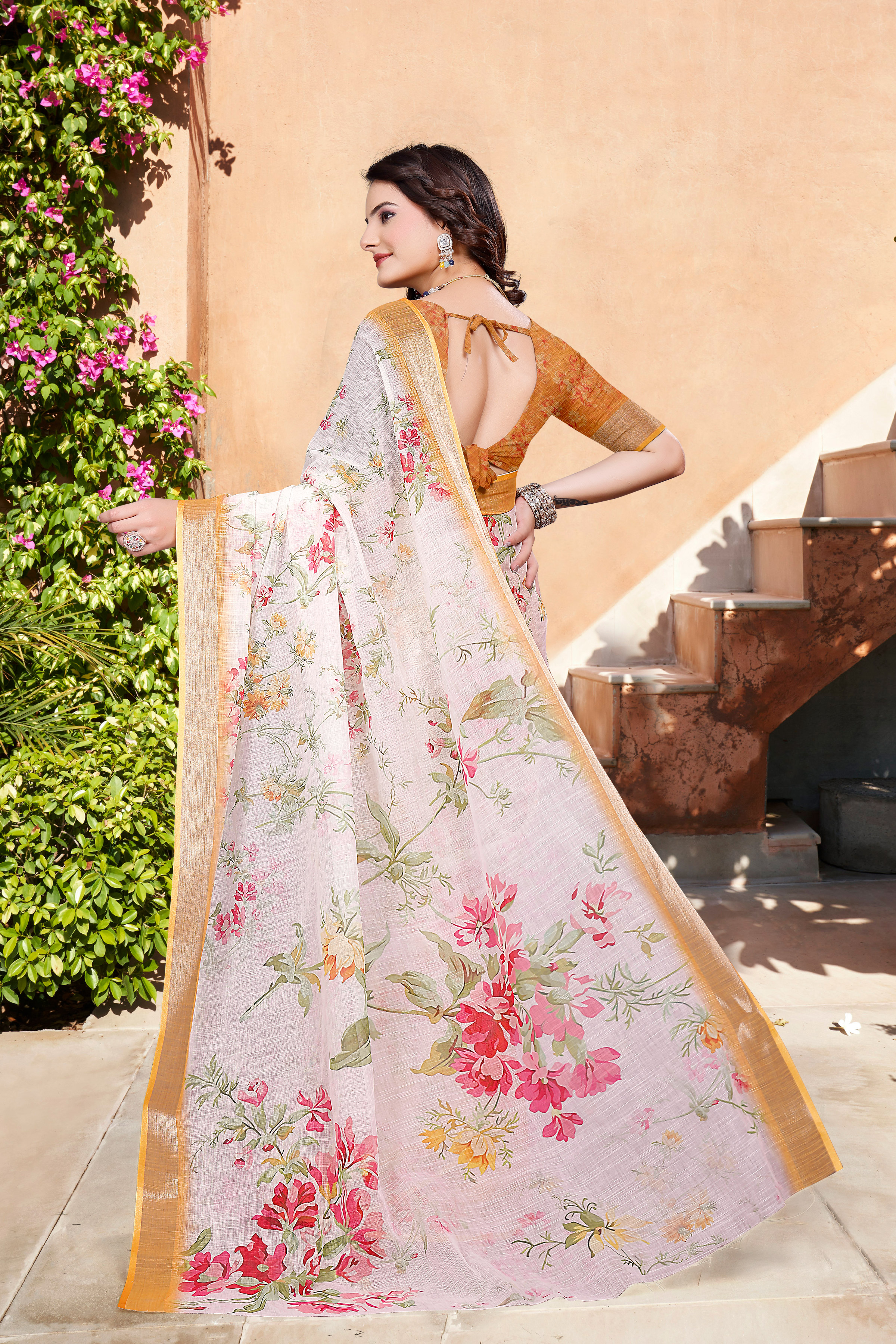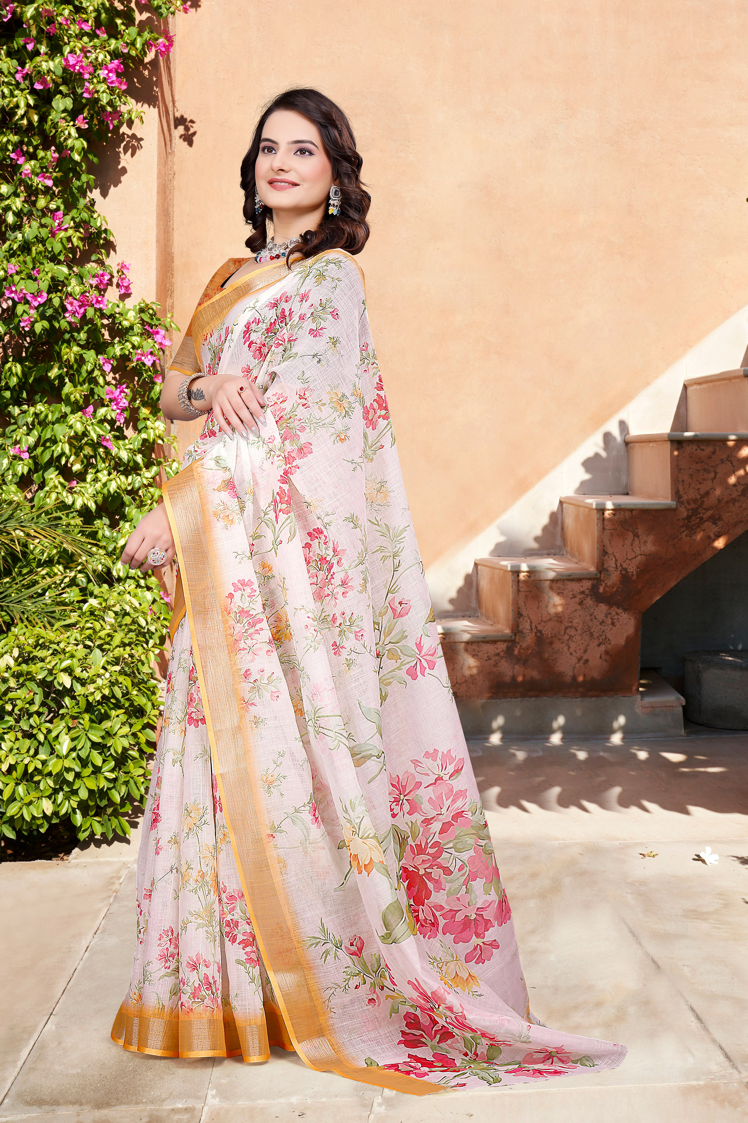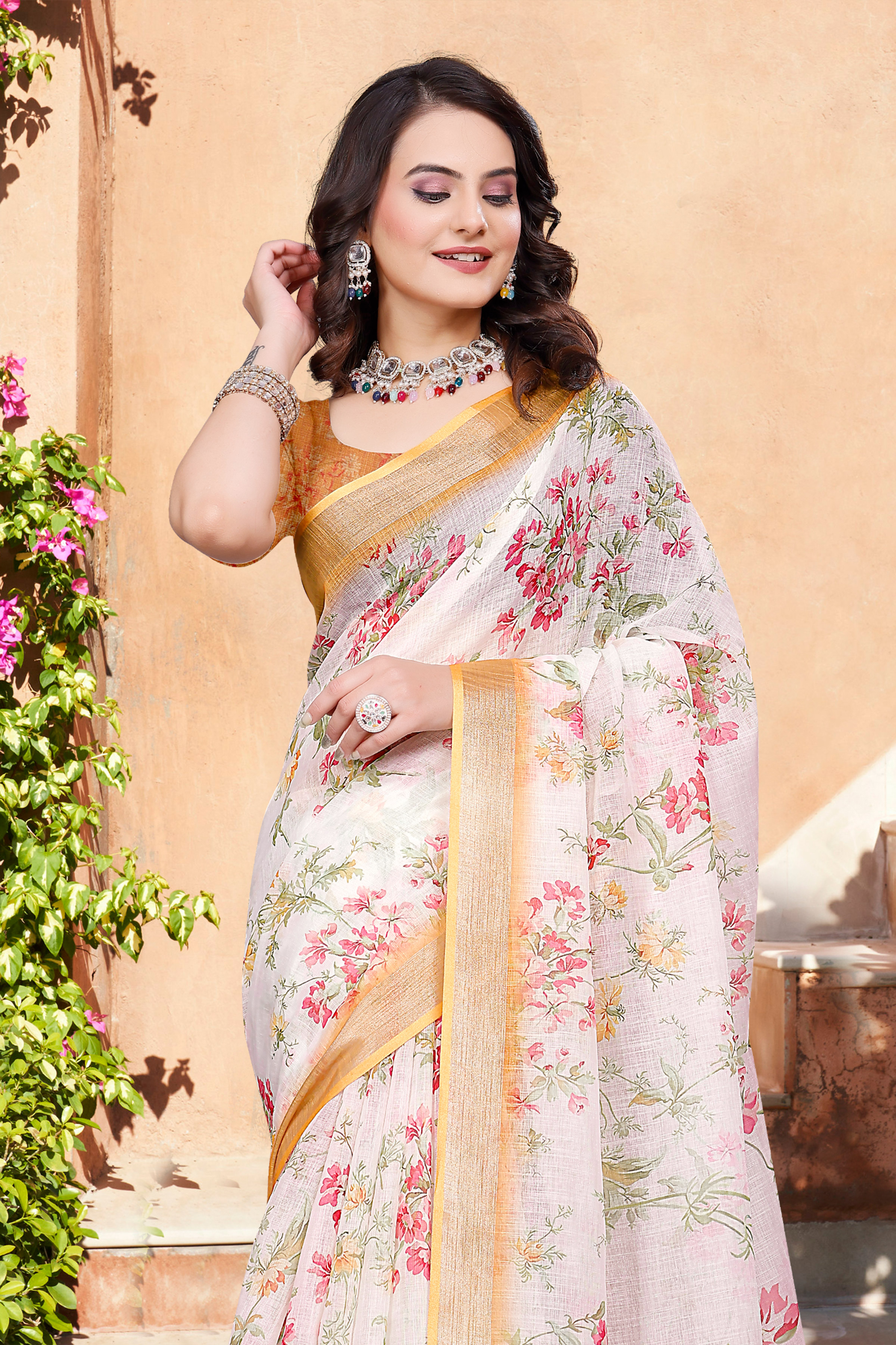 Off White Color Linen Cotton Saree With Smart Partywear Printed Looks