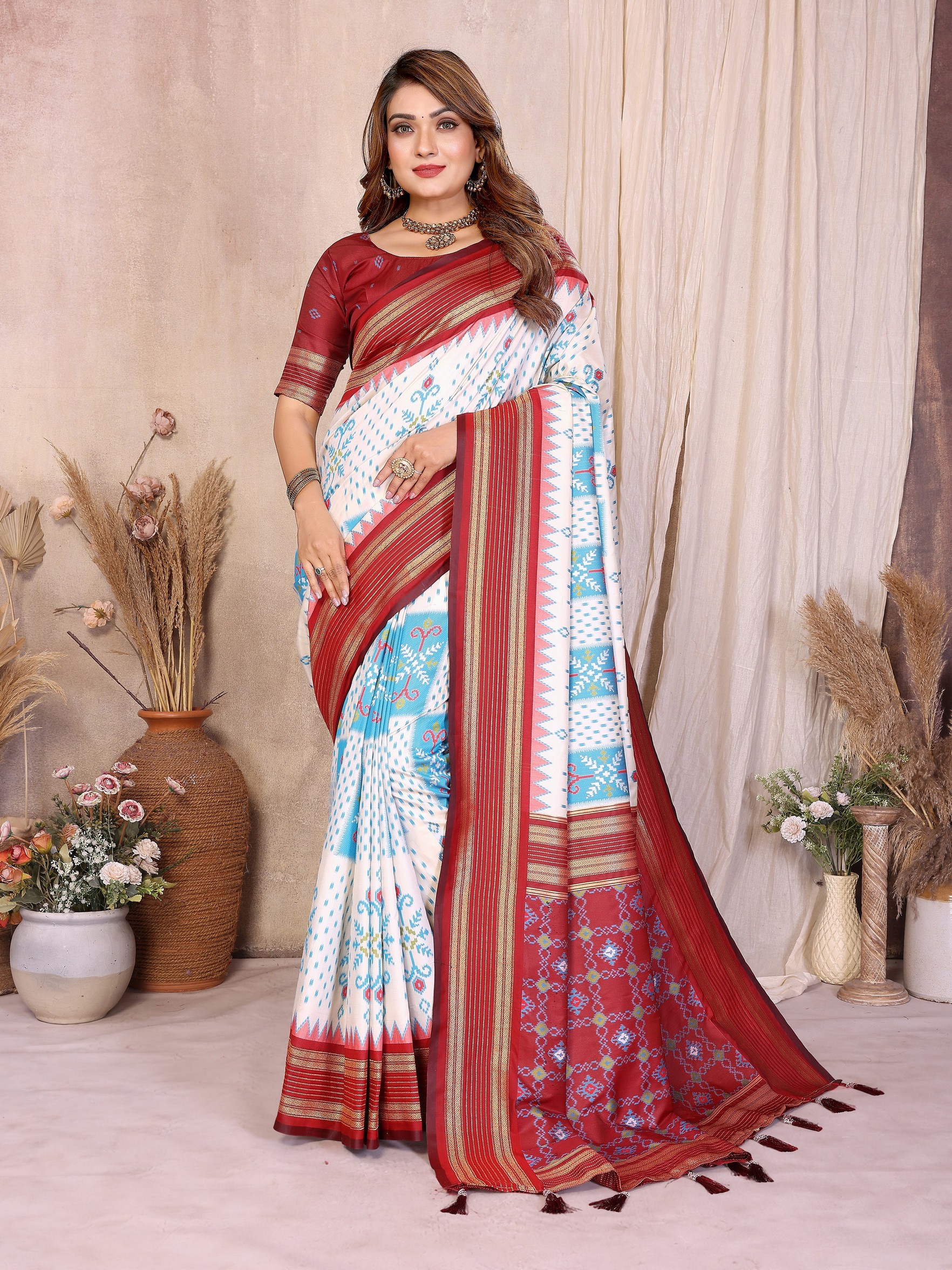 Off White Color Soft Silk Fabric Ikkat Weaving Designer Traditional Partywear Saree