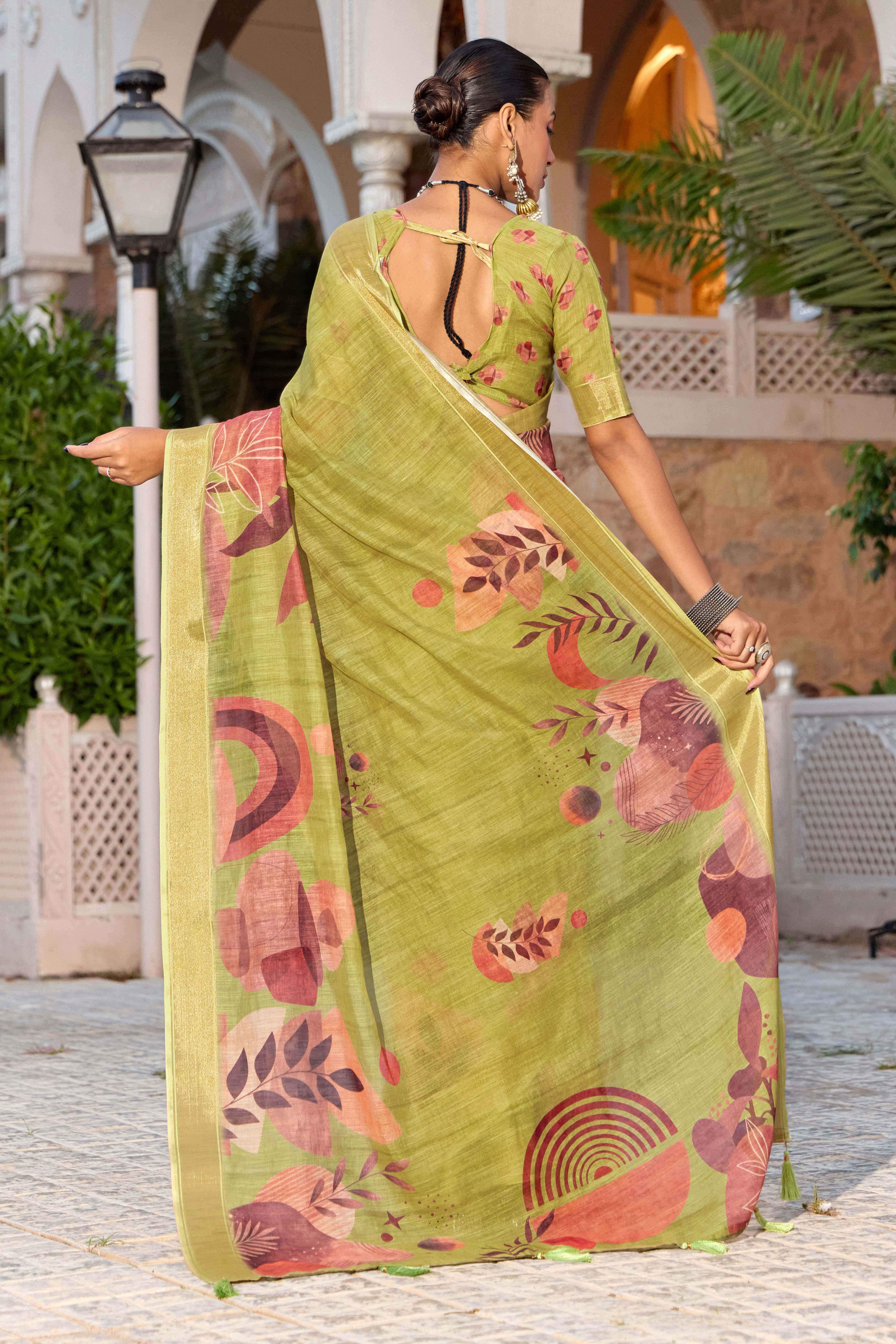 Olive Green Color Beautiful Linen Silk Fabric Saree With Sophisticated Partywear Saree