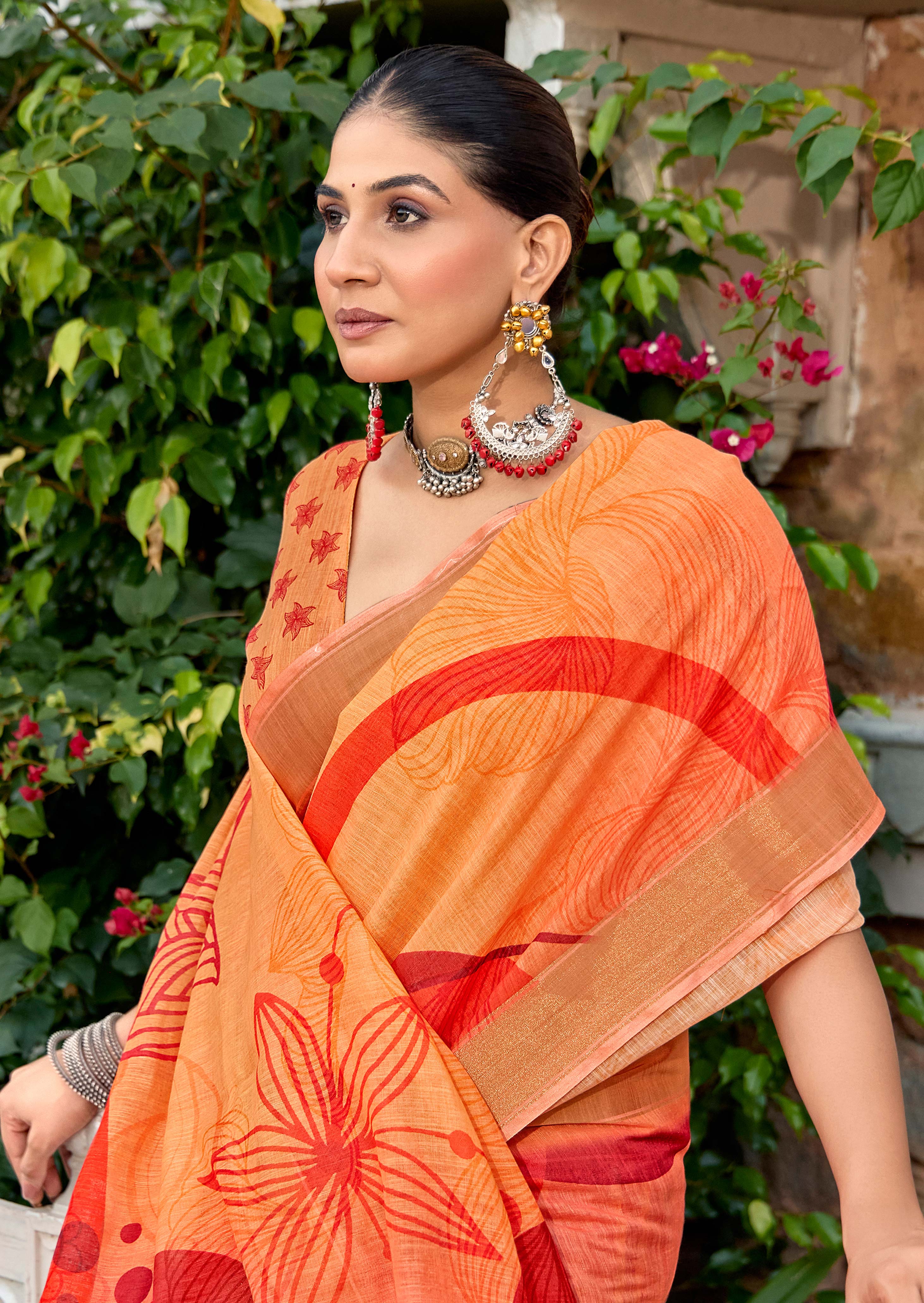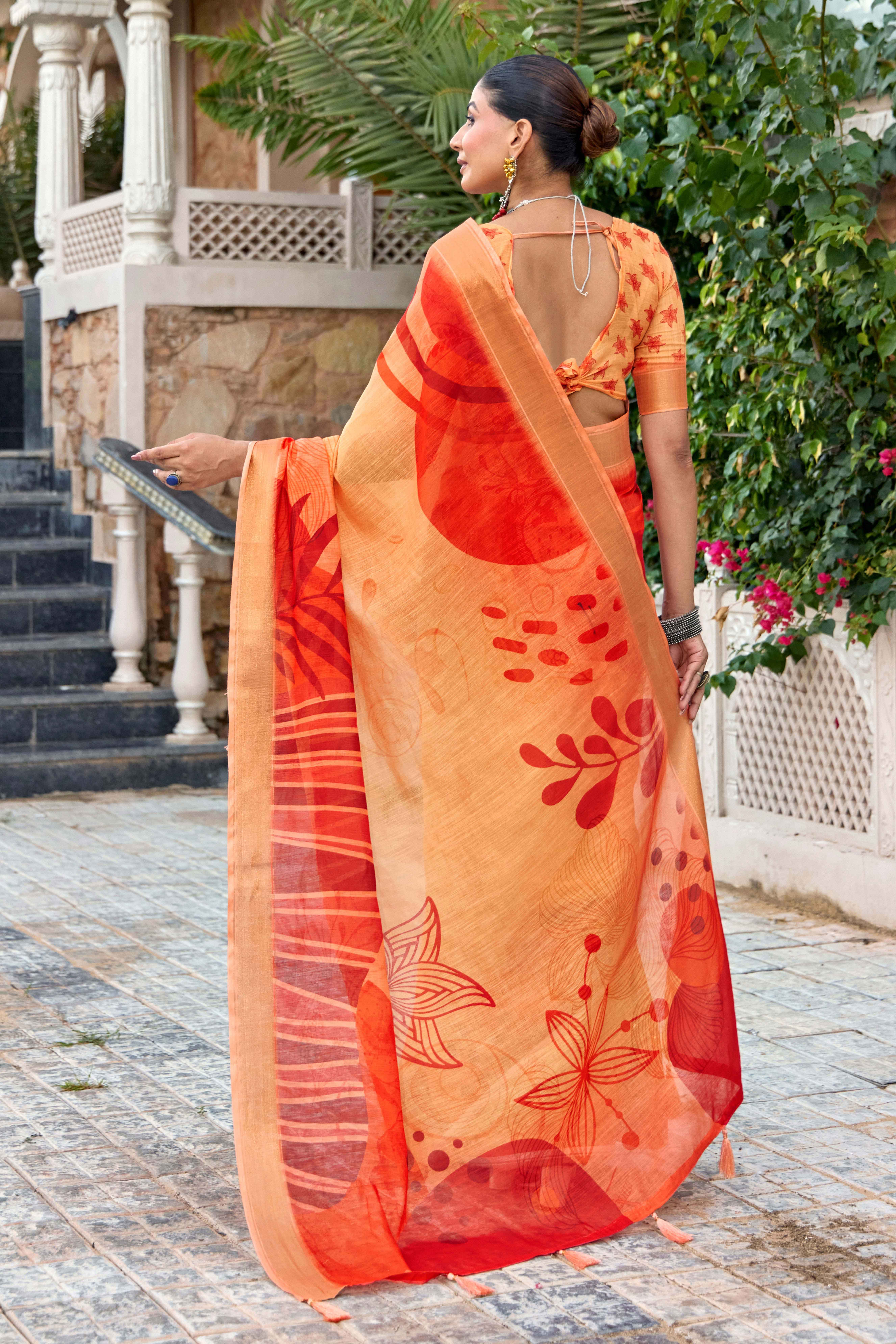 Orange Color Beautiful Linen Silk Fabric Saree With Sophisticated Partywear Saree