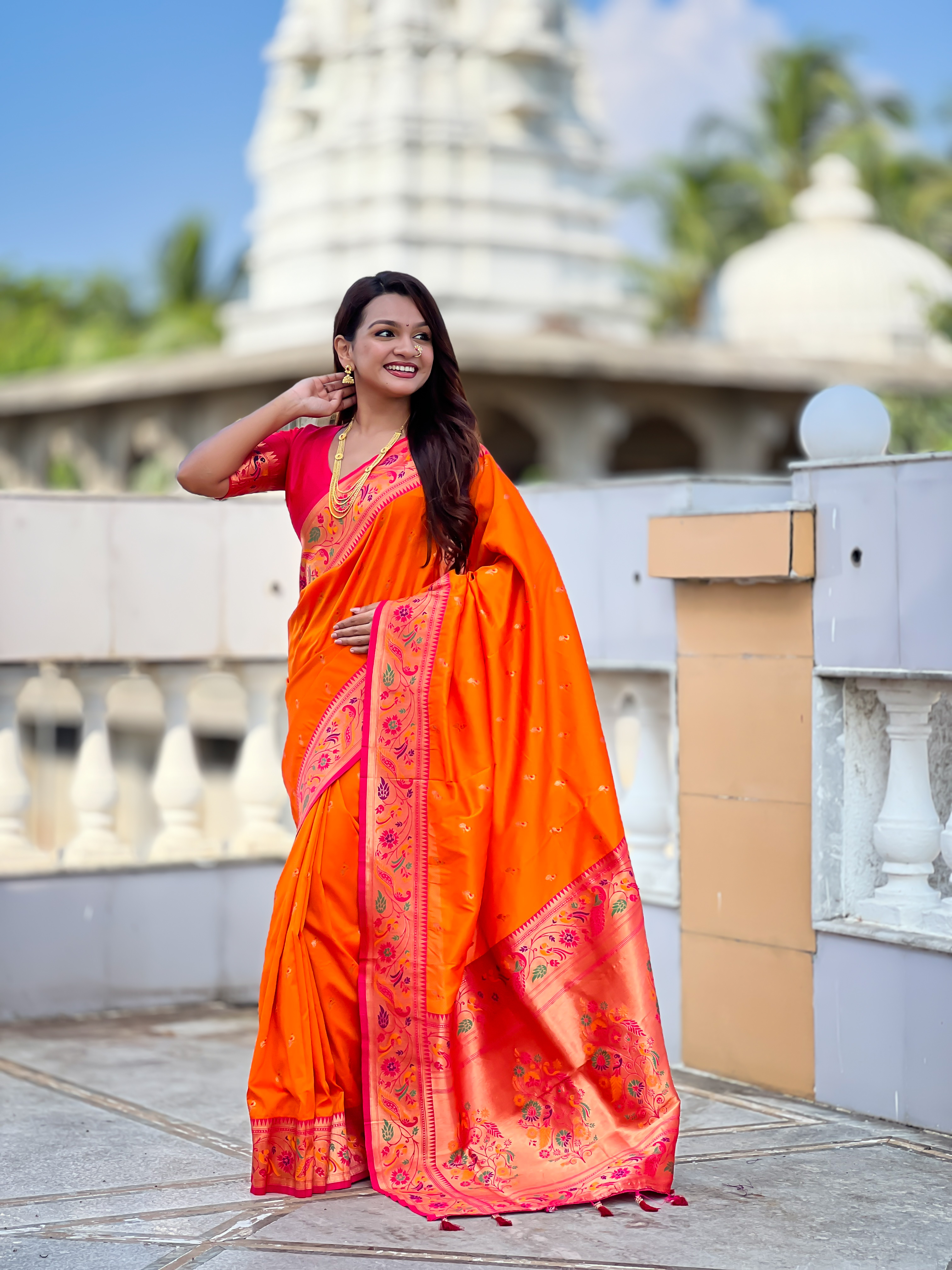 Orange Color Paithani Silk Fabric Woven Meenakari Jacquard Designer Saree