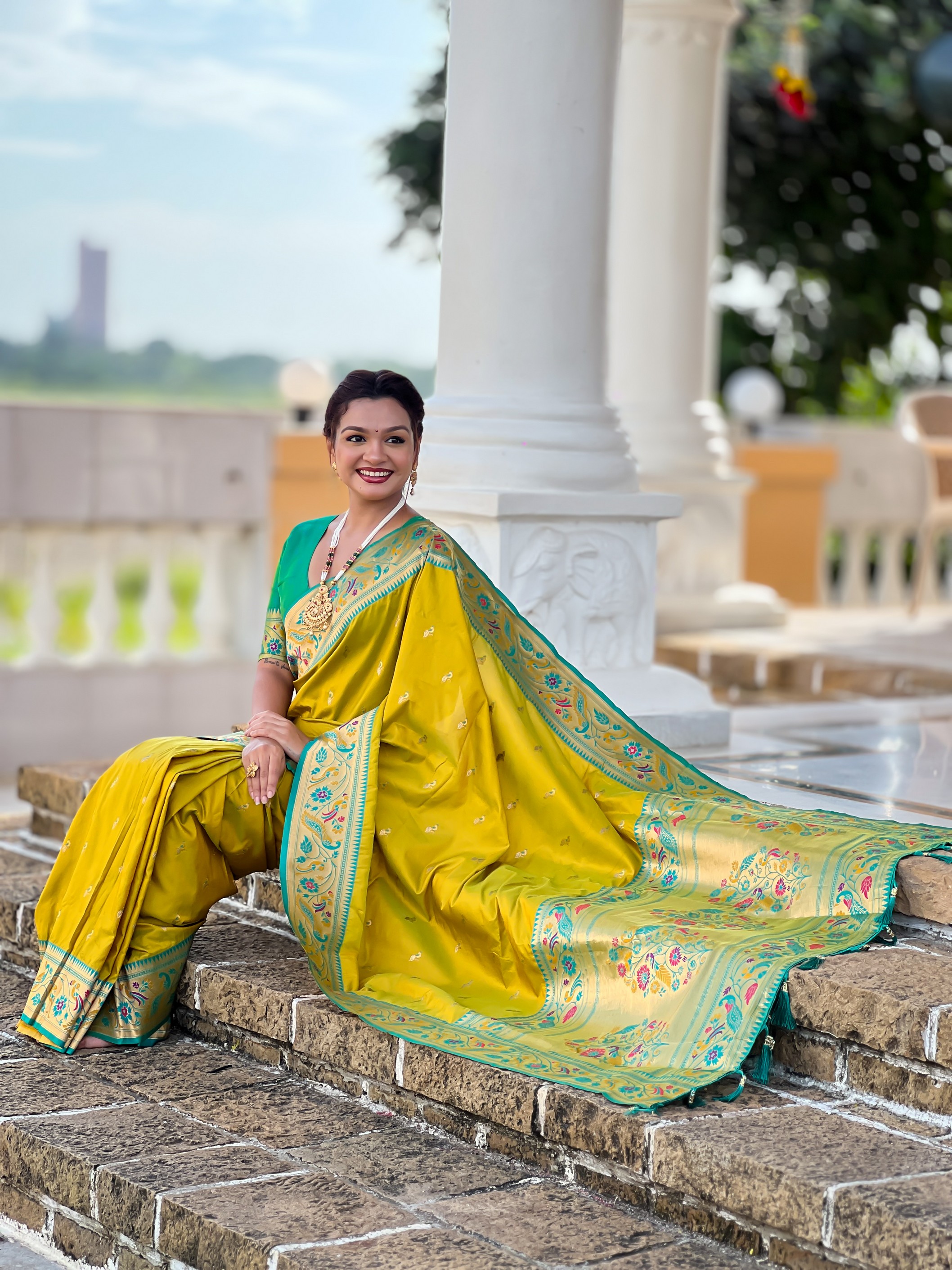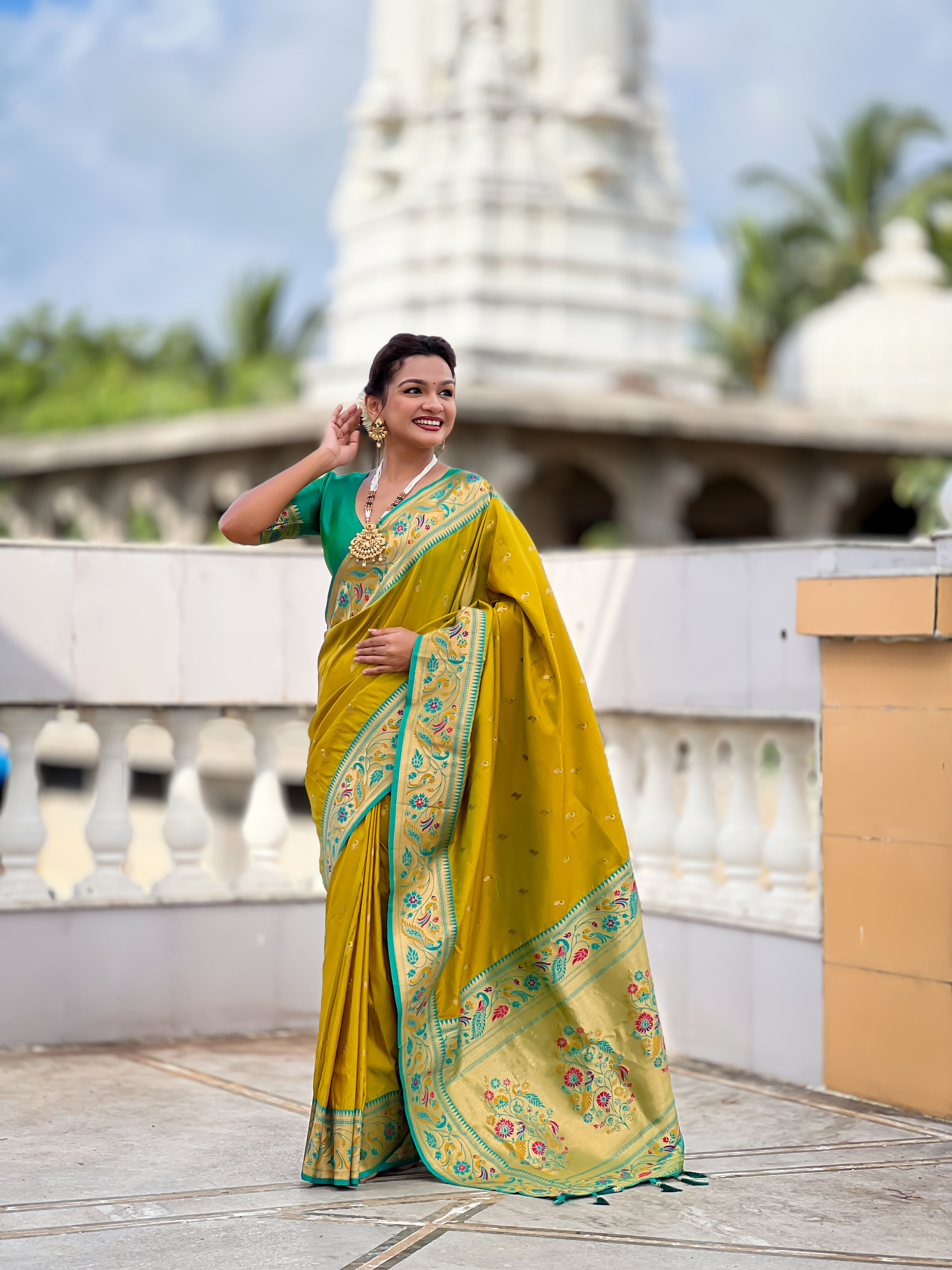 Parrot Green Color Paithani Silk Fabric Woven Meenakari Jacquard Designer Saree