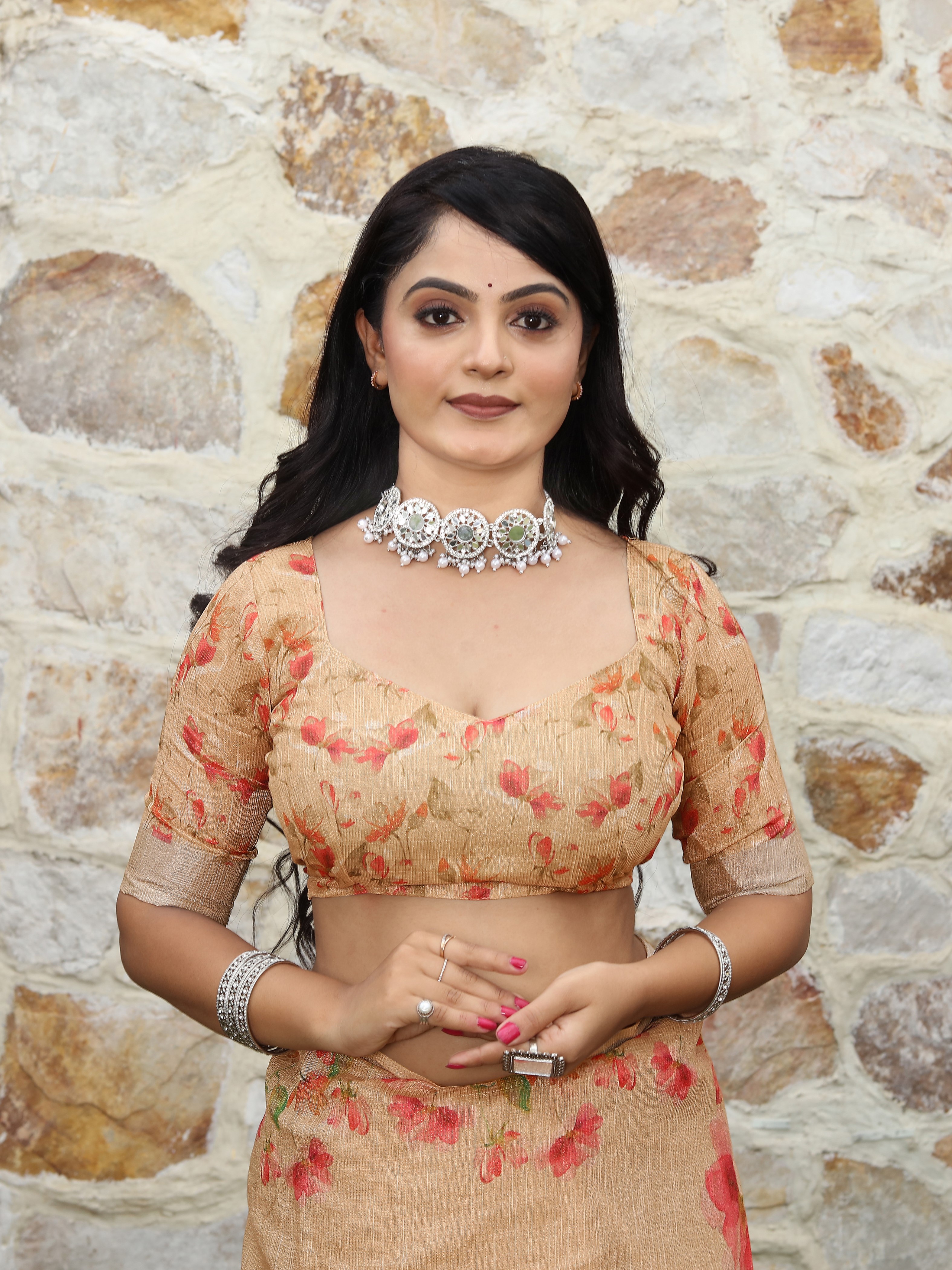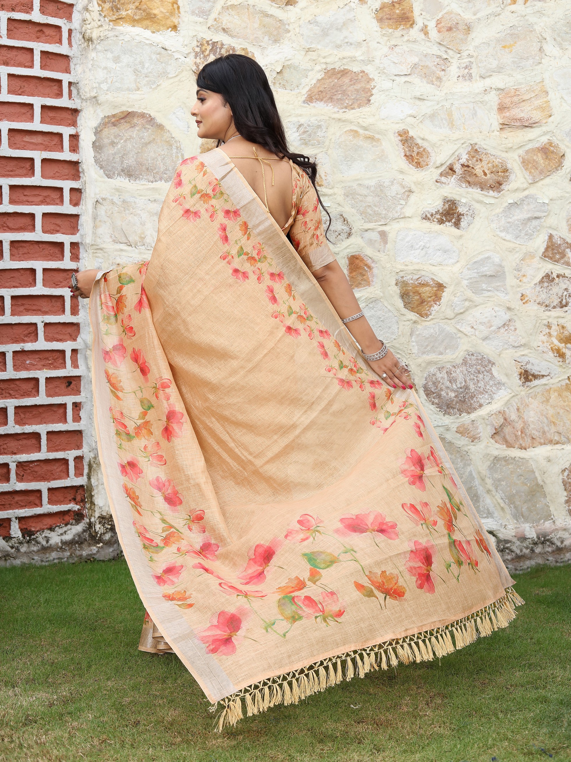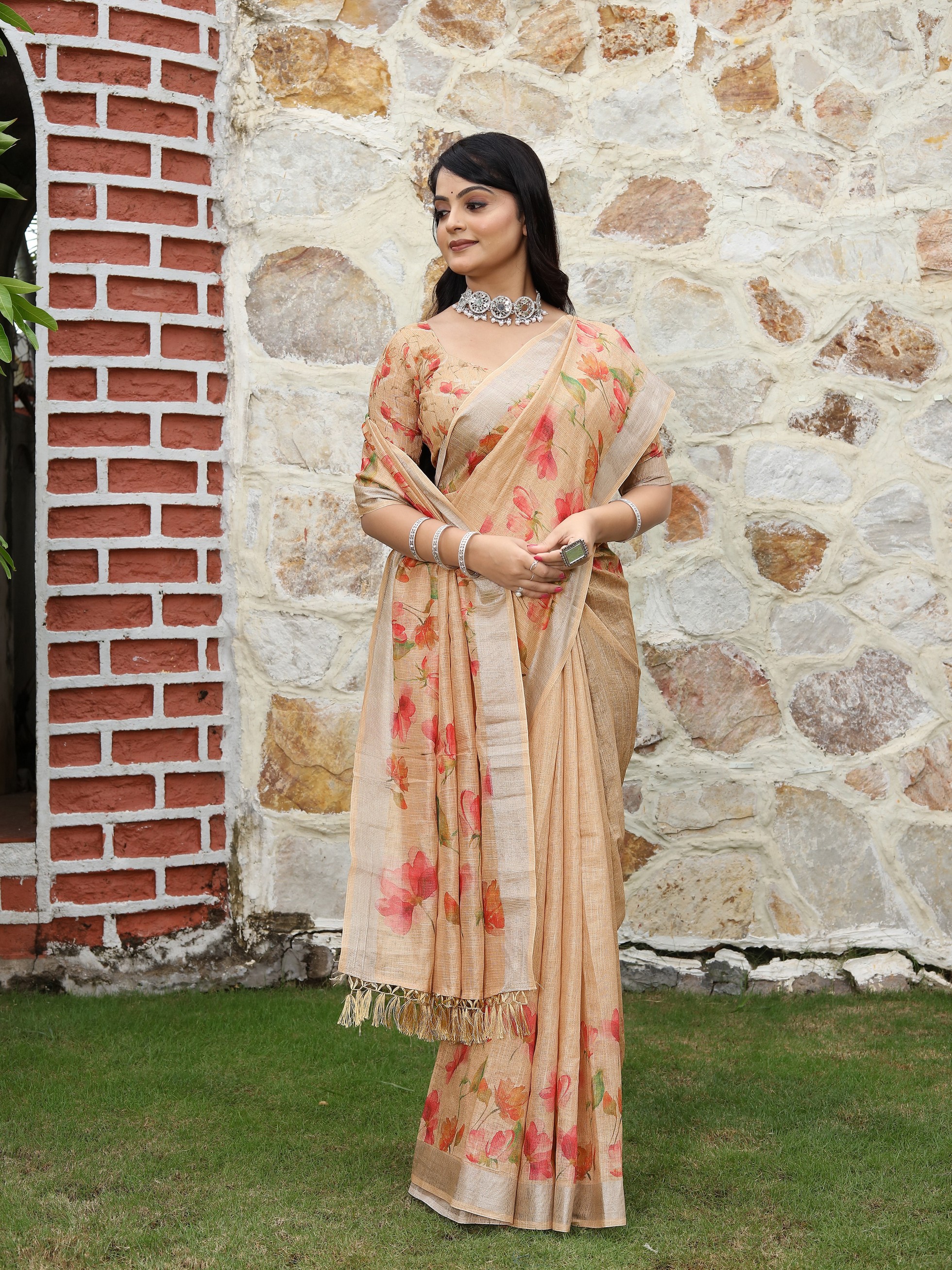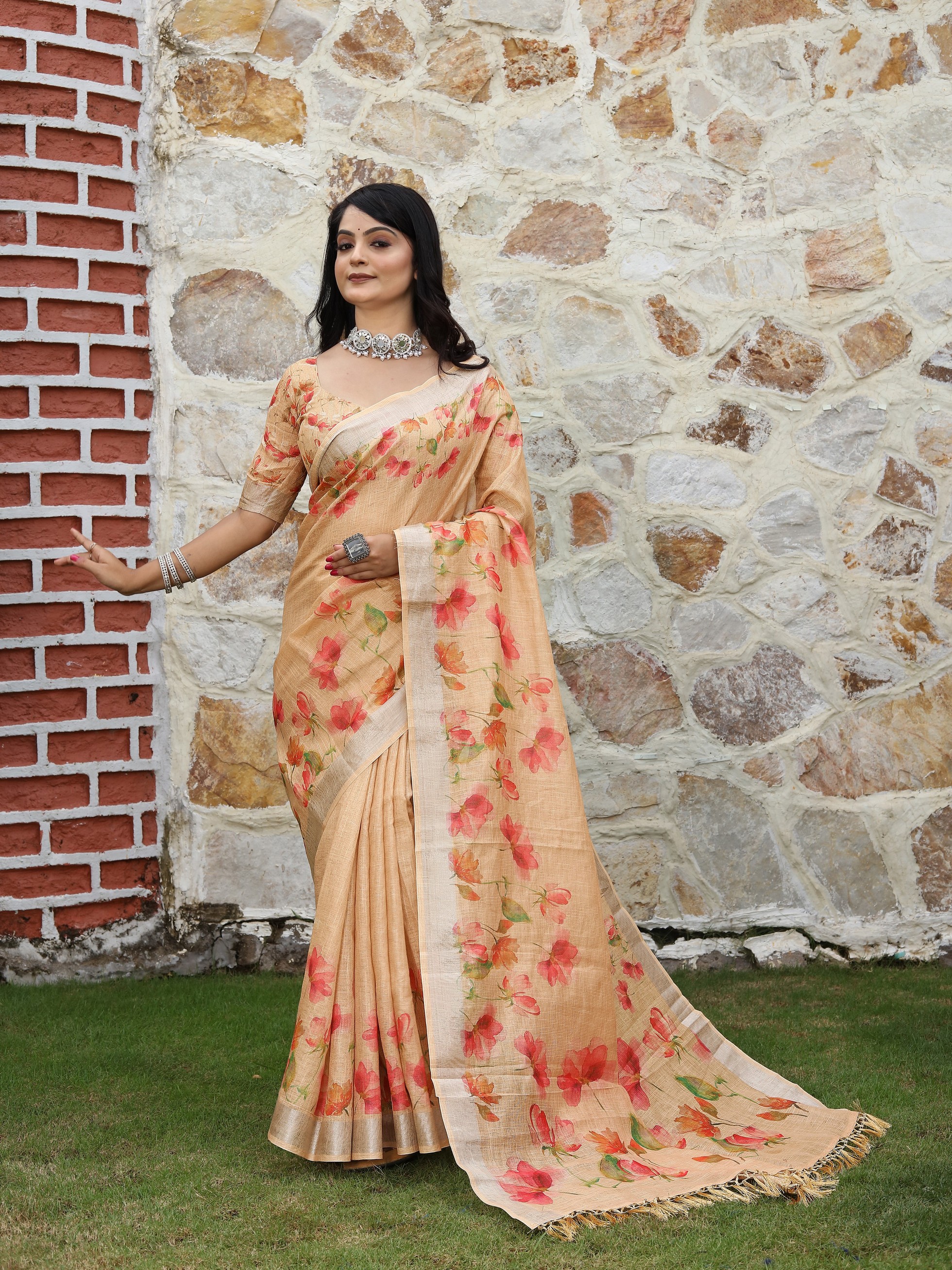 Peach Color Cotton Shimmer Fabric Smart Printed Saree With Woven Border