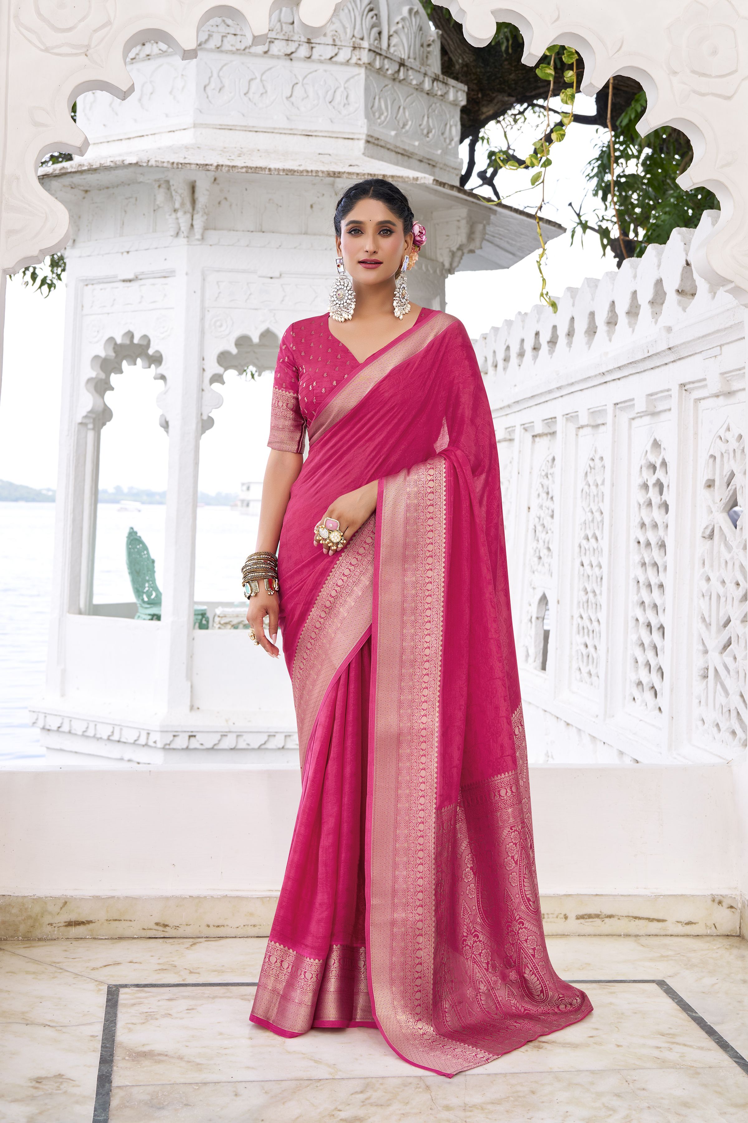 Pink Color Beautiful Chinon Fabric Woven Designer Saree For Trendy Girlie Looks