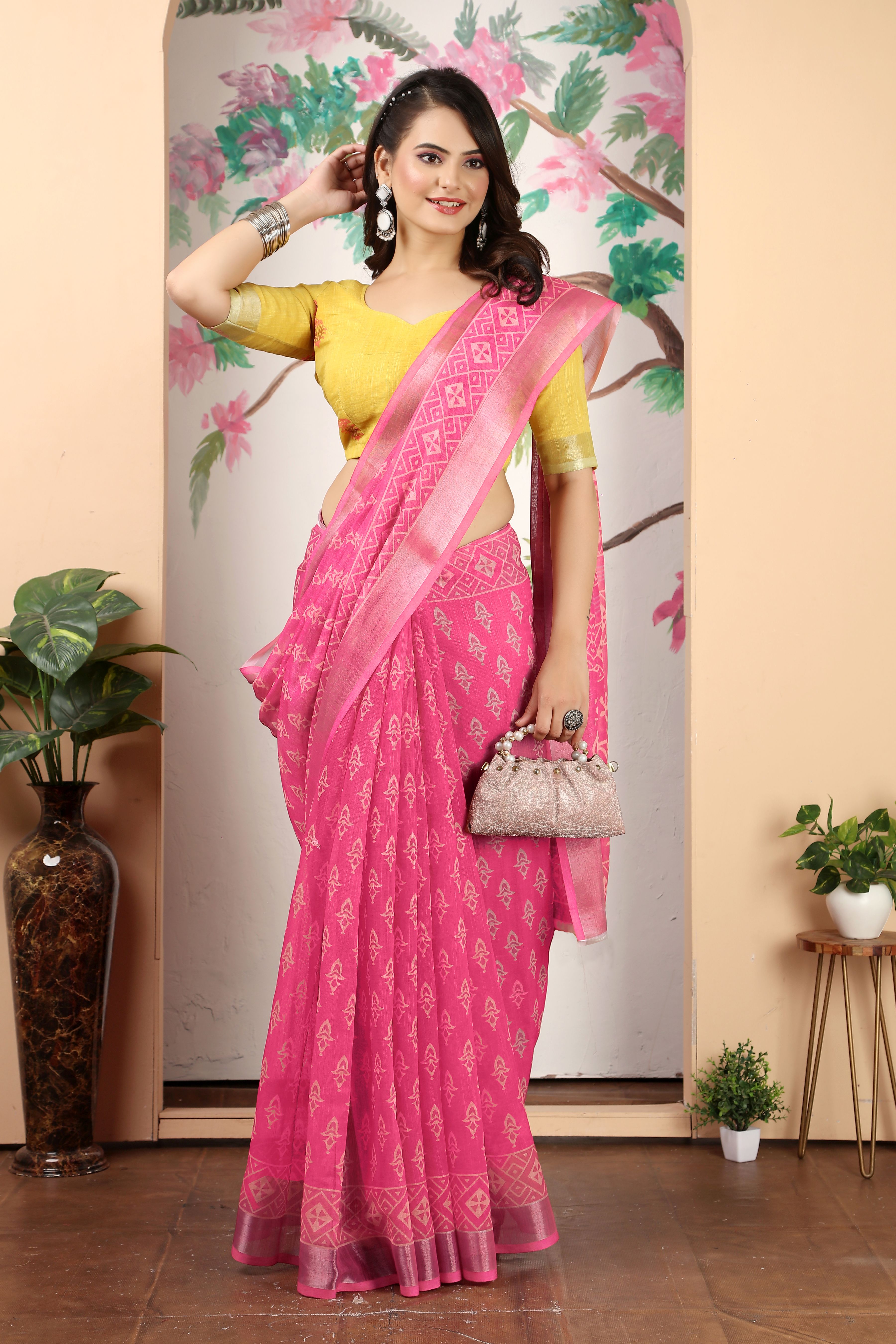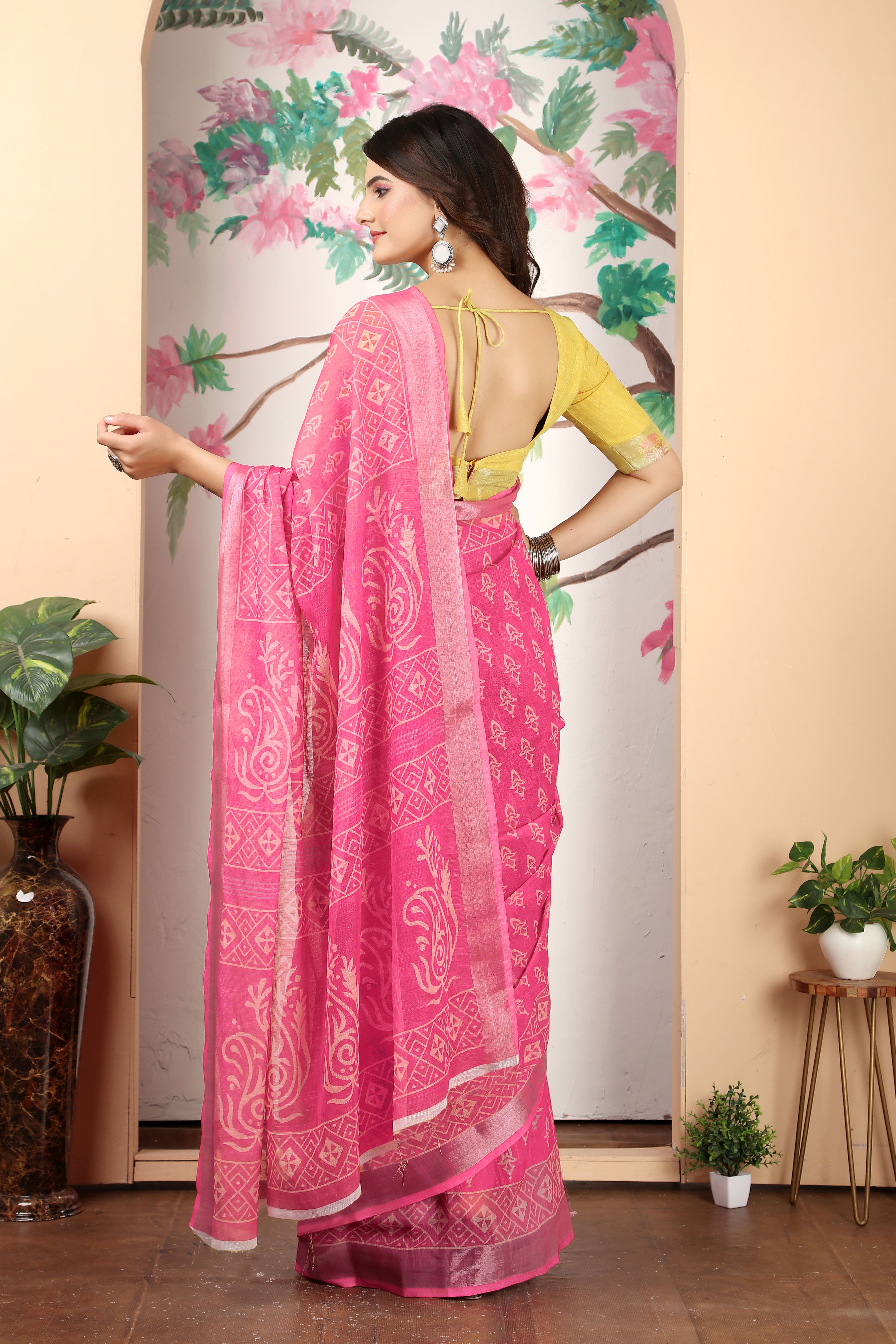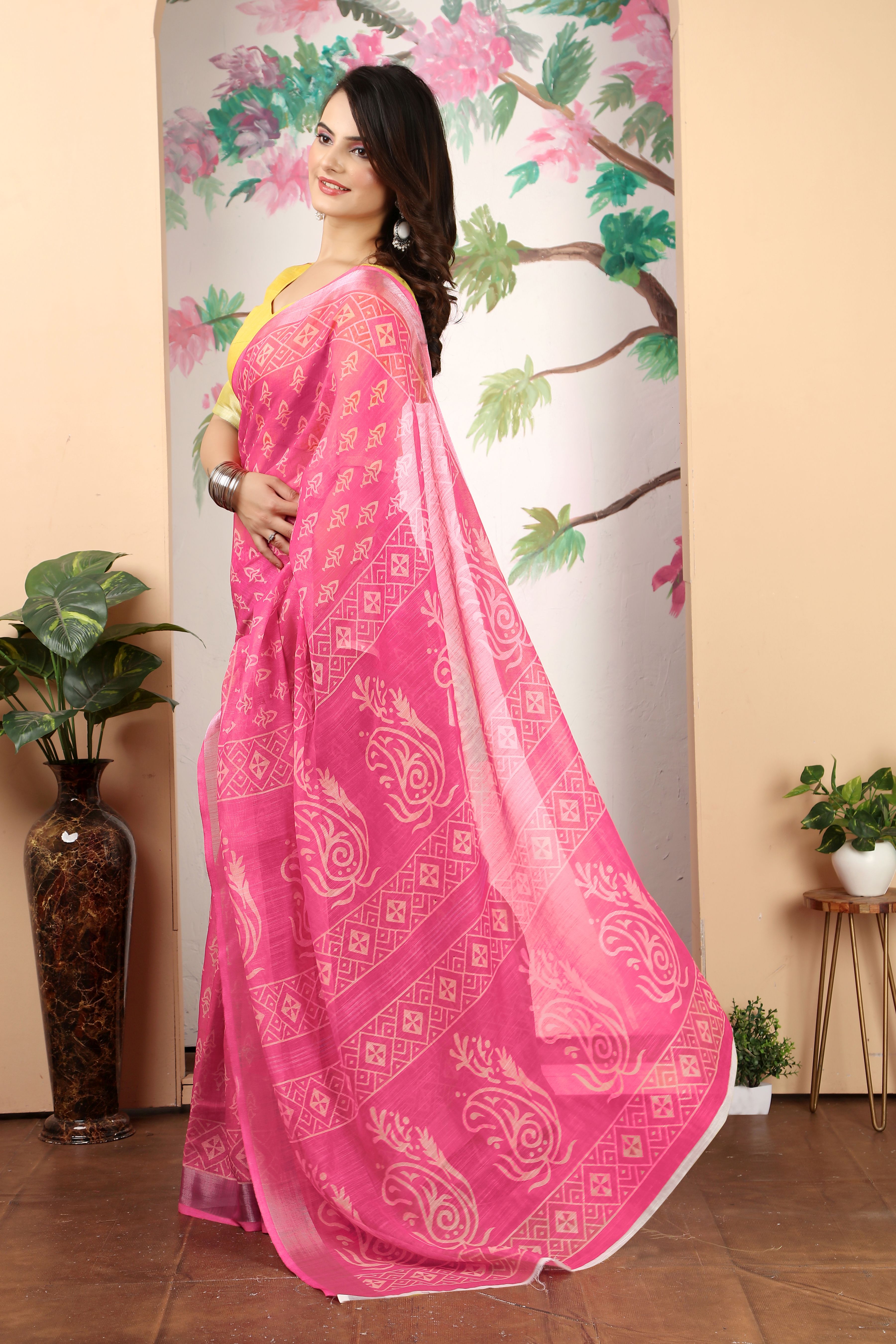 Pink Color Linen Cotton Fabric Beautiful Printed Saree