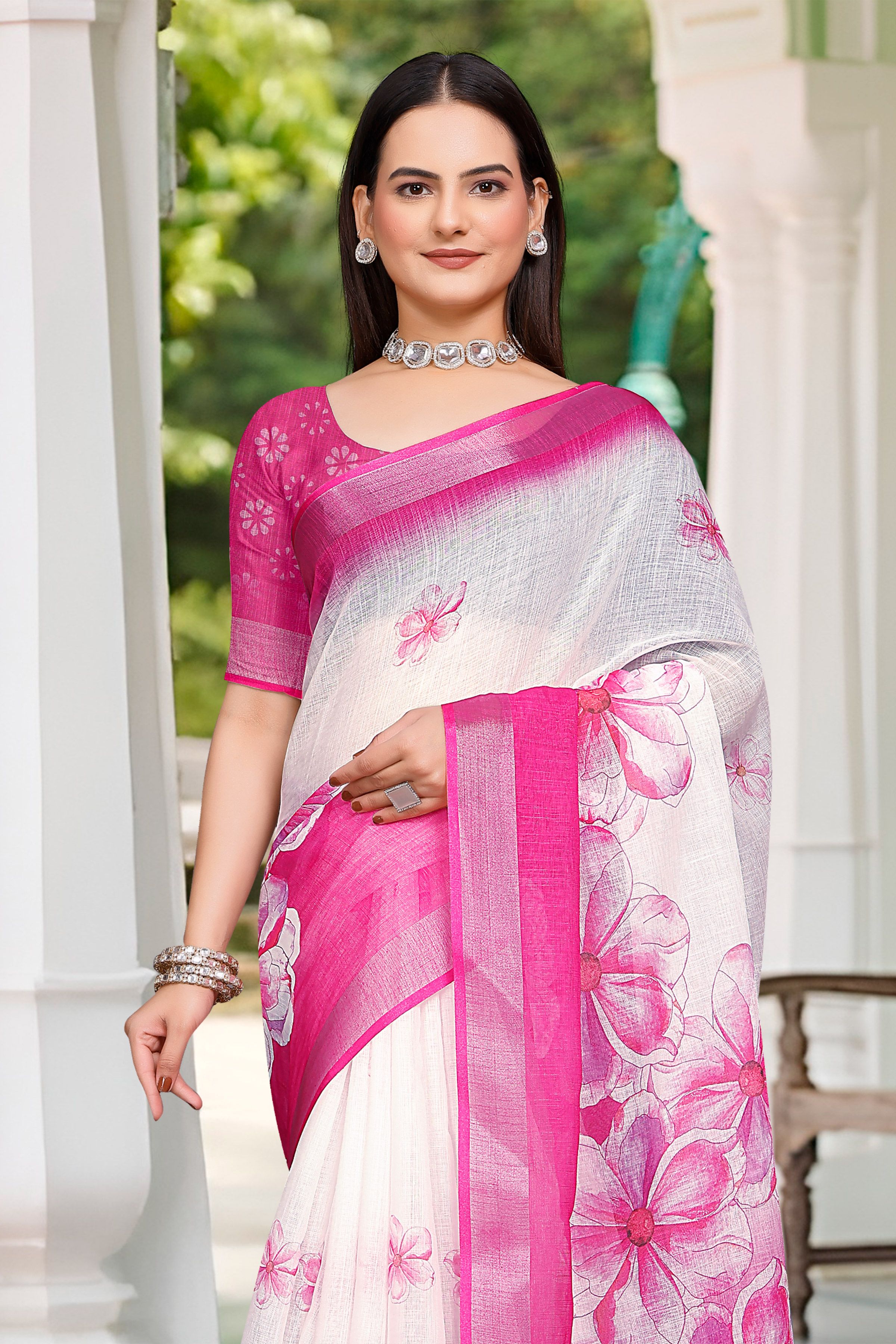 Look These Festive Saree in Fine Colored.These Saree Are Linen Cotton And Blouse is Fabricated On Linen Cotton Pair.Its Beautified With Woven Jari Border With Designer Digital Printed.