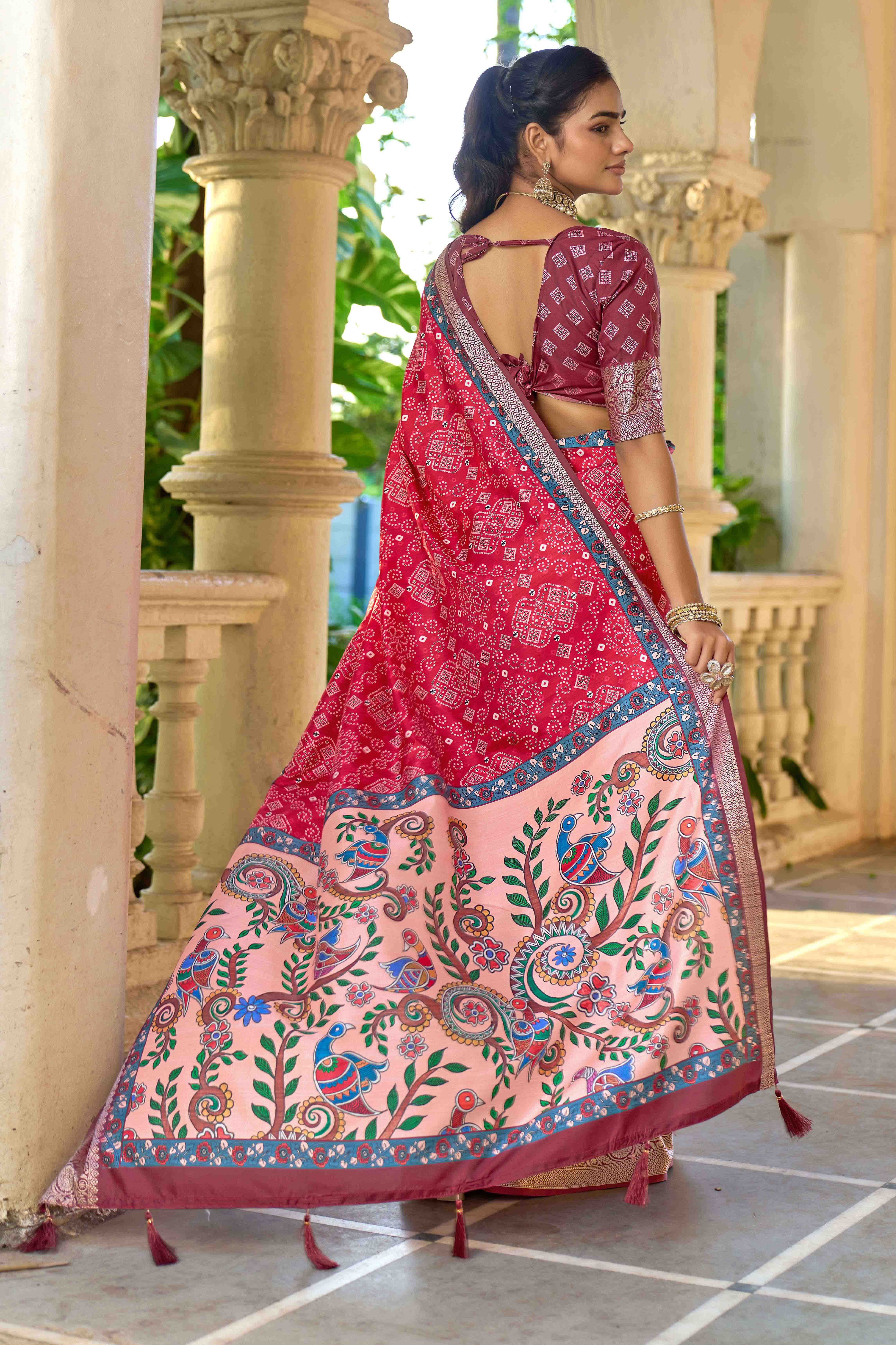 Pink Color Silk Blended Traditional Bandhani Ajrakh Printed Saree