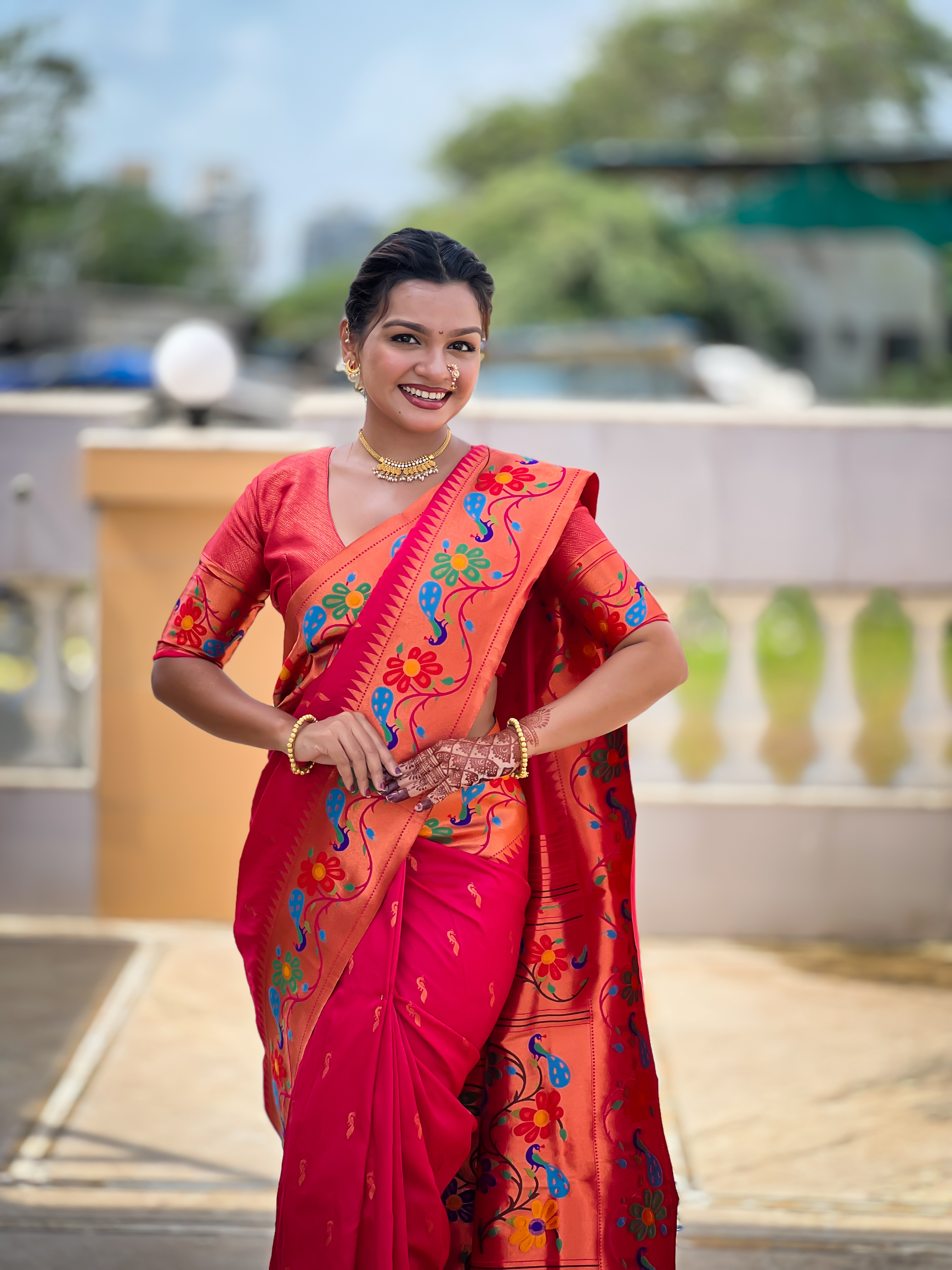 Pink Color Woven Meenakari Jacquard Designer Paithani Silk Fabric Ethnic Saree