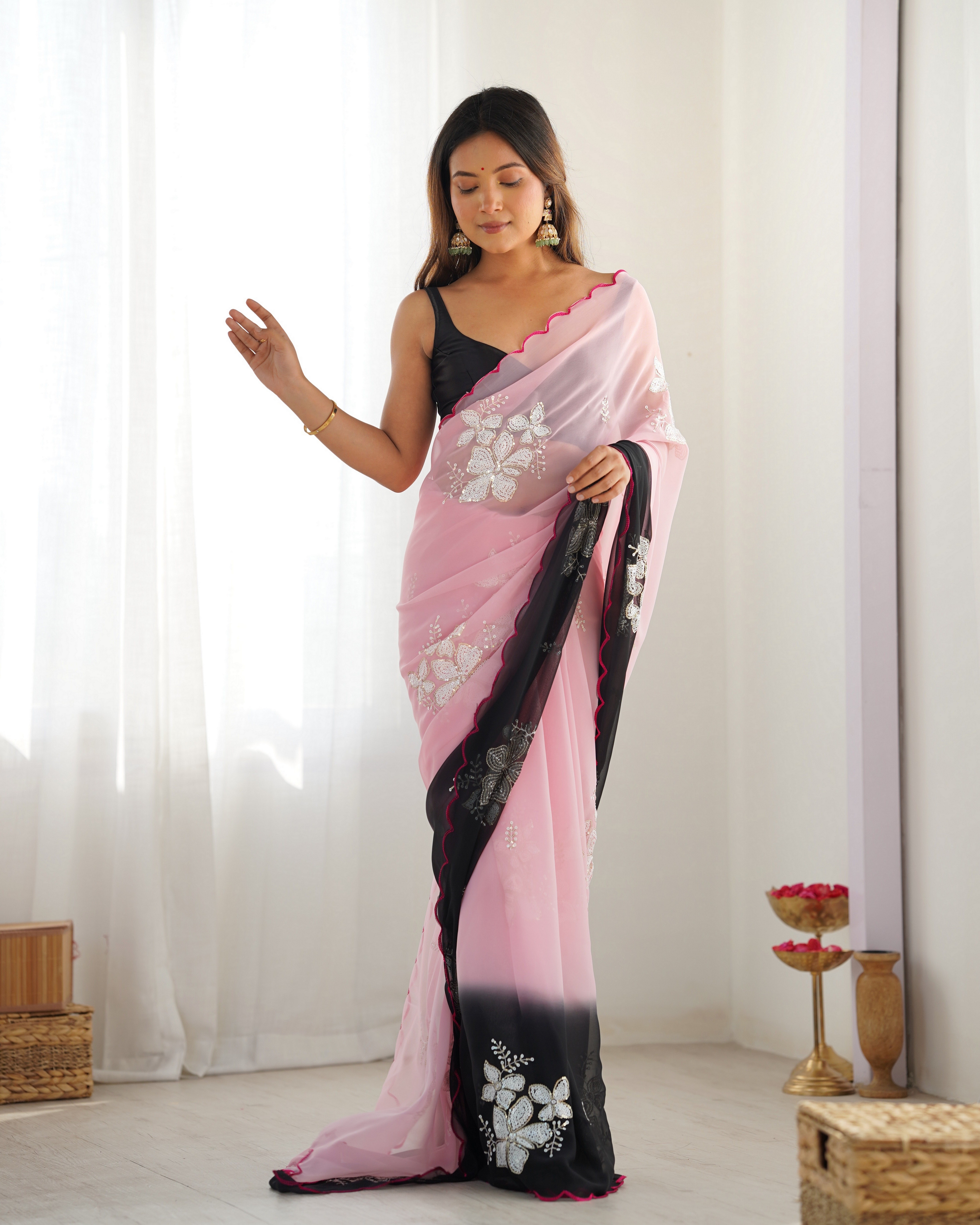 Pink Padding Color Georgette Fabric Sequins Embroidered Saree