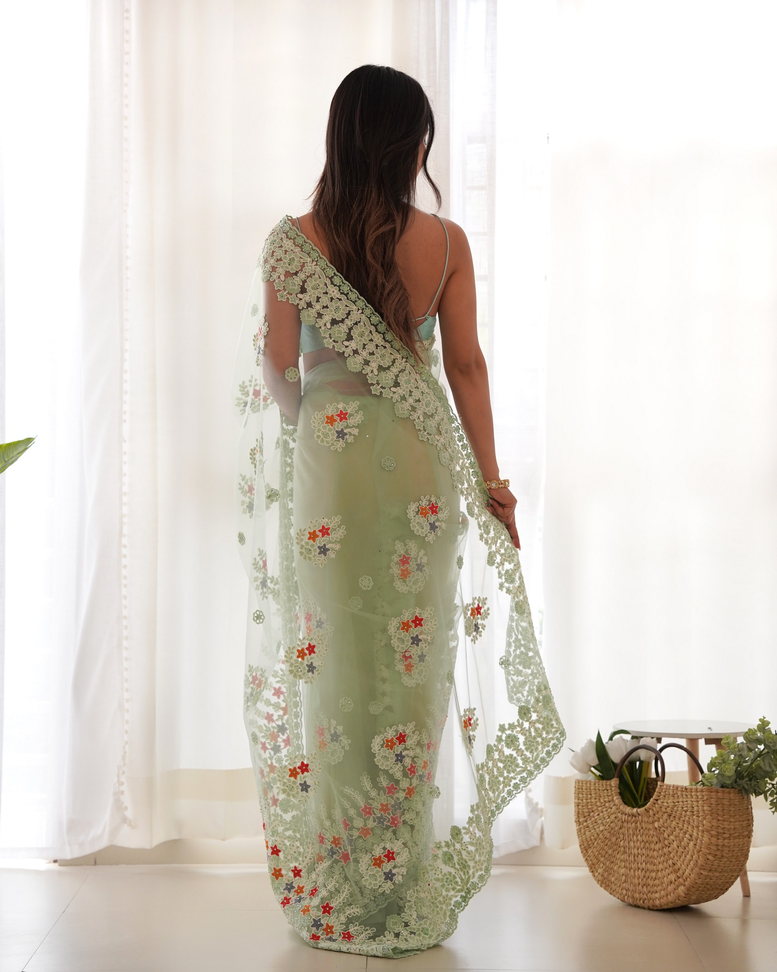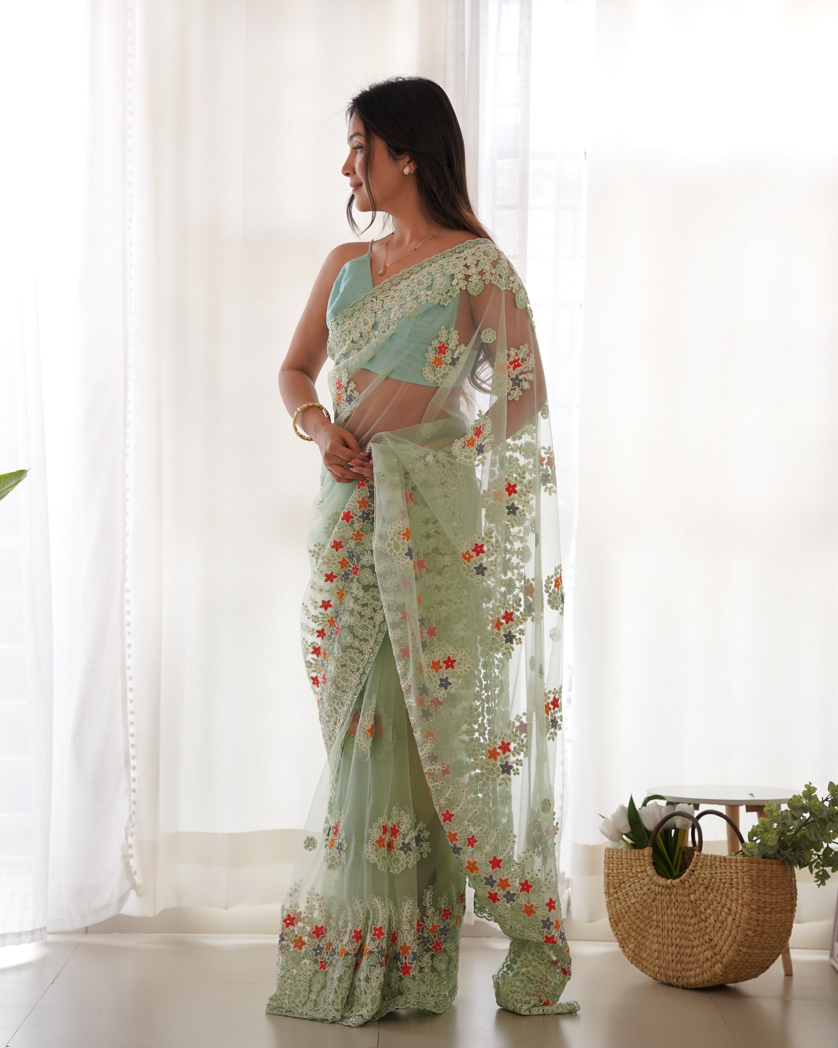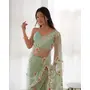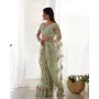 Pista Color Butterfly Net Fabric Designer Thread Embroidery Work Ceremonial Saree