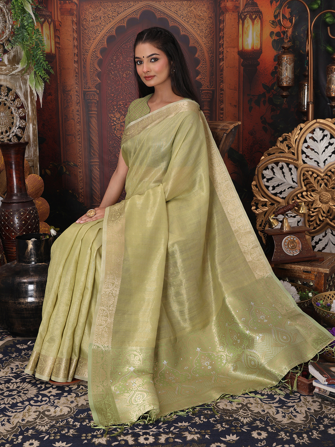 Pista Color Organza Fabric Woven Designer Trendy Ethnic Saree