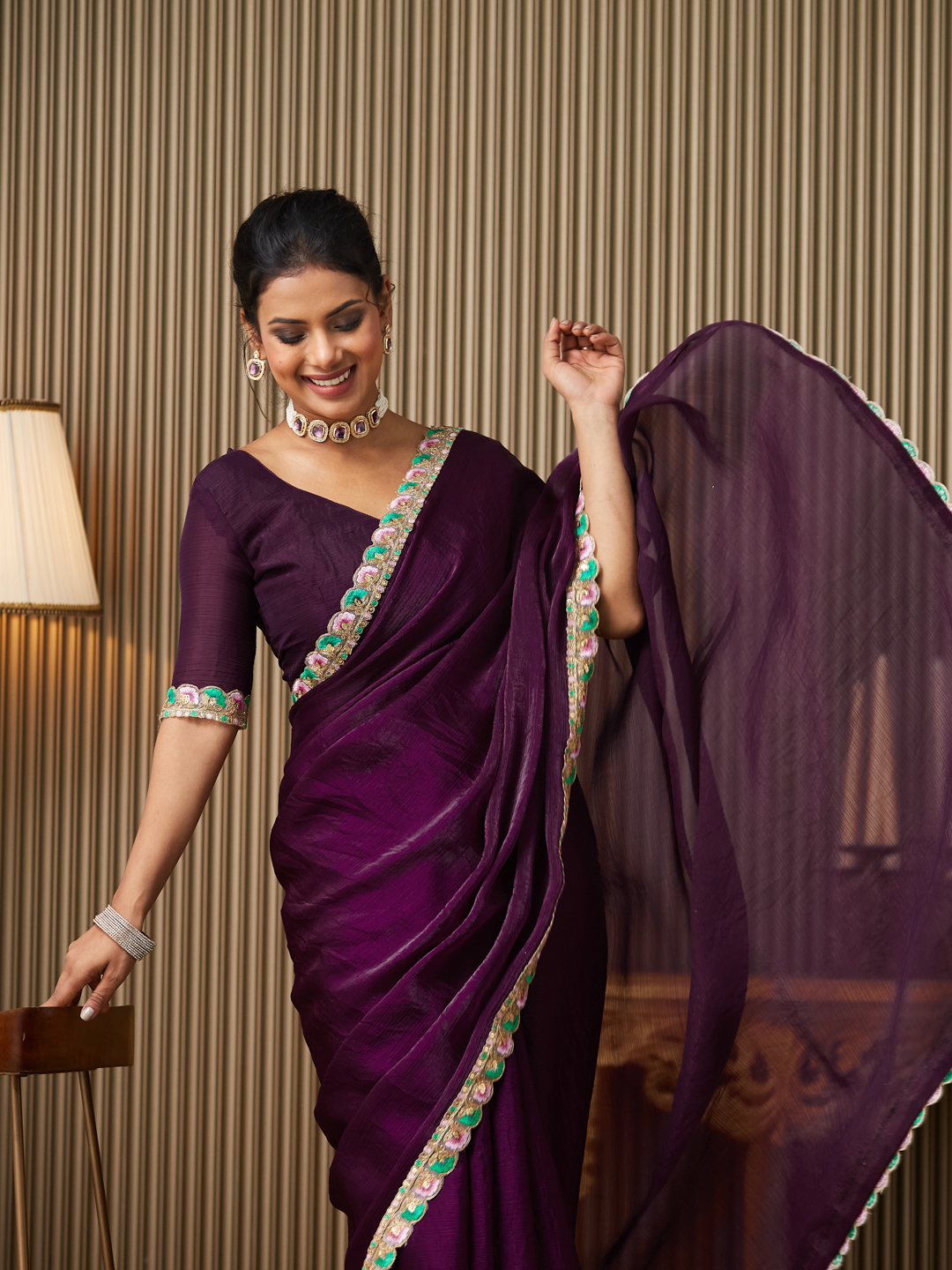 Purple Color Chiffon fabric Embellished Designer Ceremonial Saree