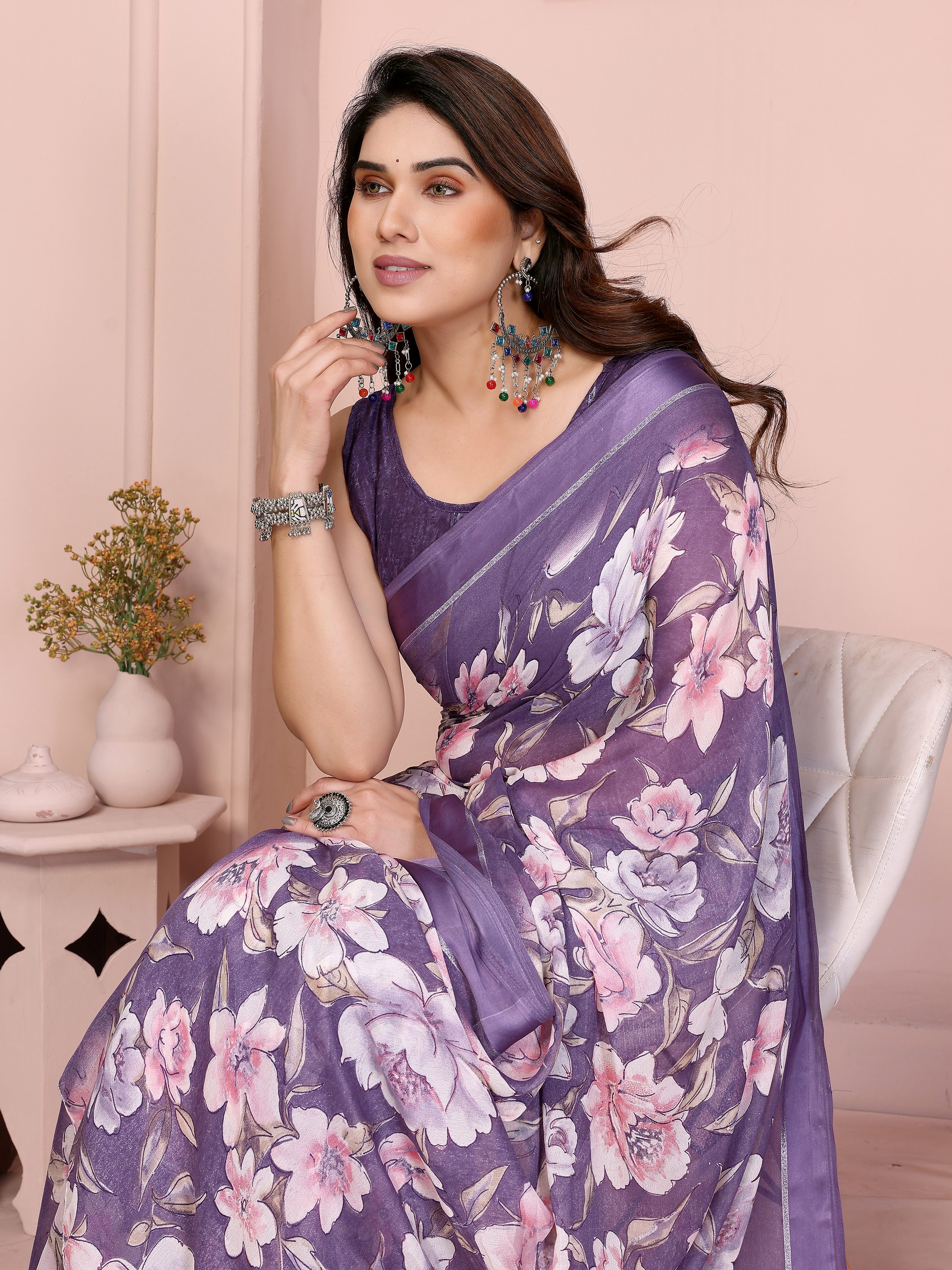 Purple Color Moss Satin Patta Woven Patta Designer Printed Fancy Saree