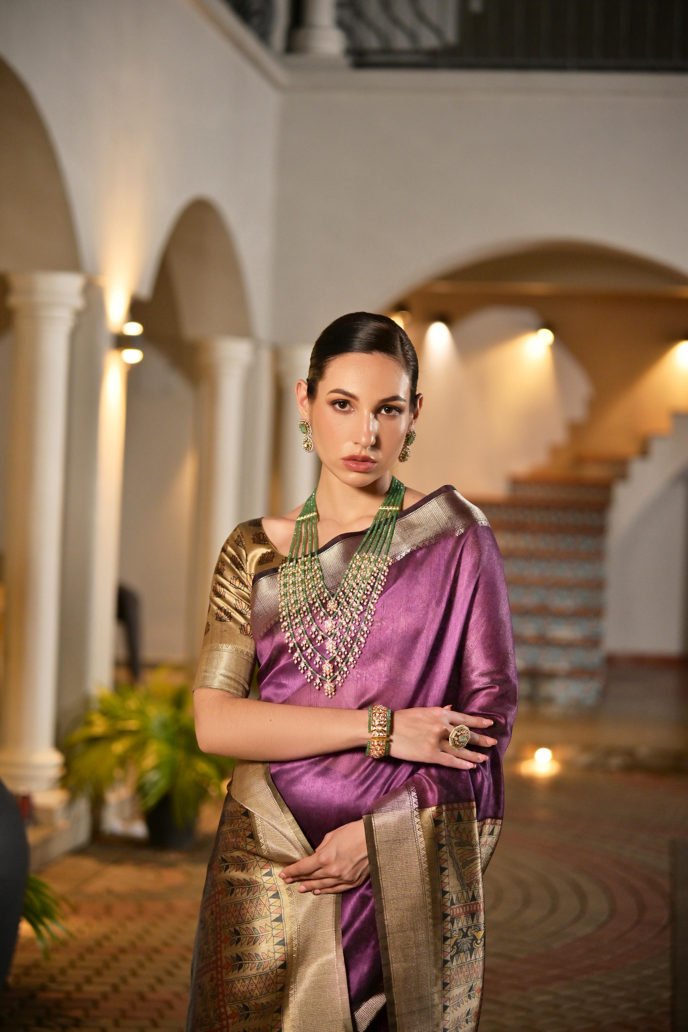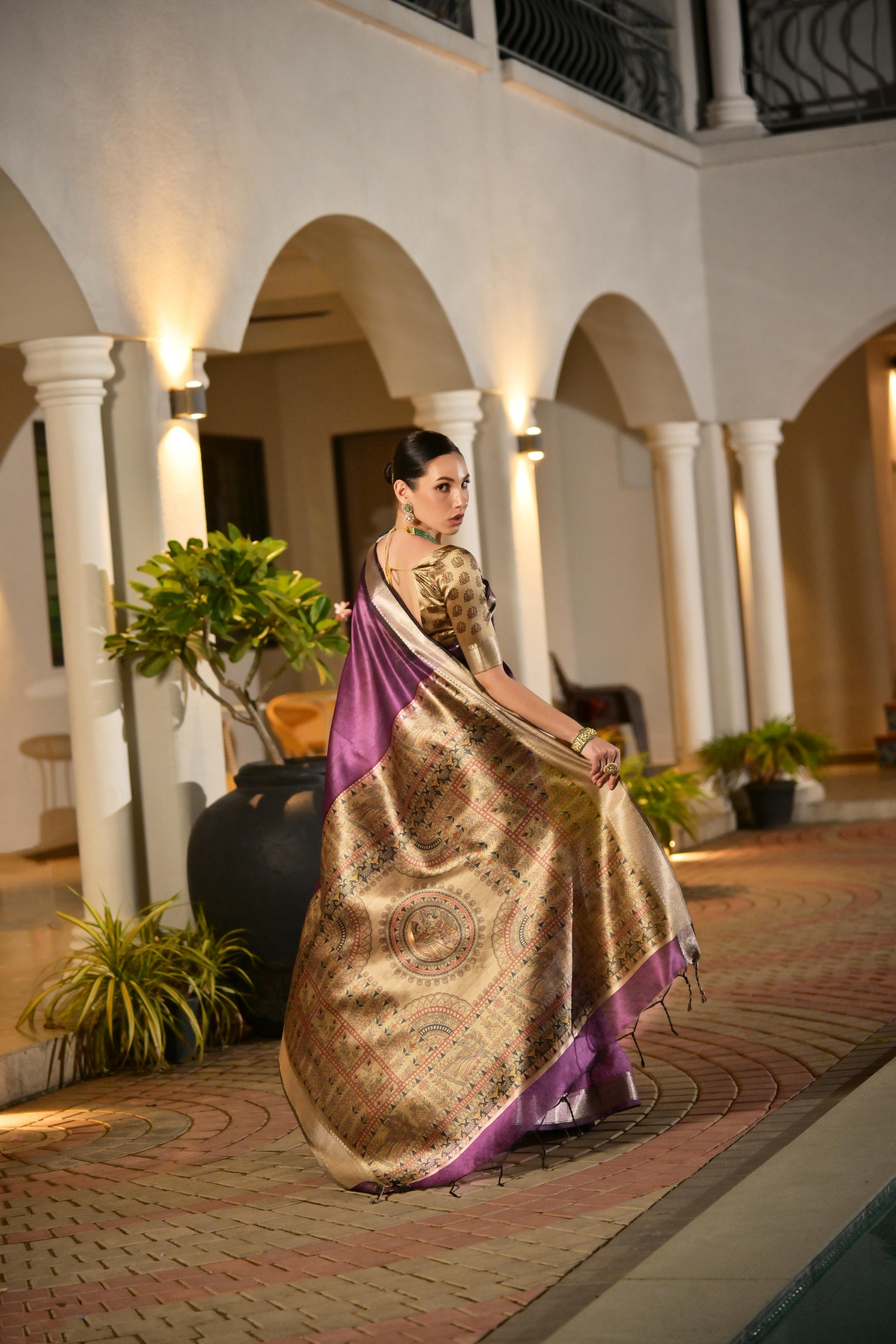 Purple Color Smart Khadi Raw Silk Saree With Graceful Madhubani Style Print