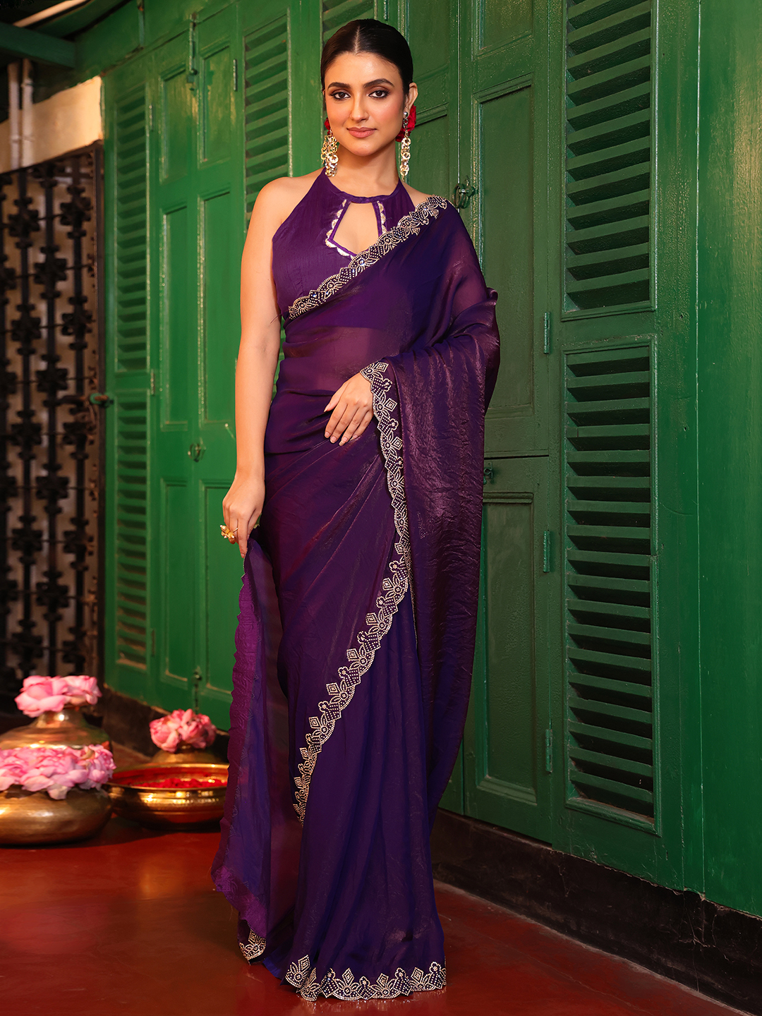 Purple Color Tissue Fabric Fancy Designer Swarovski Work Ethnic Girlie Saree