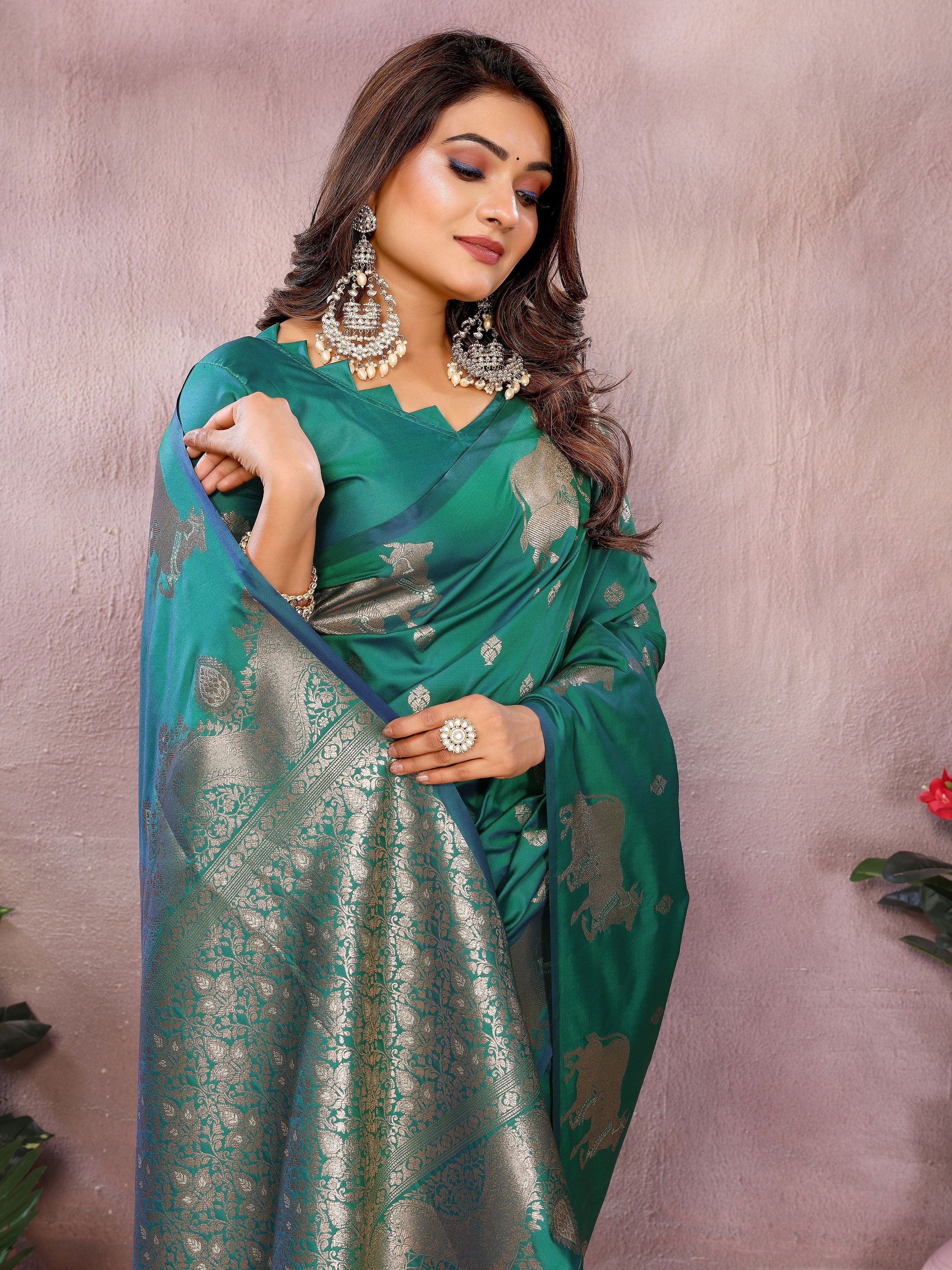 Rama Color Banarasi Silk fabric Jacquard Weaving Designer Ceremonial Saree