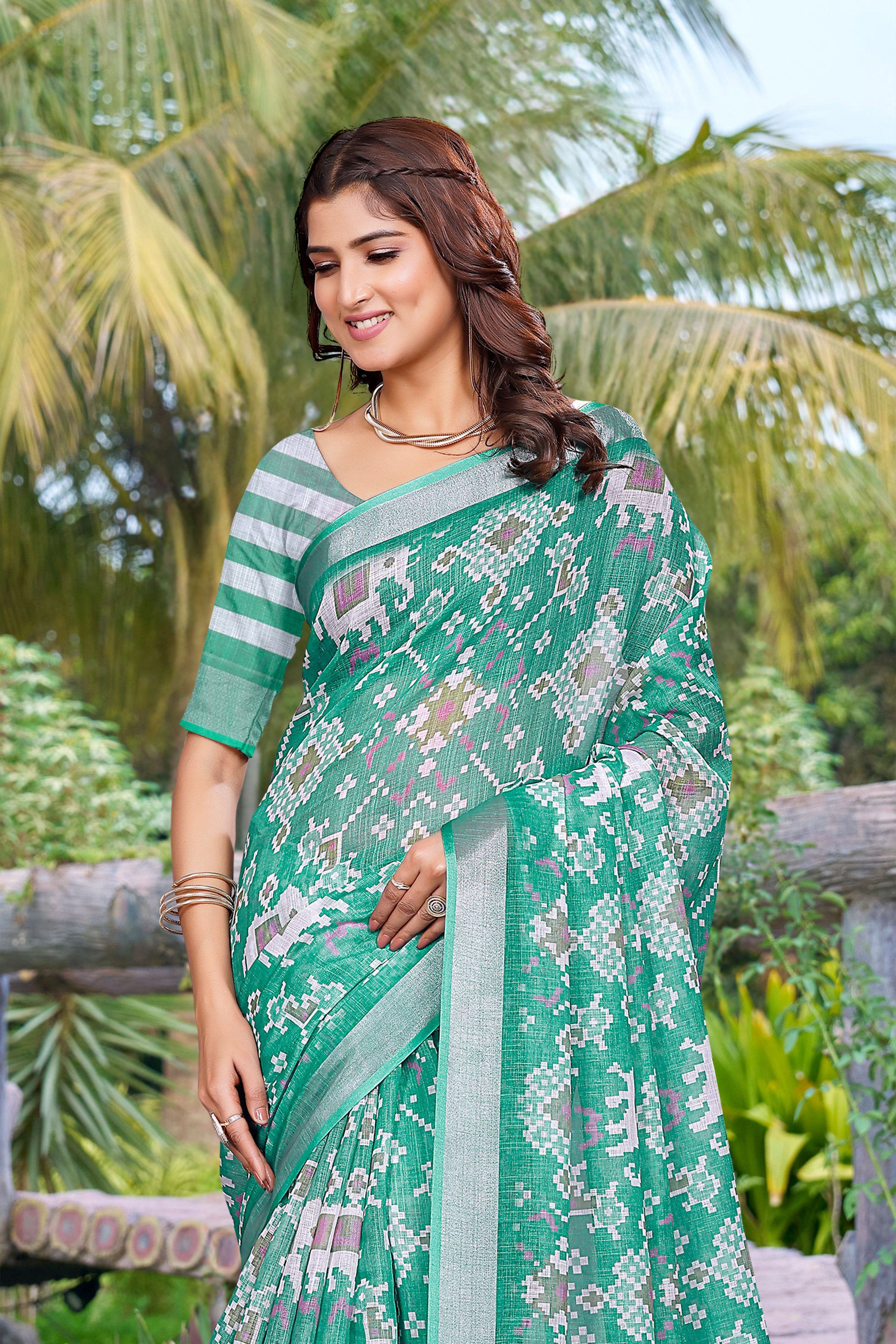 Rama Color Linen Cotton Saree With Smart Partywear Printed Looks