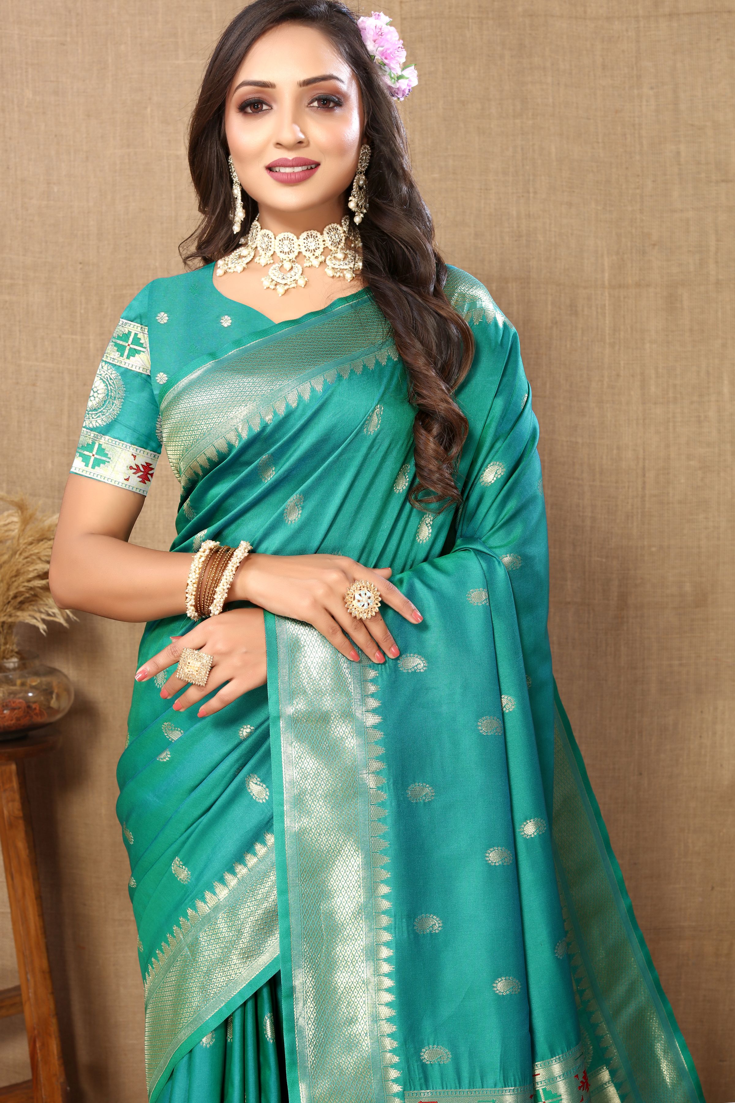 Rama Color Paithani Silk Woven Meenakari Jacquard Designer Traditional Rich Ethnic Saree
