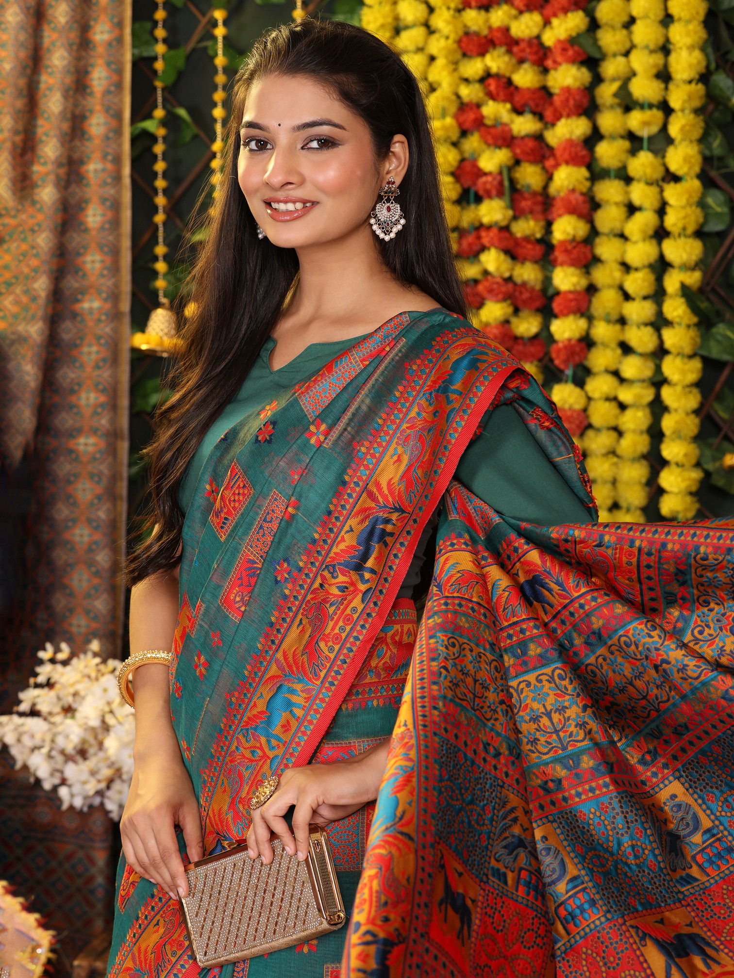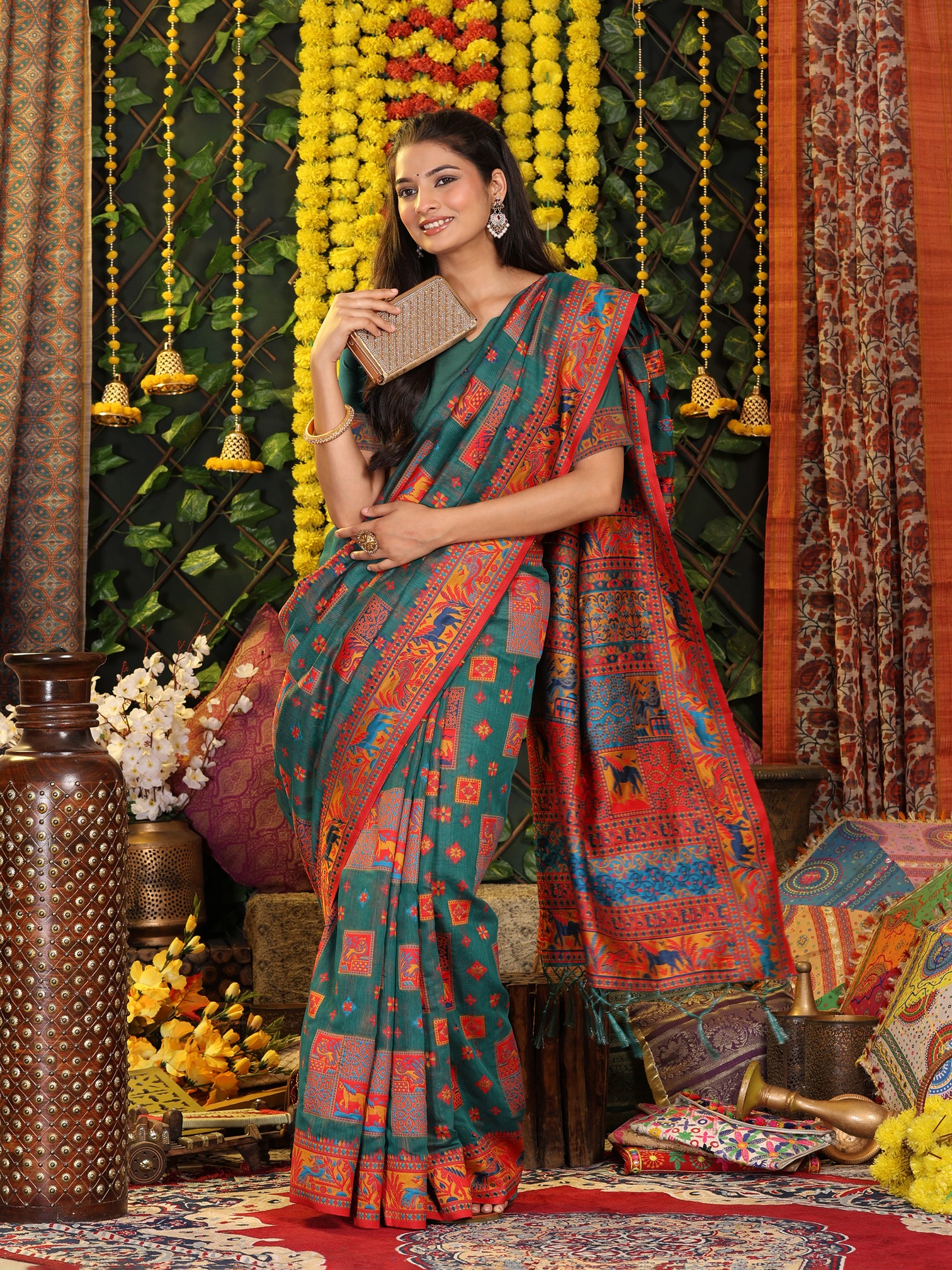 Rama Green Color Linen Cotton Fabric Resham Woven Designer Partywear Saree