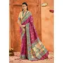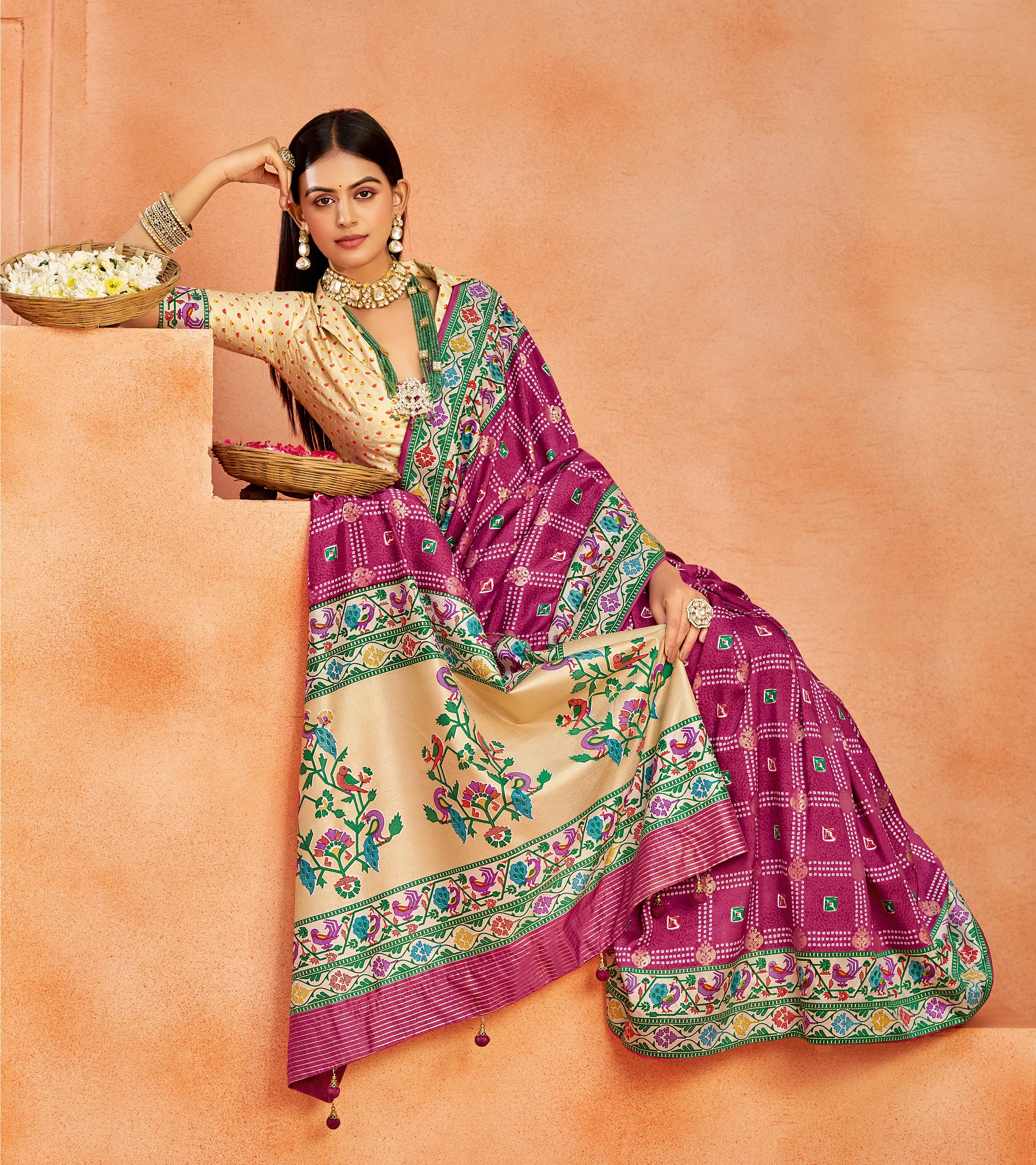 Rani Pink Color Velvet Tussar Silk Fabric Partywear Saree With Paithani Pallu And Traditional Ghatchola Print