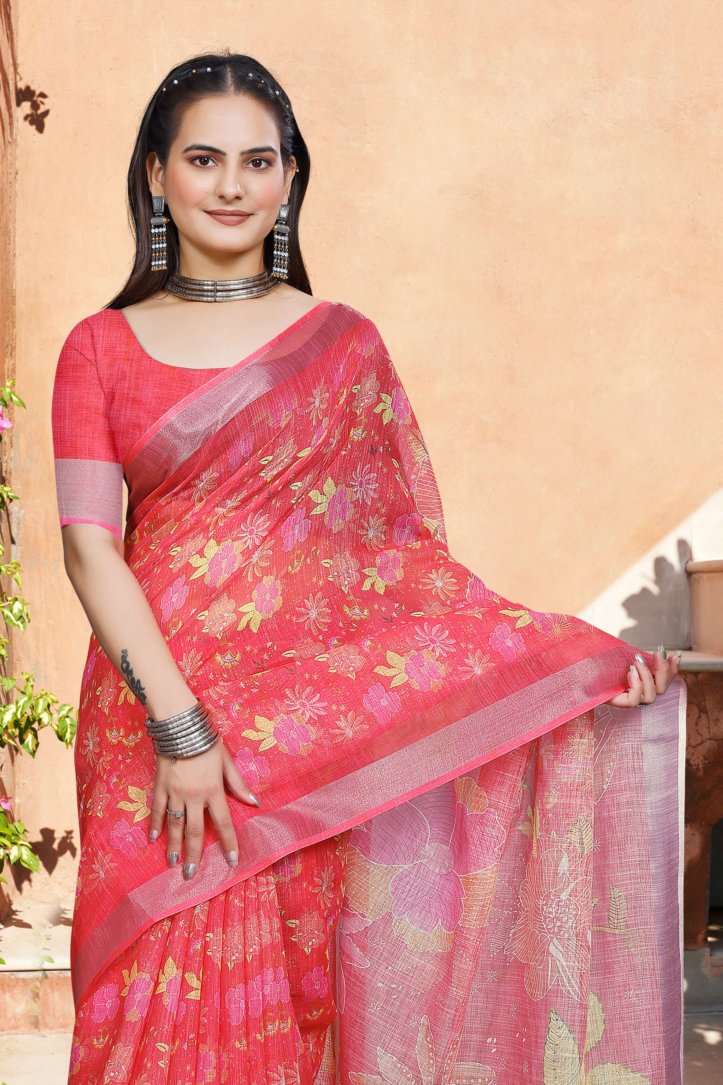 Red Color Linen Cotton Fabric Woven Border Designer Printed Saree