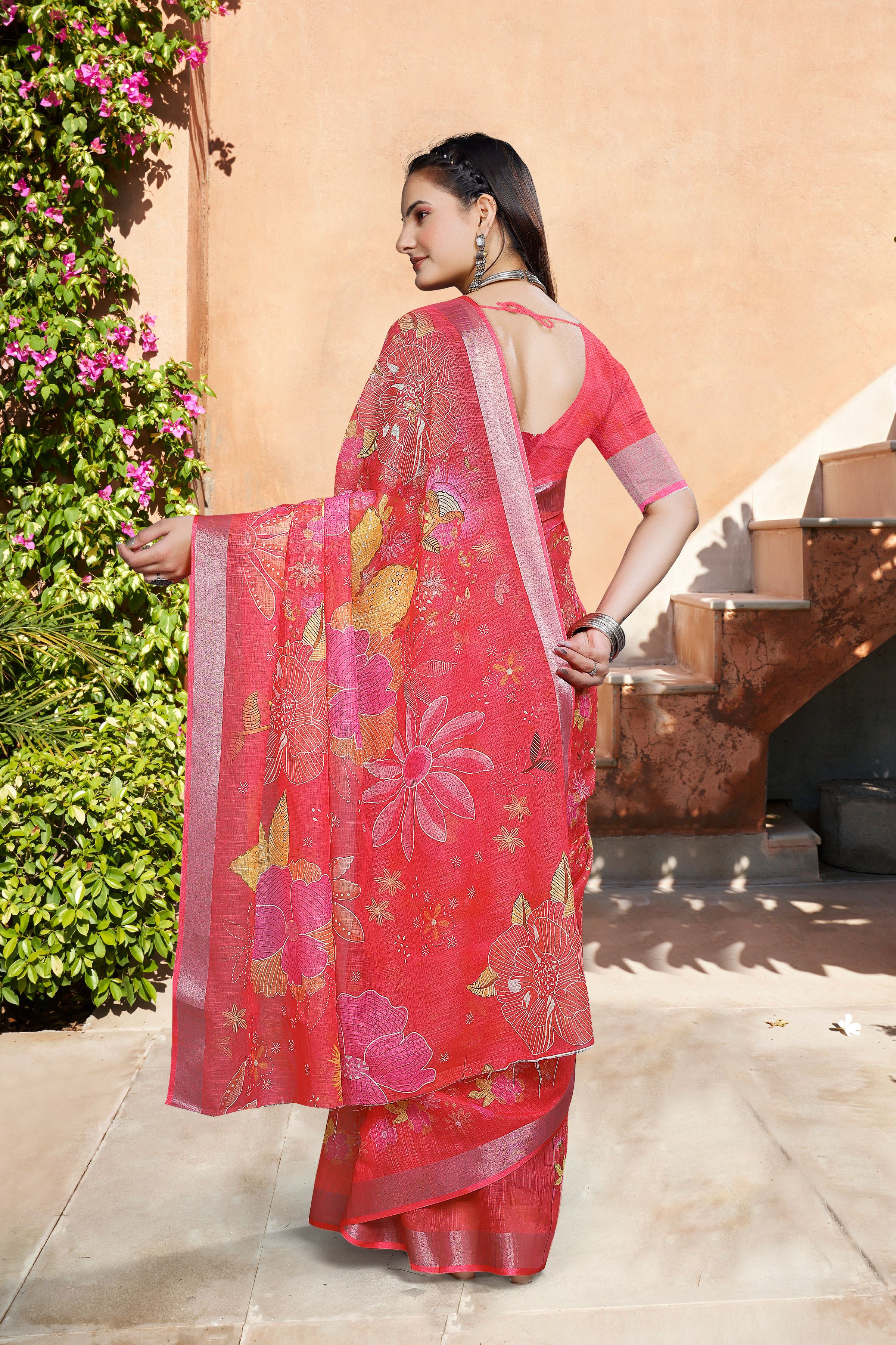 Look These Festive Saree in Fine Colored.These Saree Are Linen Cotton And Blouse is Fabricated On Linen Cotton Pair.Its Beautified With Woven Jari Border With Designer Digital Printed.