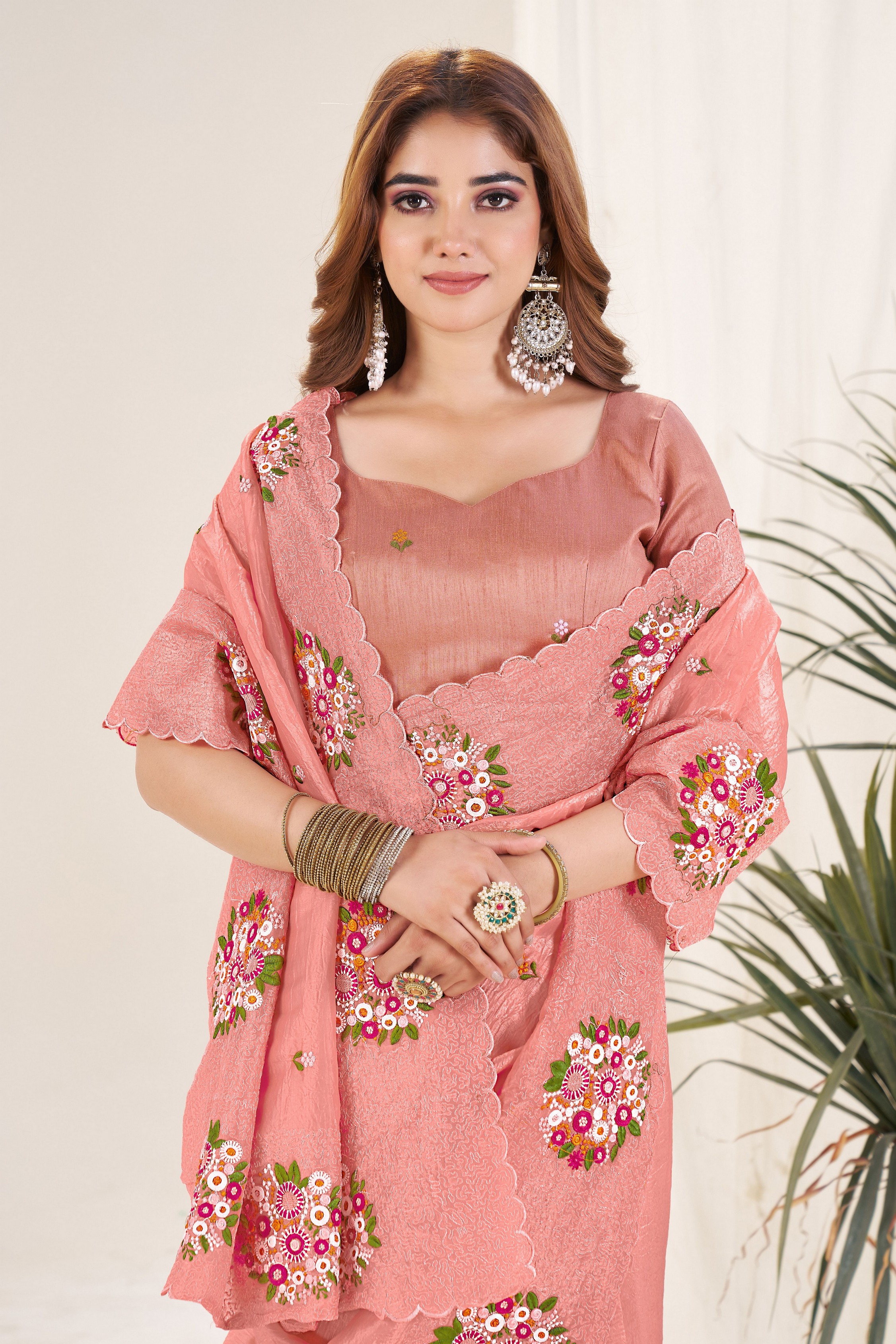 Rust Color Gold Crush Fabric Designer Embroidered Saree