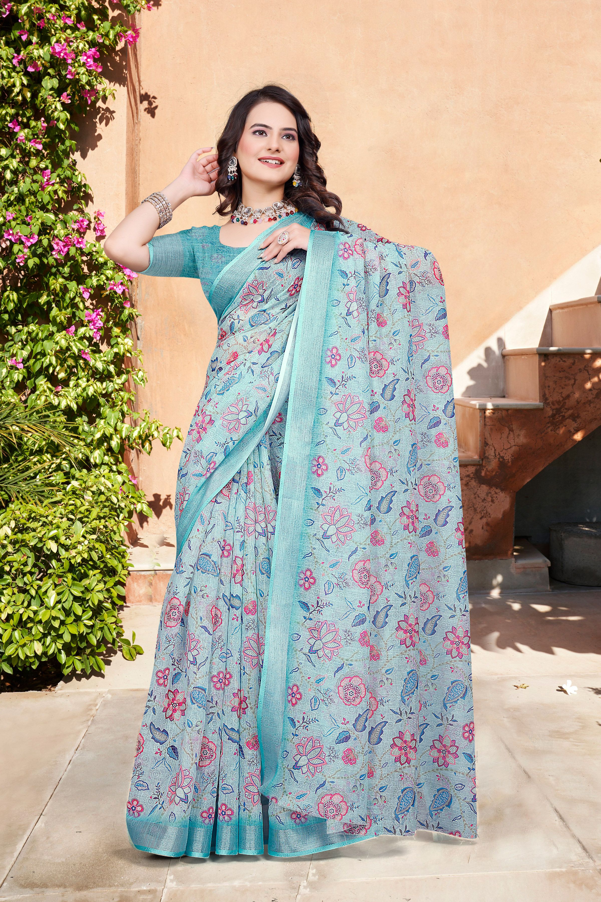 Attractive These Festive Saree in Fine Colored.These Saree Are Linen Cotton And Blouse is Fabricated On Linen Cotton Pair.Its Beautified With Woven Jari Border With Designer Digital Printed.