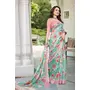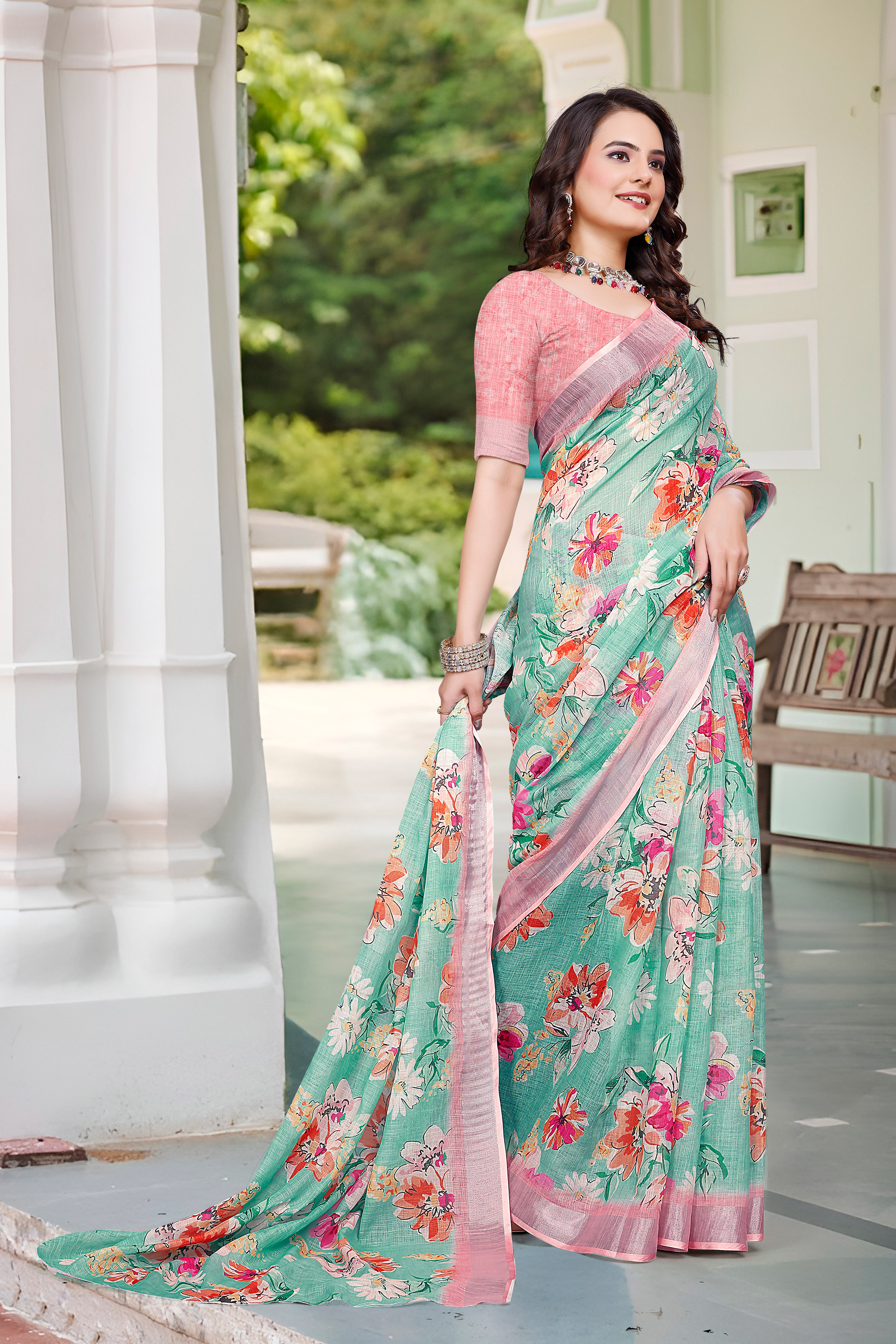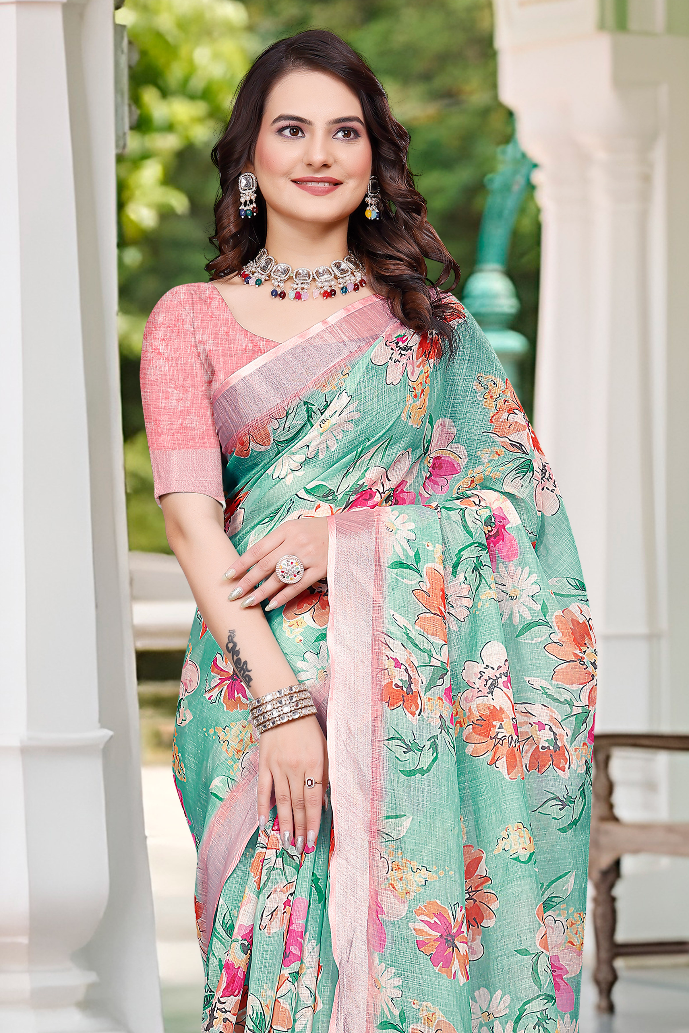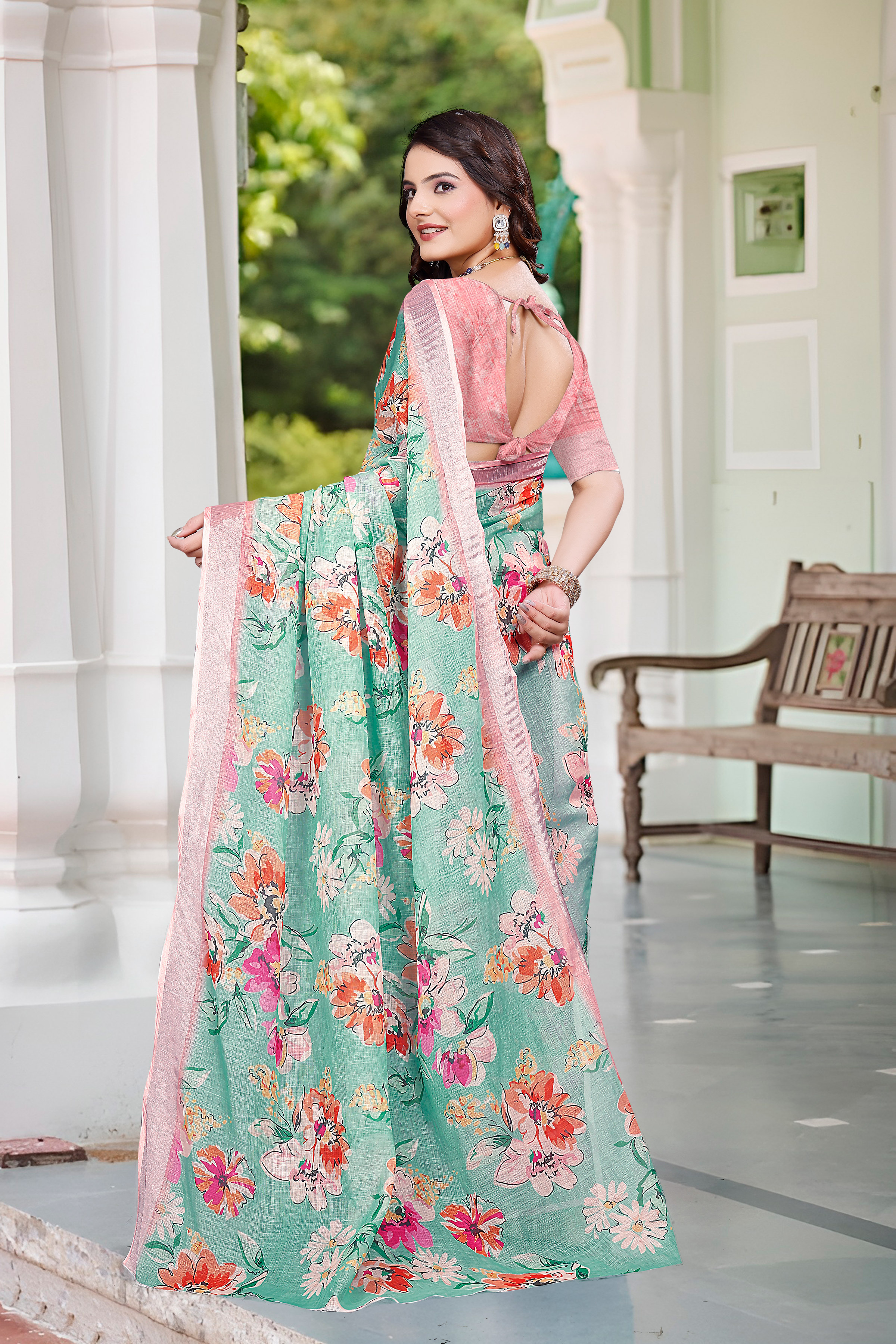 Sea Green Color Linen Cotton Saree With Smart Partywear Printed Looks