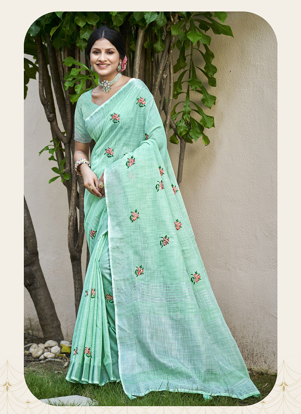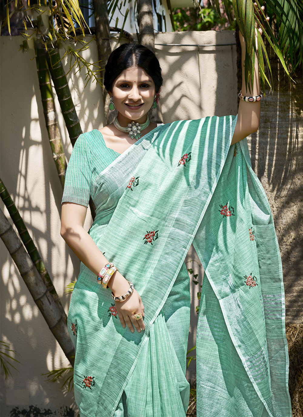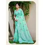 Sea Green Color Linen Fabric Beautifully Embroidered Ethnic Saree
