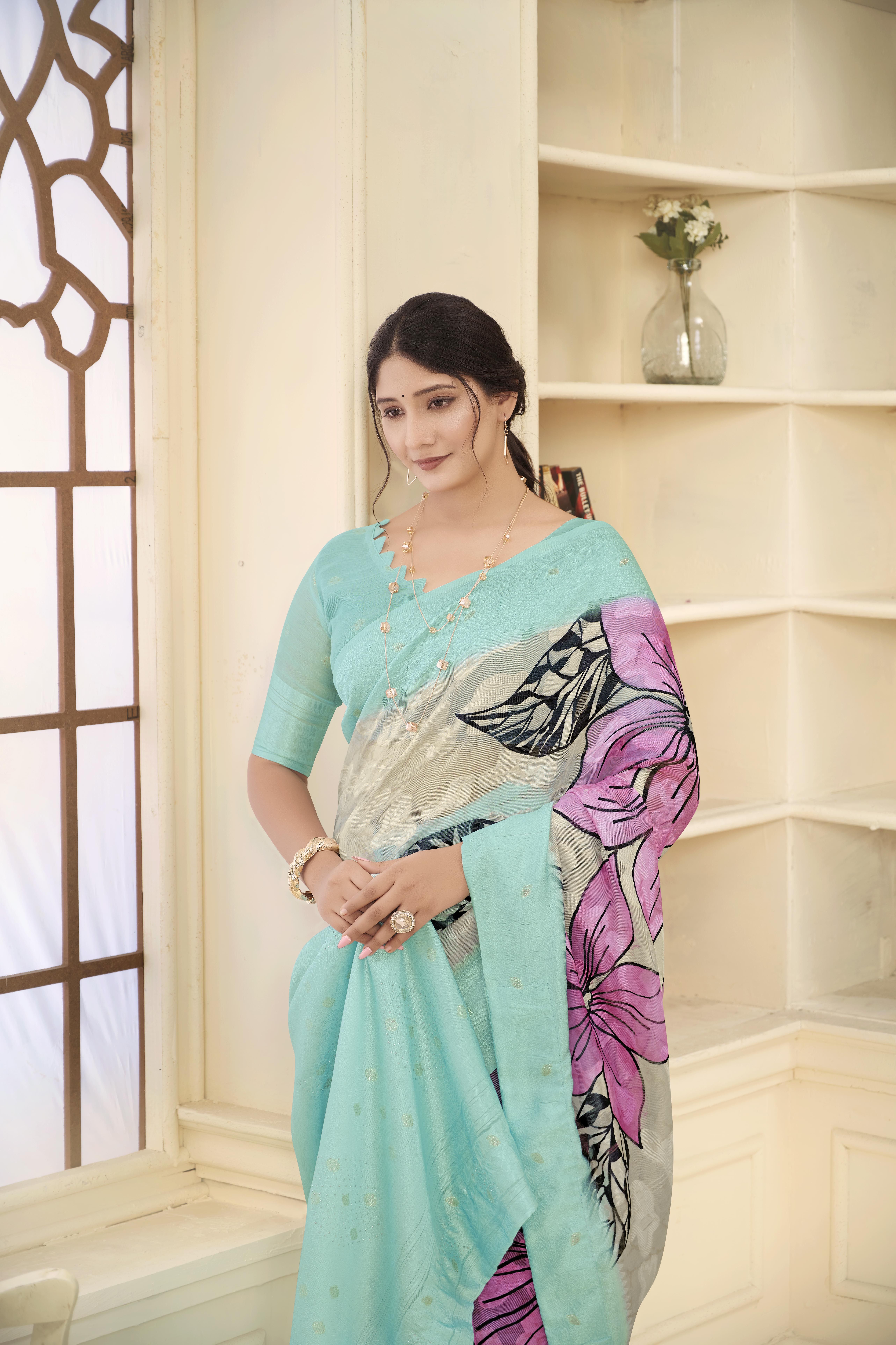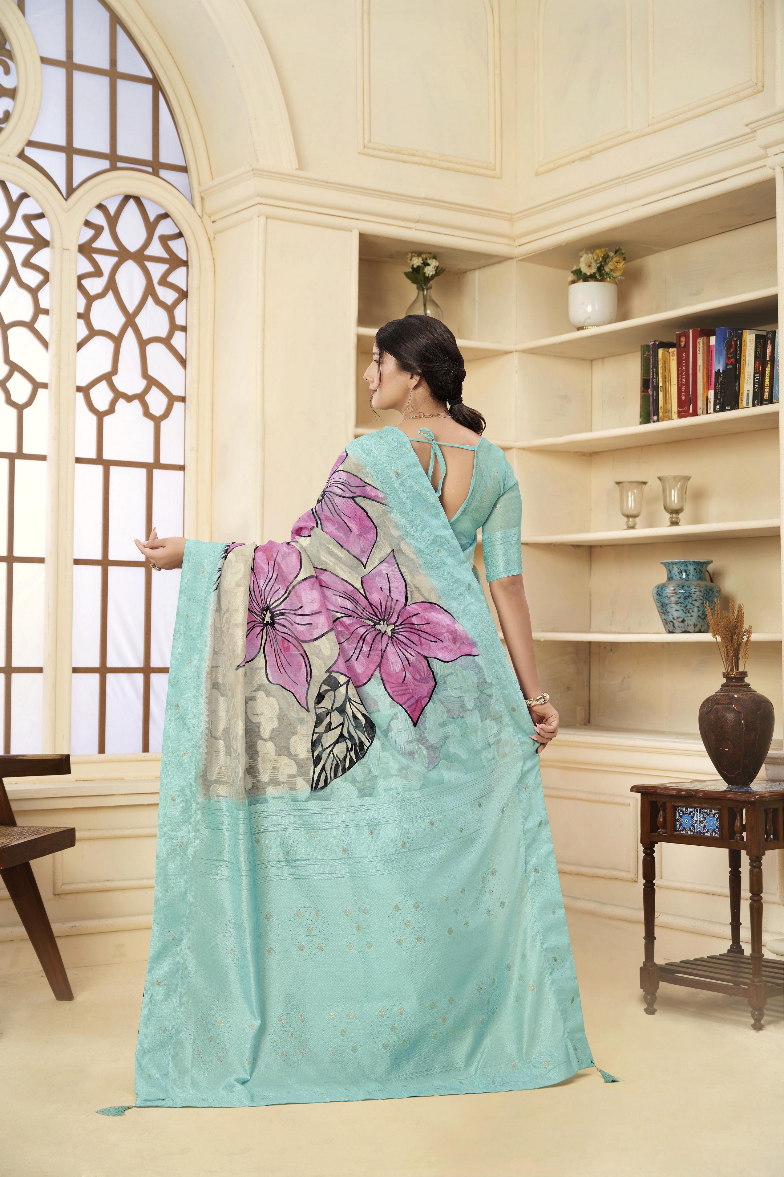 Sea Green Color Wevon Jacquard Designer With Printed Rich Silk Fabric Stylish Ceremonial Saree